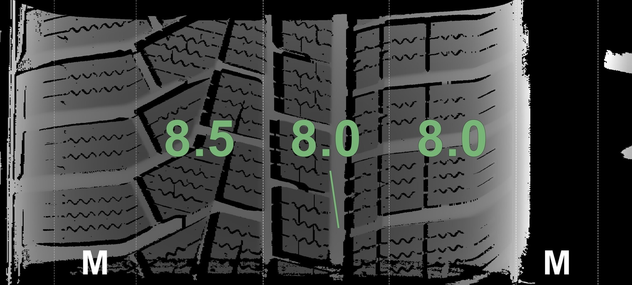 De gemeten profieldieptes en de details van de velgen zijn hierboven weergegeven.