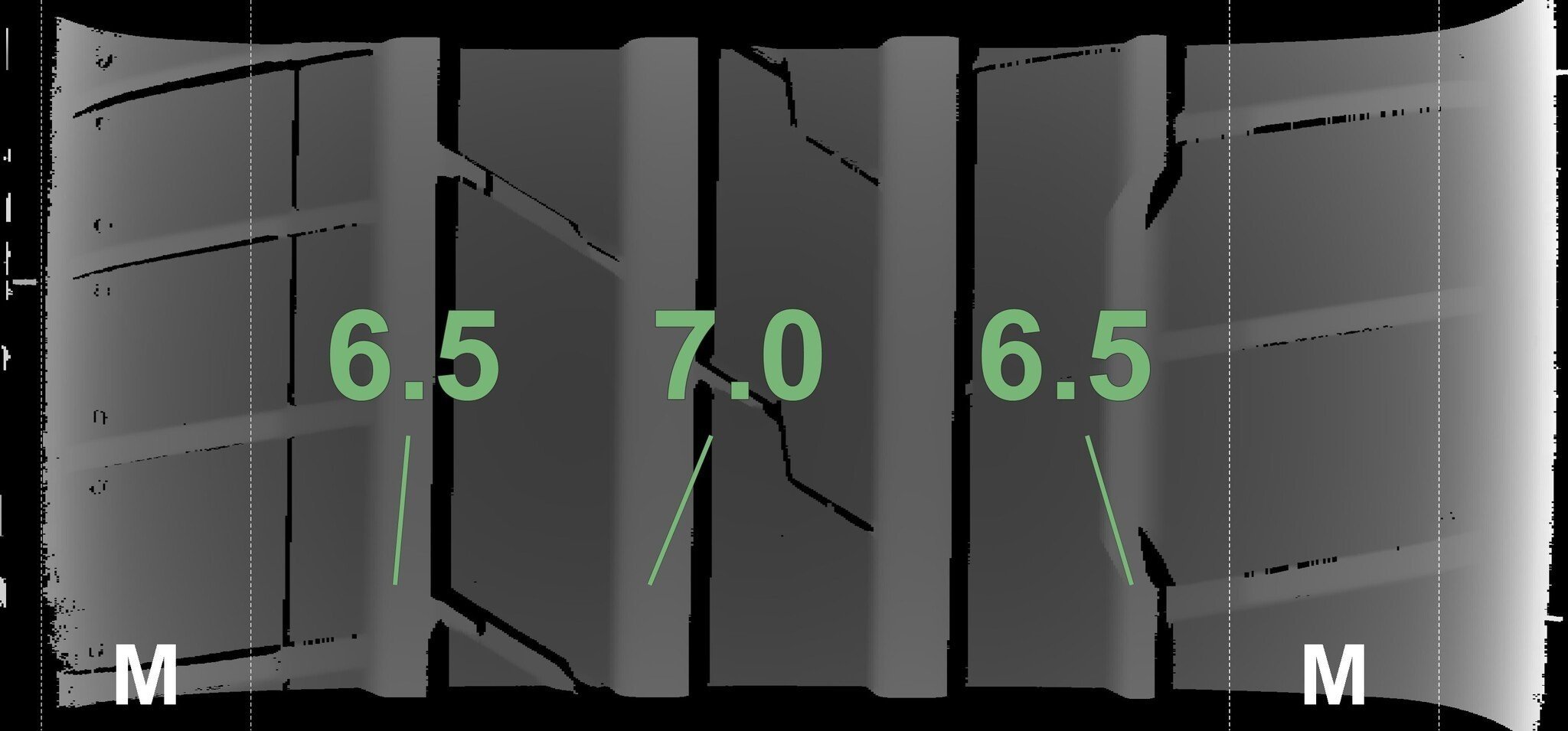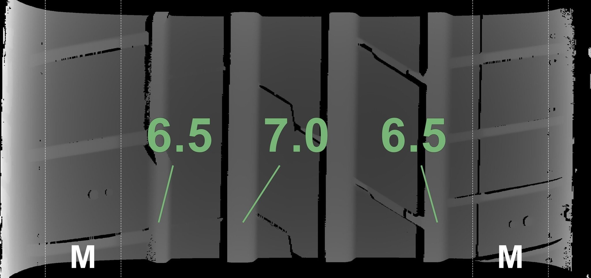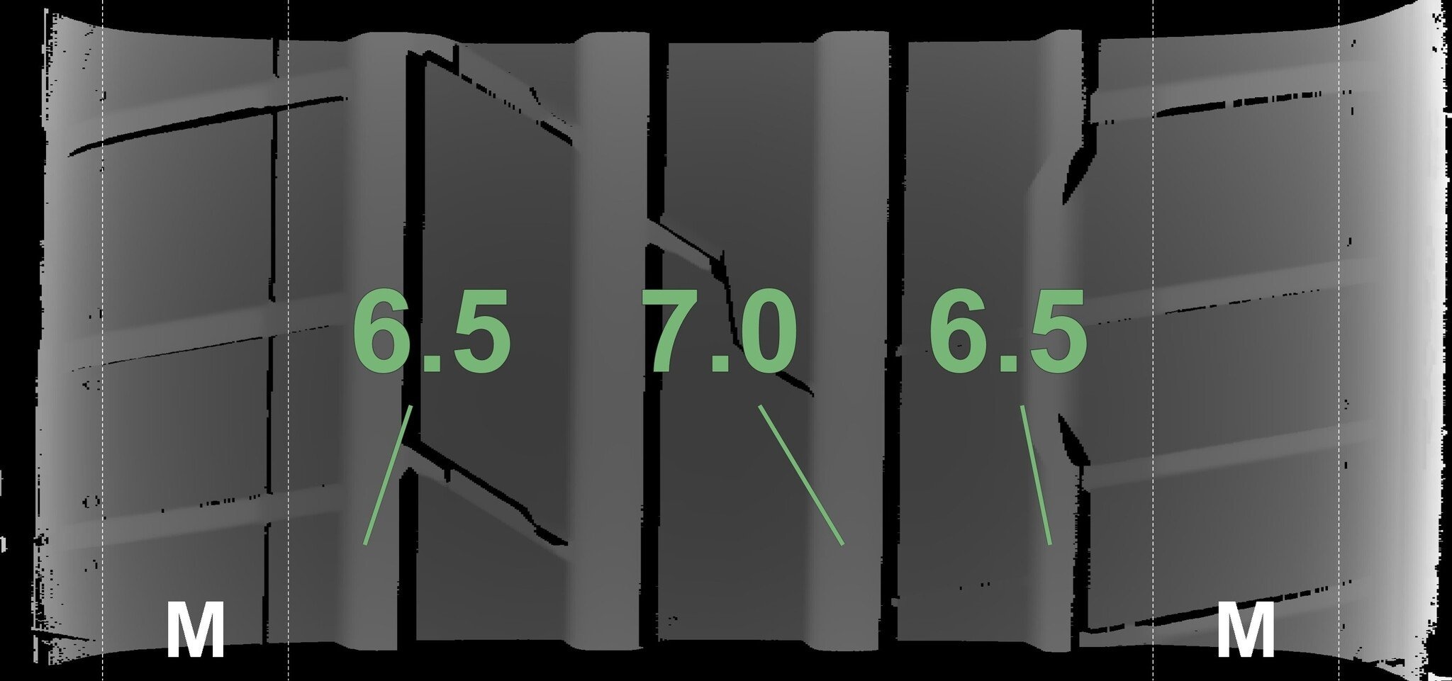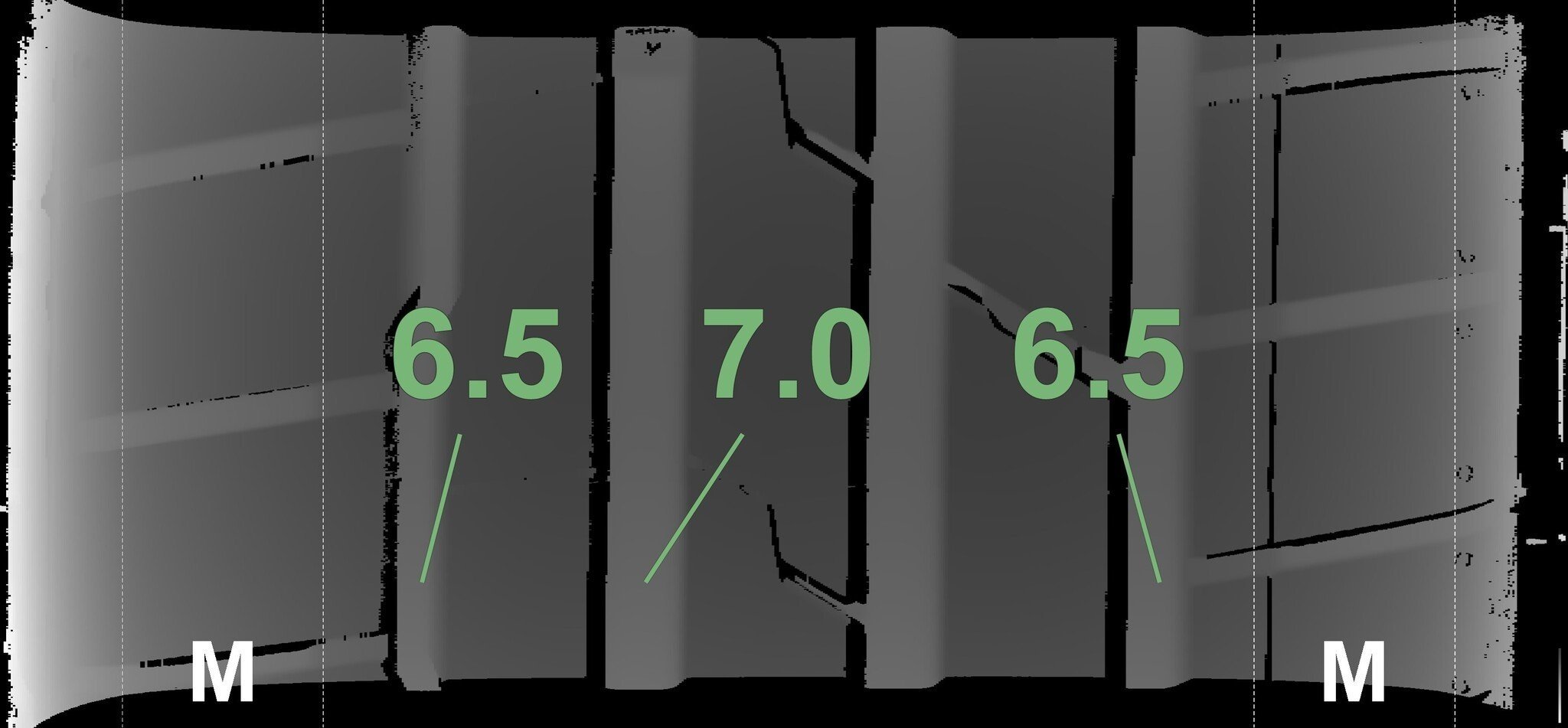 De gemeten profieldieptes en de details van de velgen zijn hierboven weergegeven.
