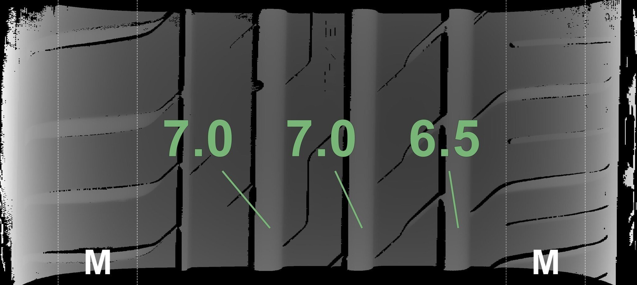 De gemeten profieldieptes en de details van de velgen zijn hierboven weergegeven.