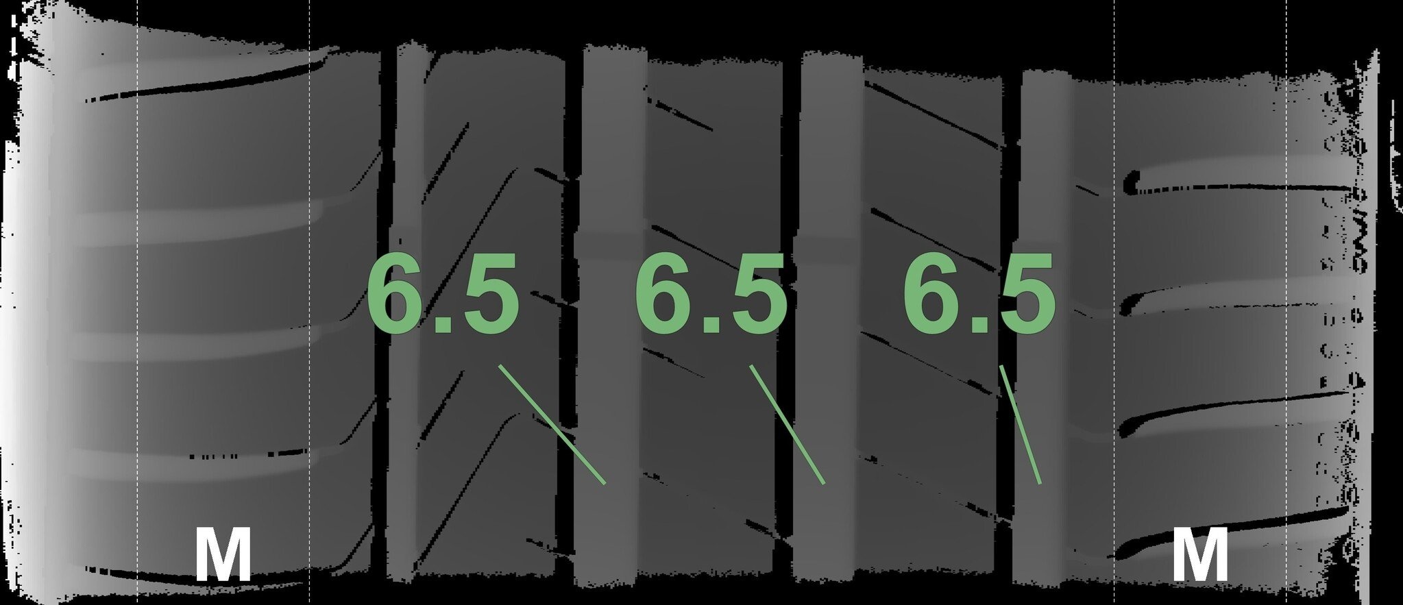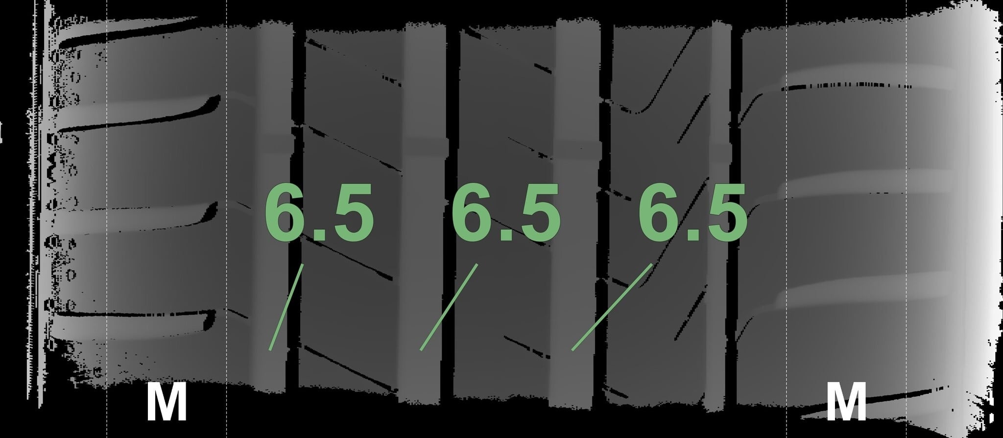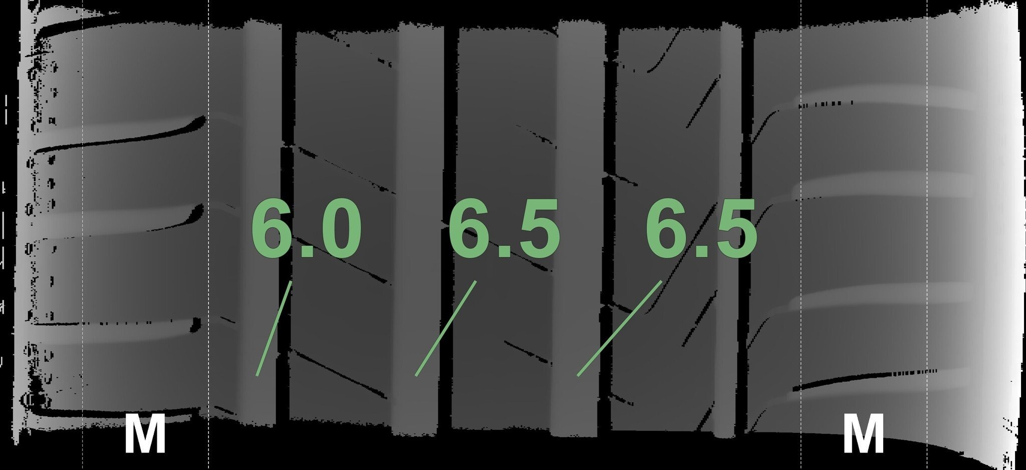 De gemeten profieldieptes en de details van de velgen zijn hierboven weergegeven.