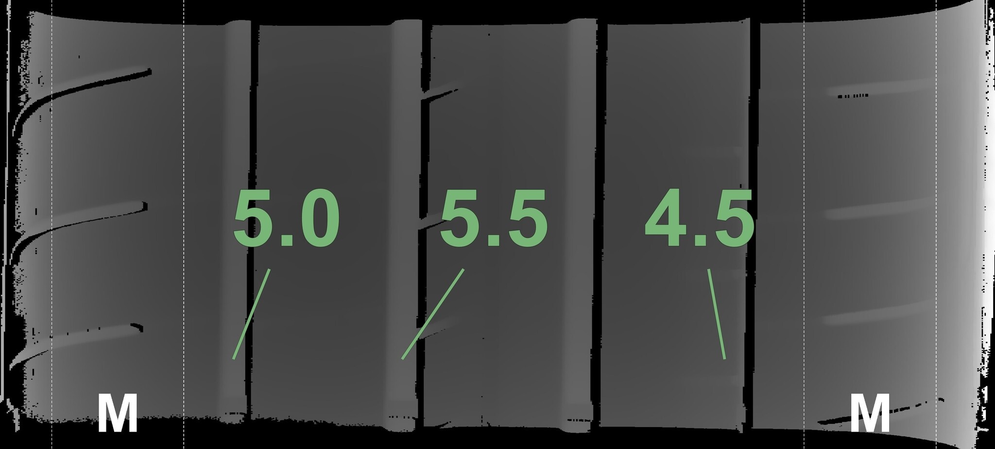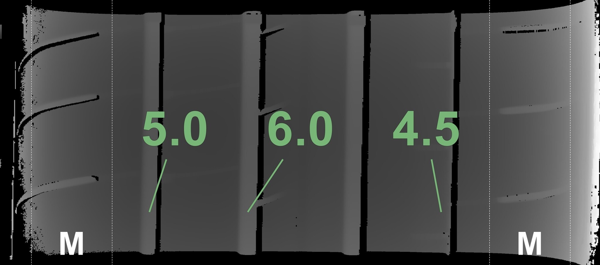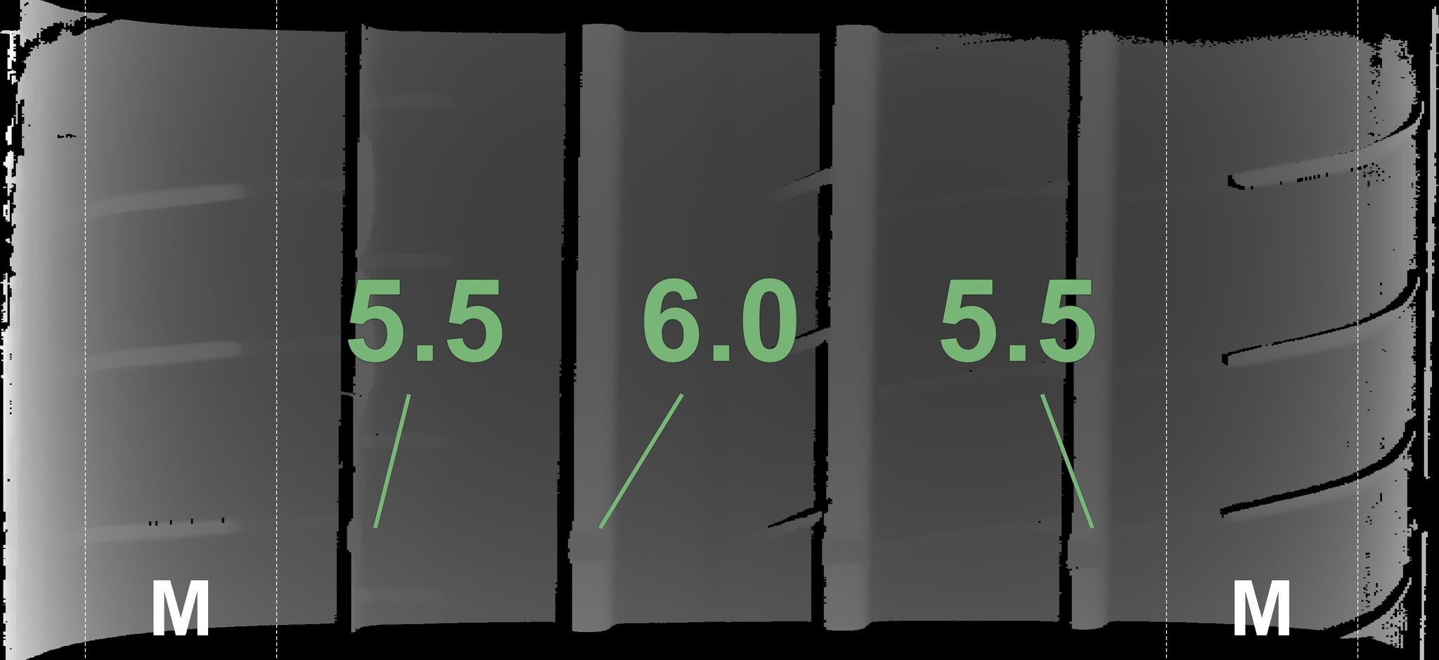 De gemeten profieldieptes en de details van de velgen zijn hierboven weergegeven.