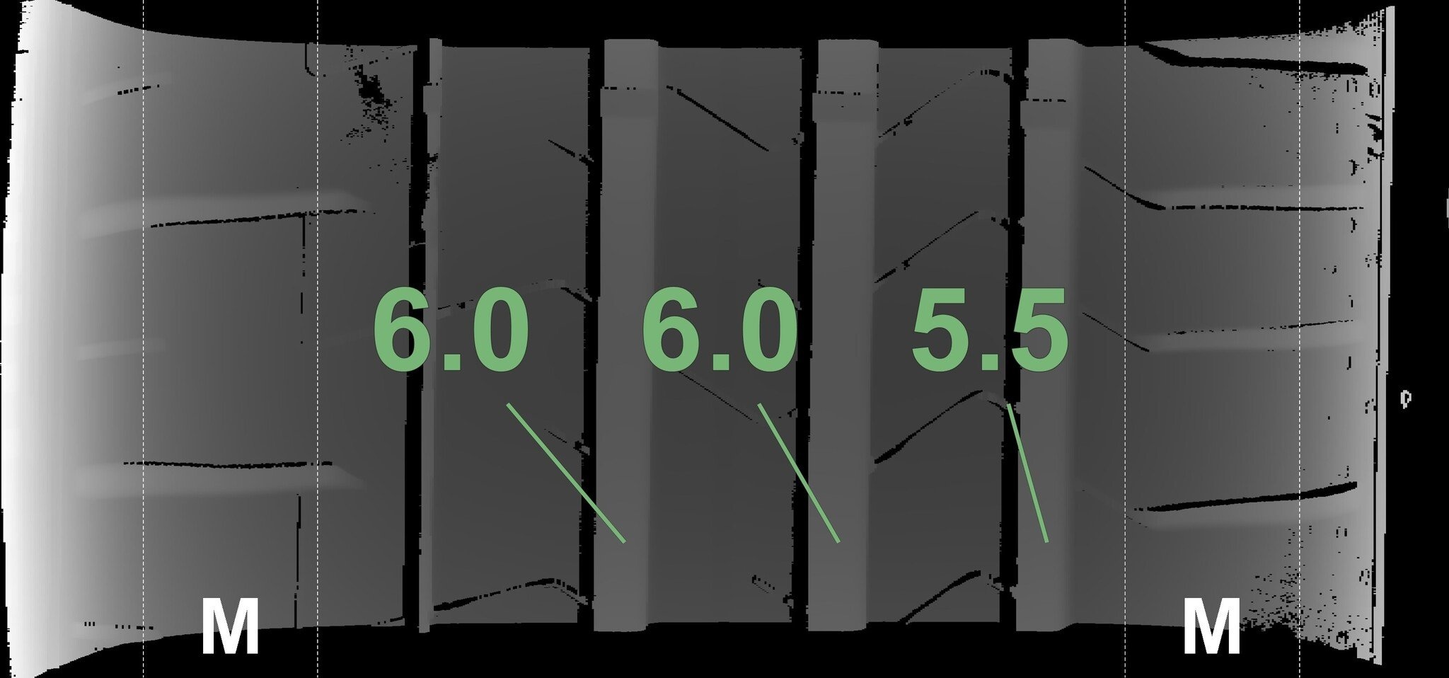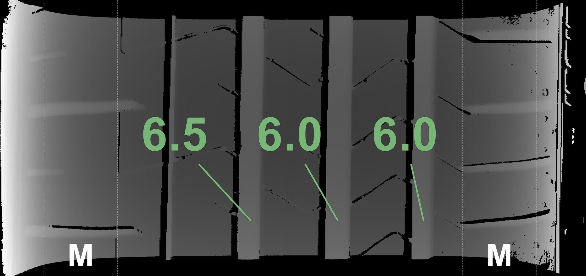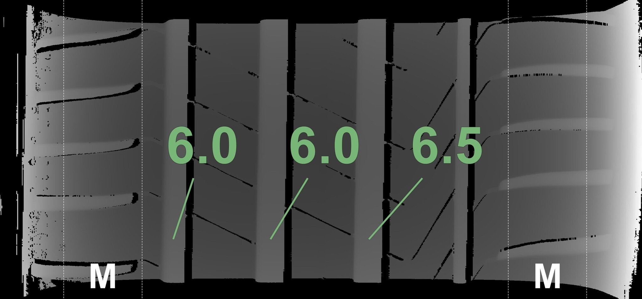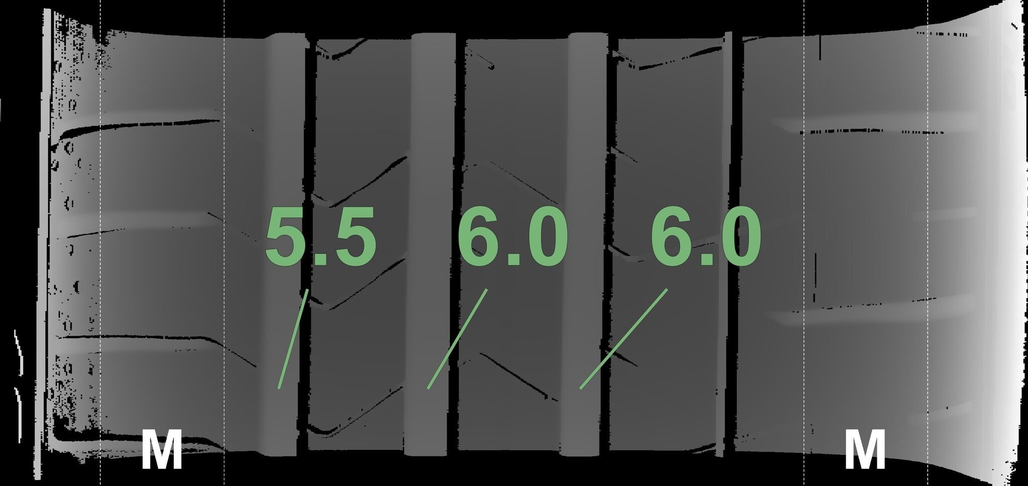 De gemeten profieldieptes en de details van de velgen zijn hierboven weergegeven.