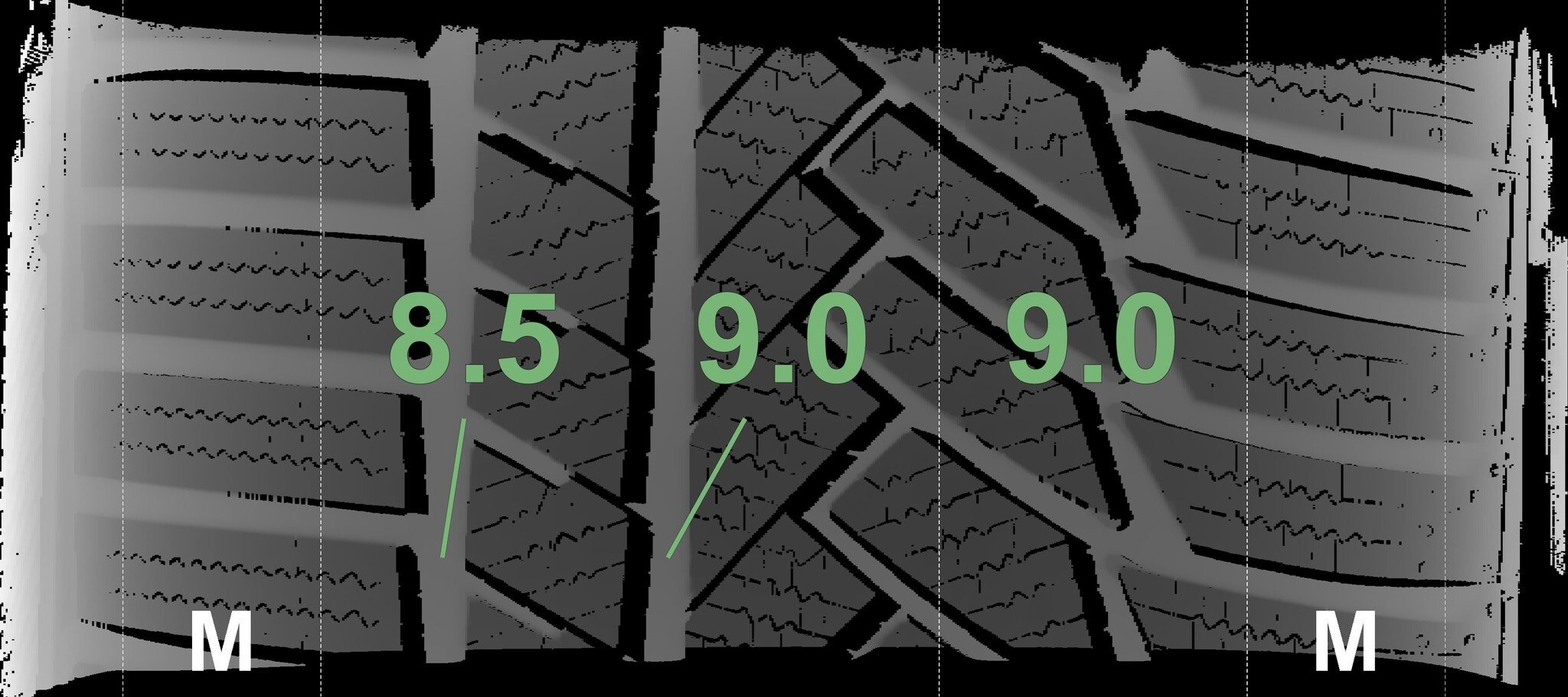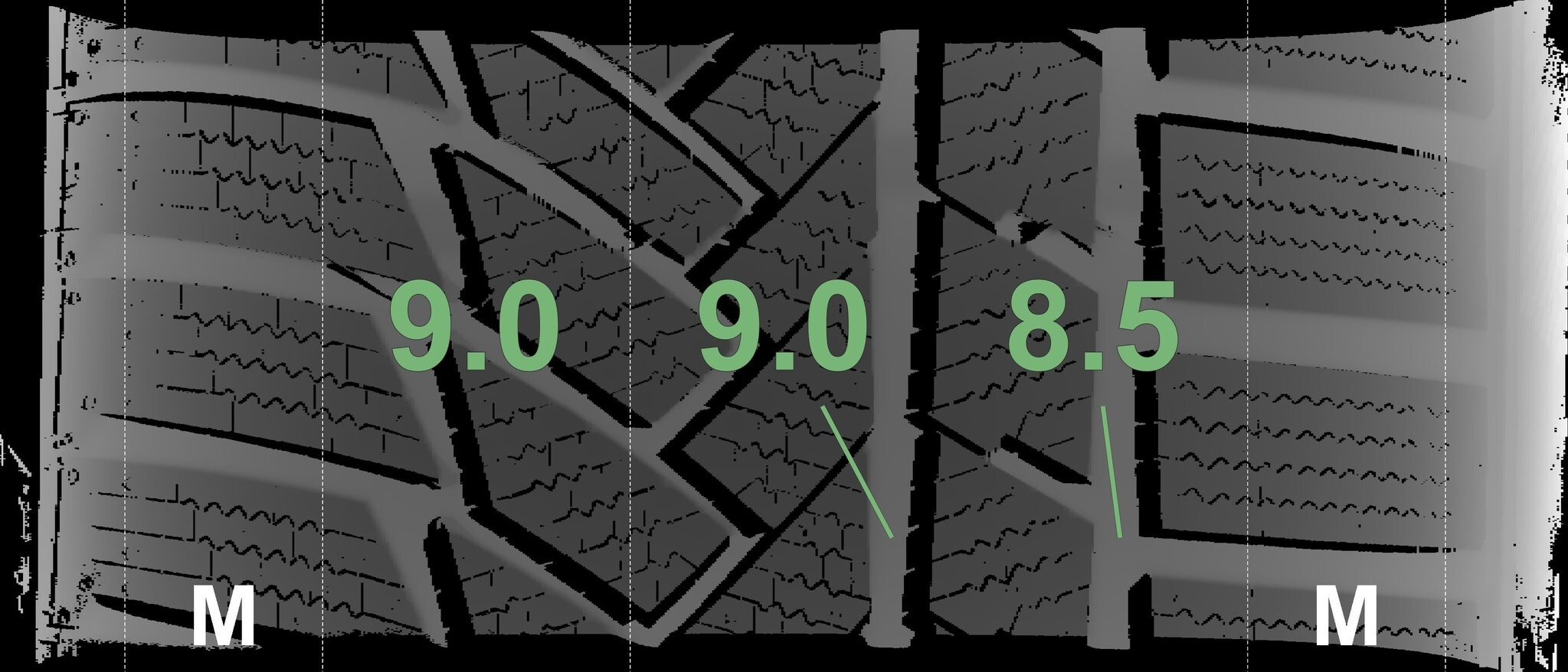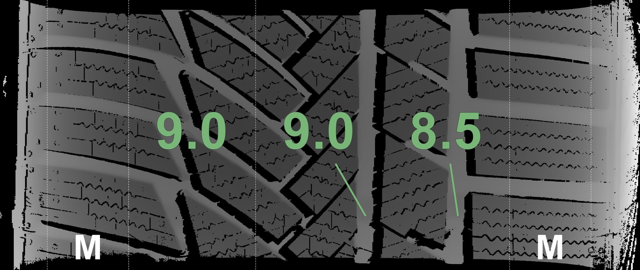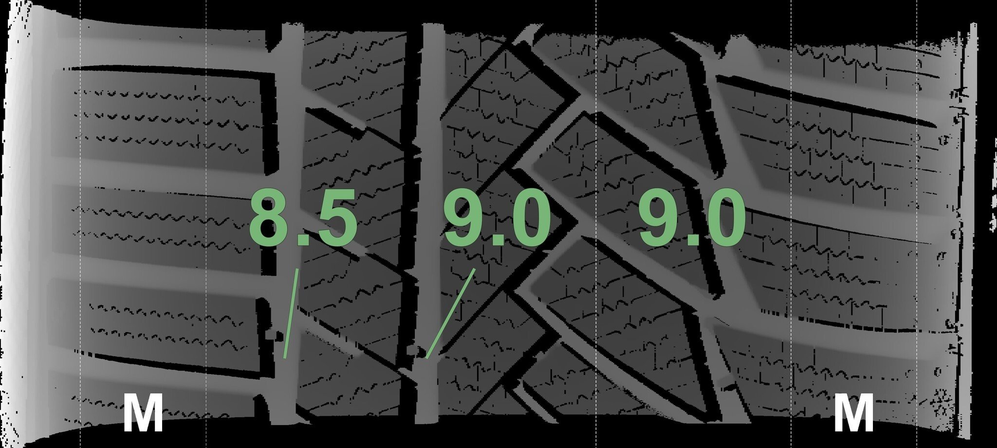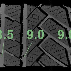 De gemeten profieldieptes en de details van de velgen zijn hierboven weergegeven.