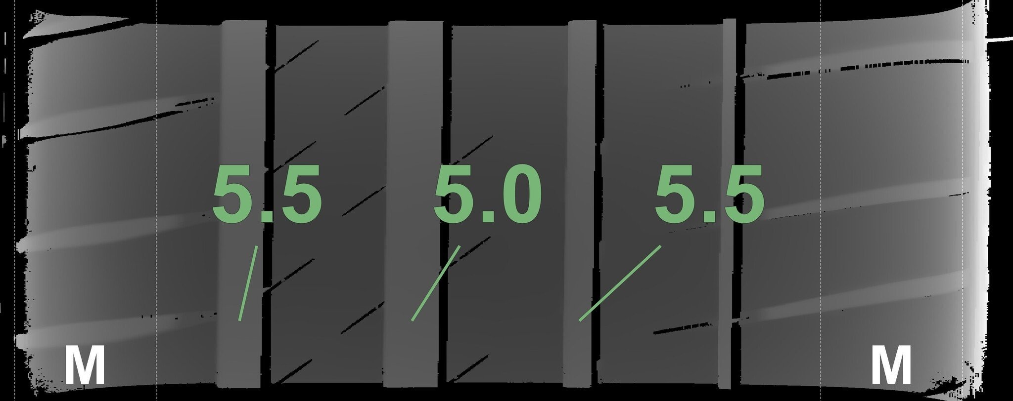 De gemeten profieldieptes en de details van de velgen zijn hierboven weergegeven.