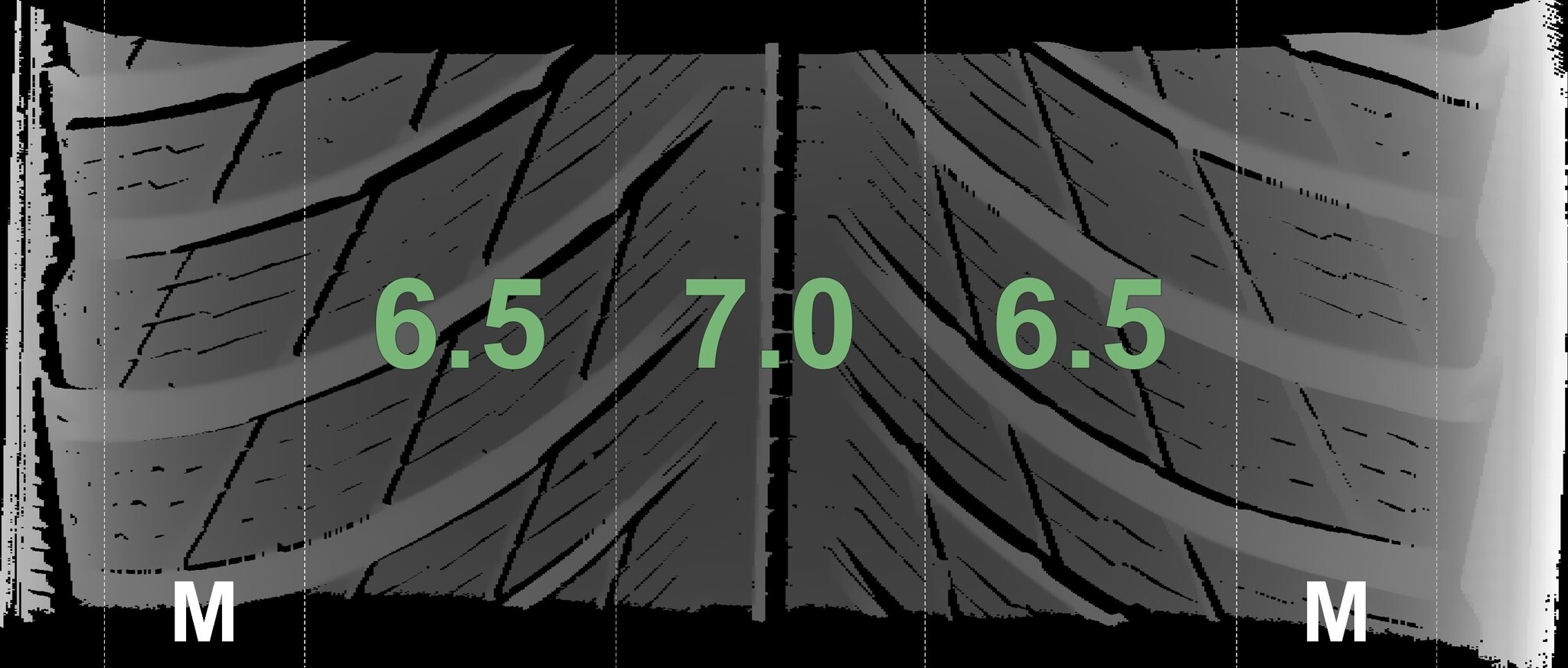De gemeten profieldieptes en de details van de velgen zijn hierboven weergegeven.