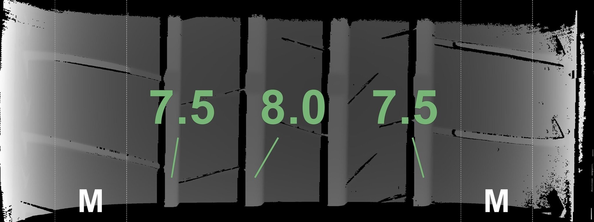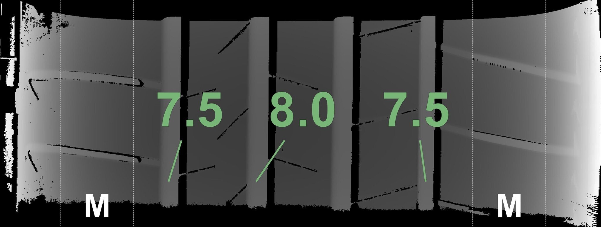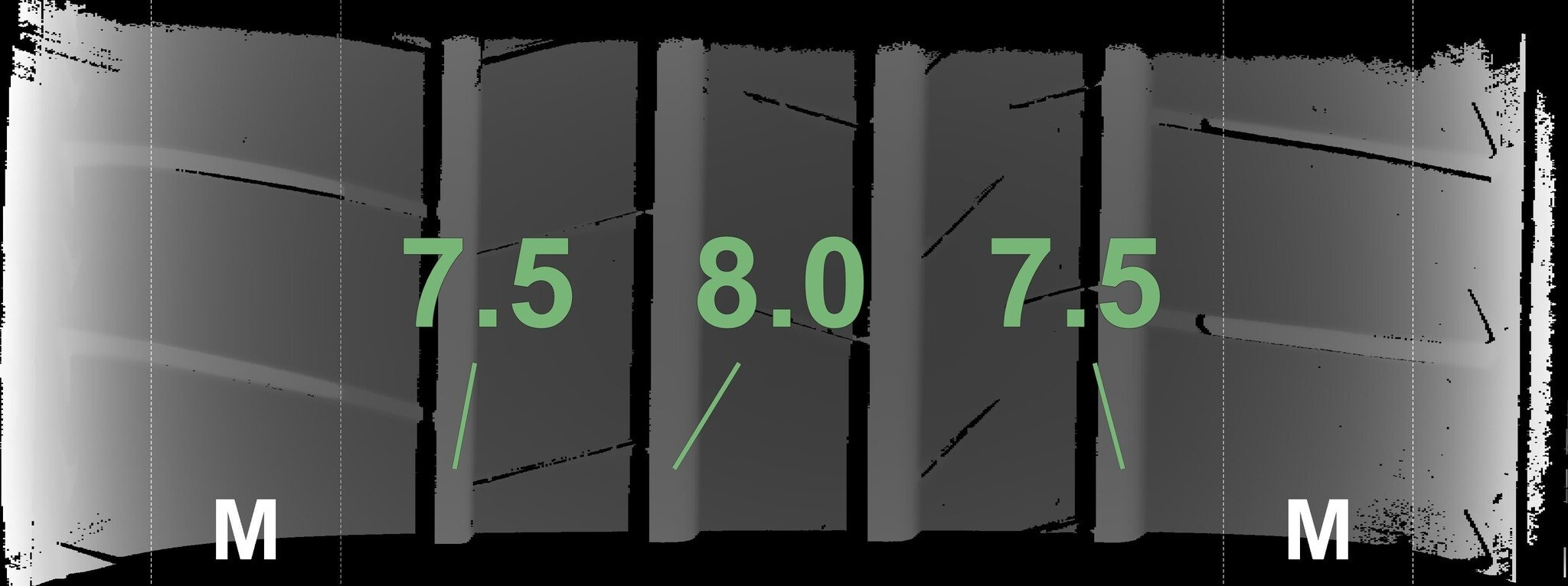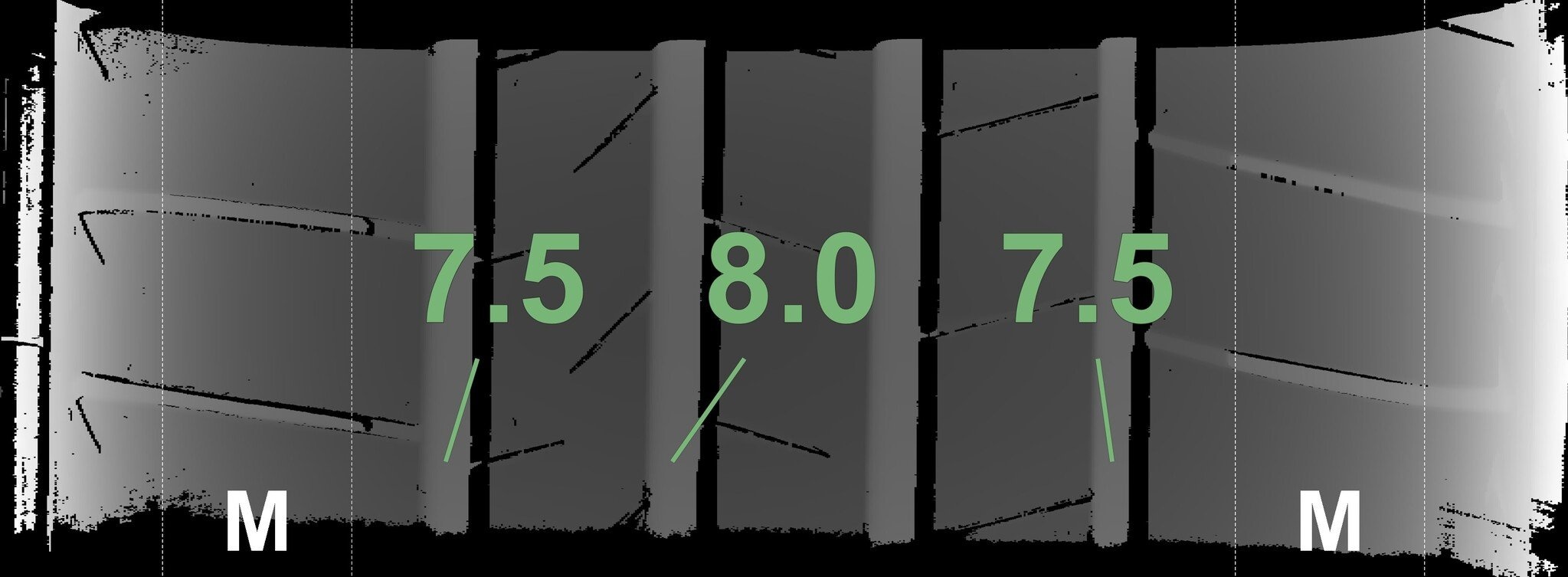| Conditie | Profieldiepte | DOT | Rechts Achter | Demo nopjes nog zichtbaar | 7.5 mm | 0323 |