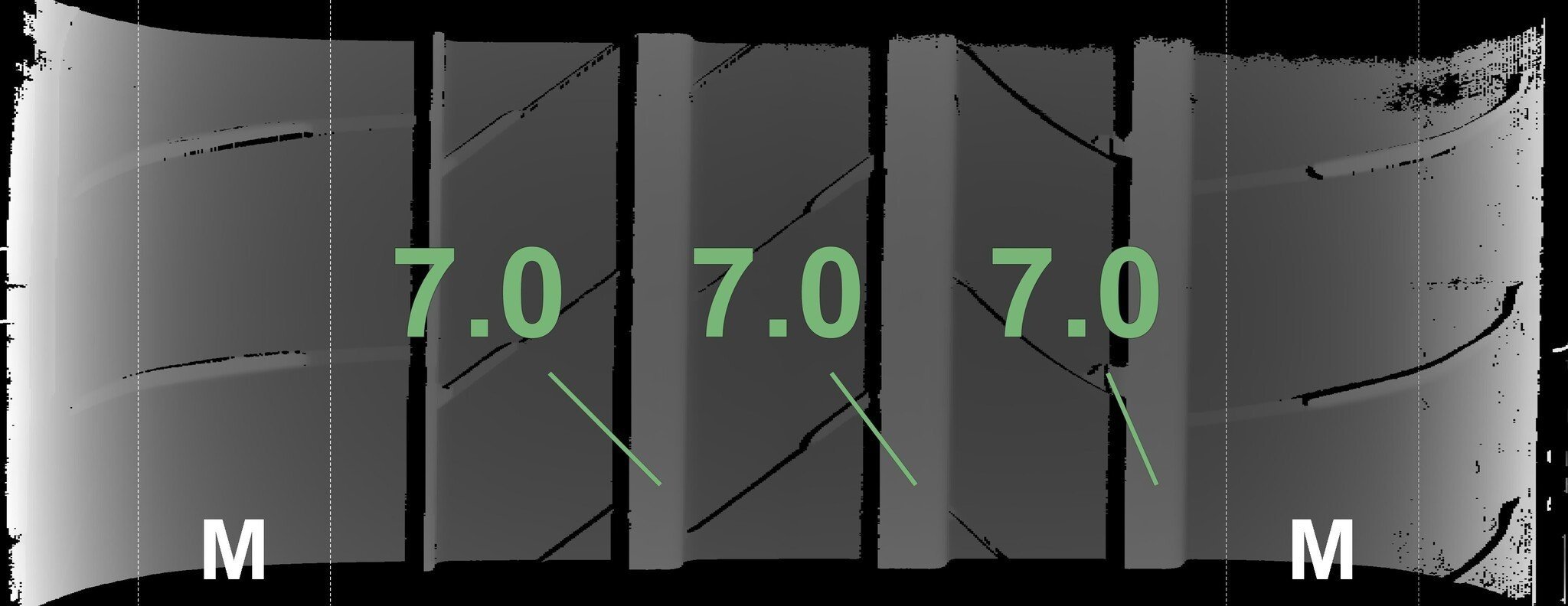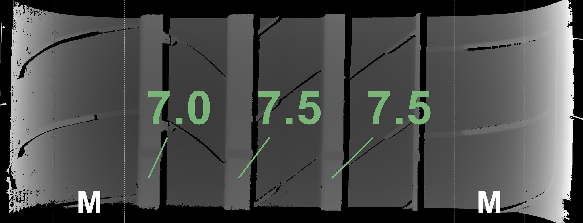 | Conditie | Profieldiepte | DOT | Rechts Achter | Demo nopjes nog zichtbaar | 7.0 mm | 2918 |