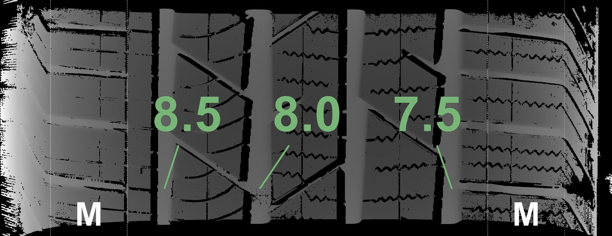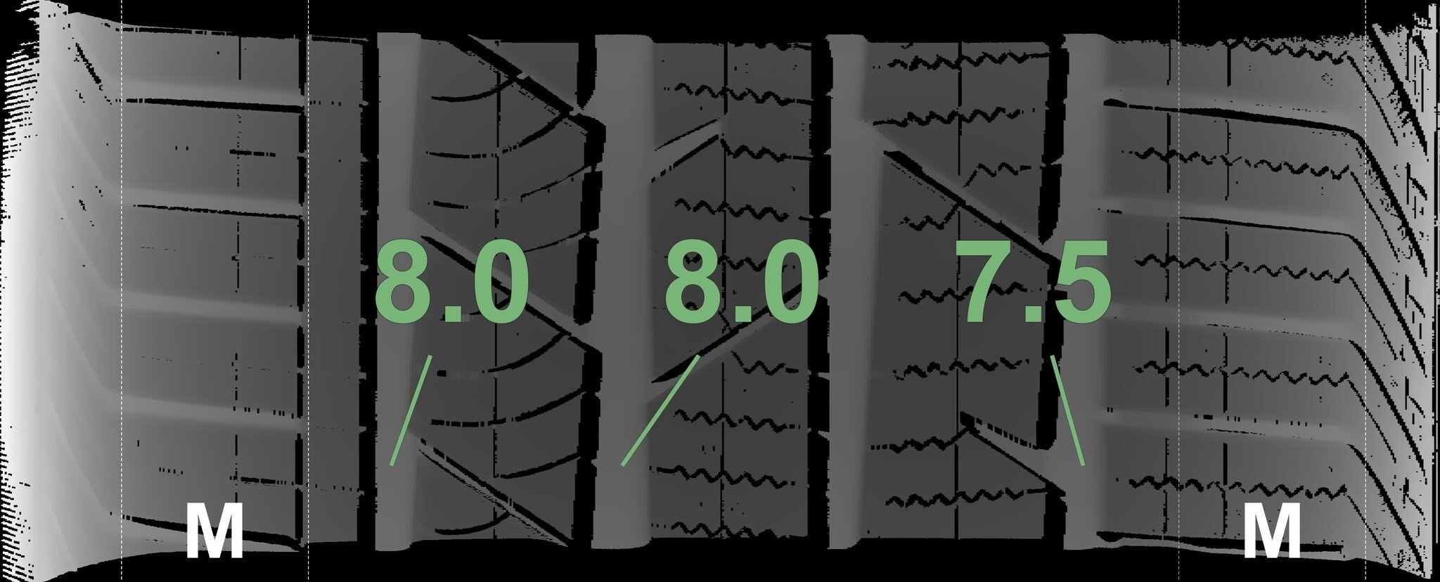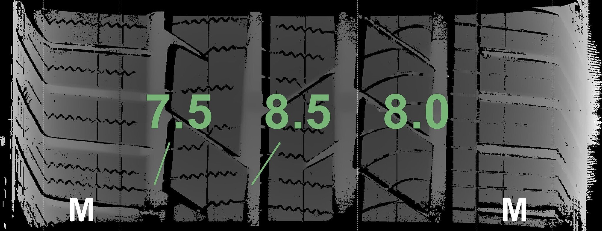 De gemeten profieldieptes en de details van de velgen zijn hierboven weergegeven.