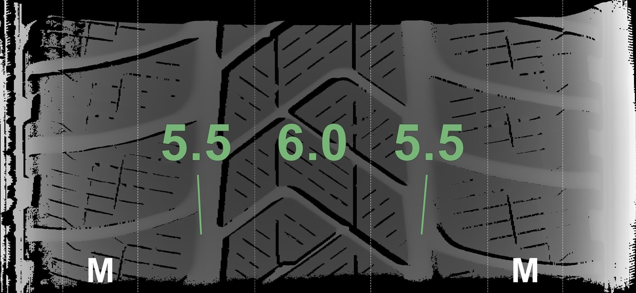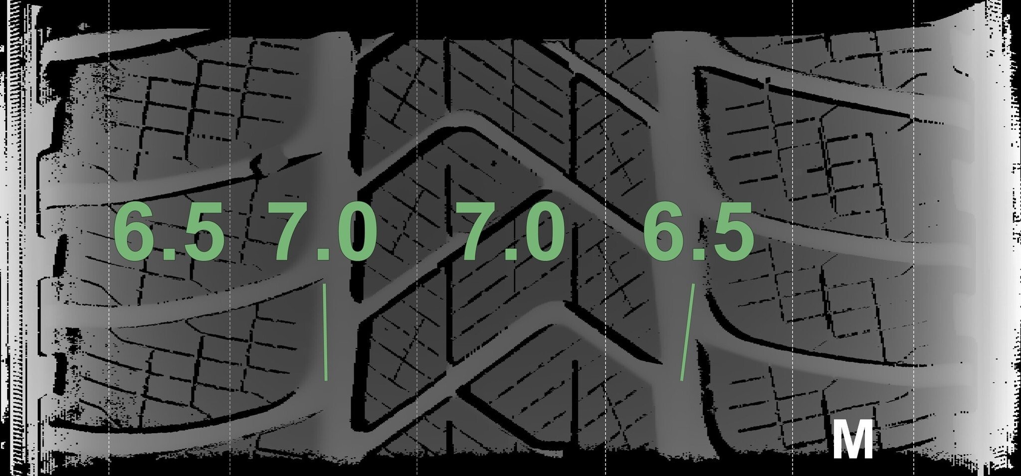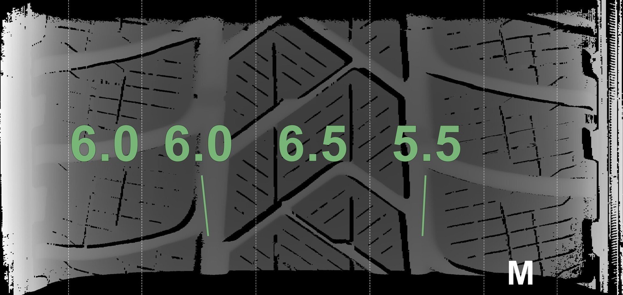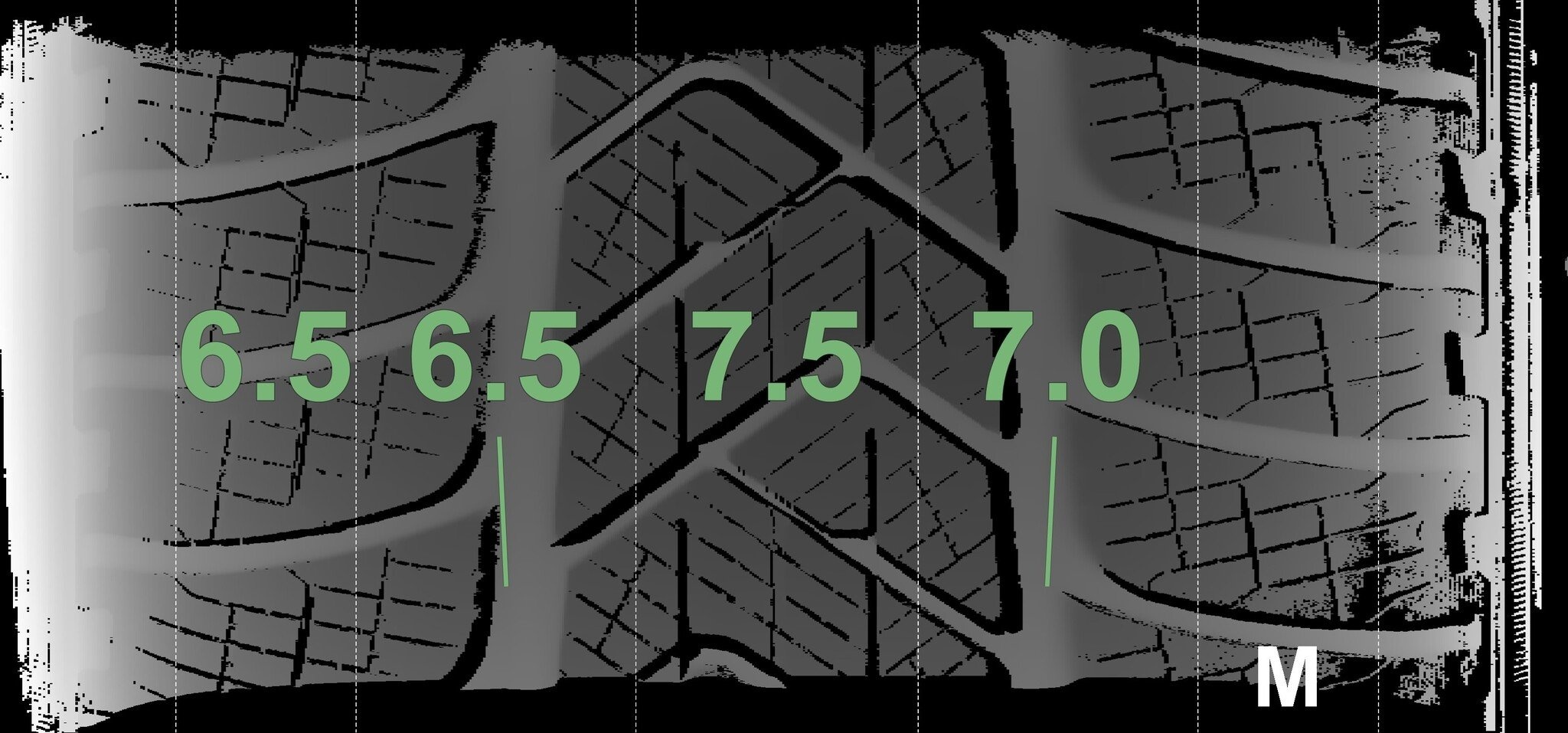 De gemeten profieldieptes en de details van de velgen zijn hierboven weergegeven.