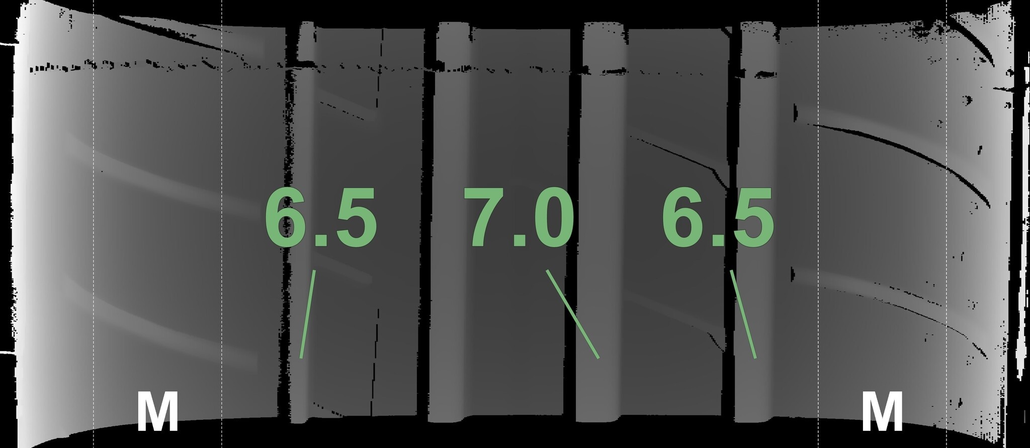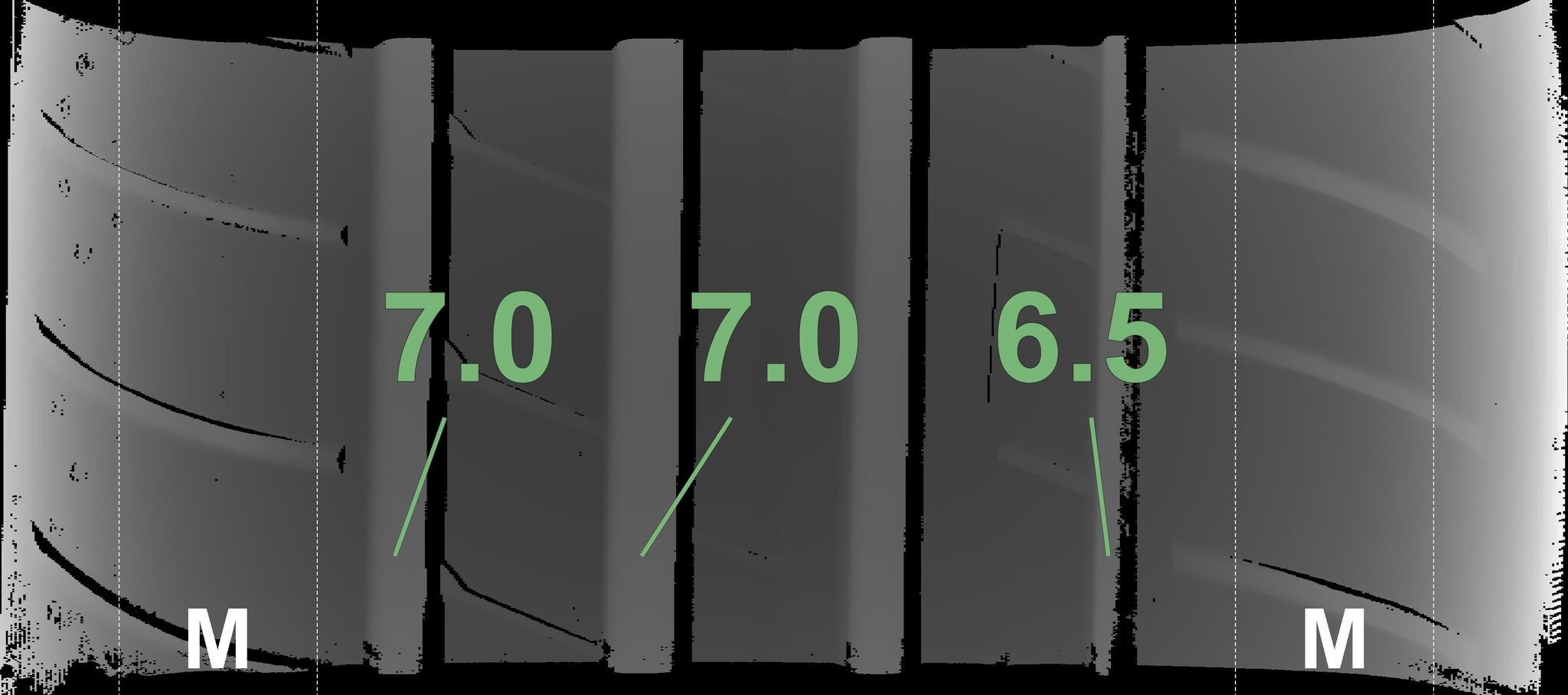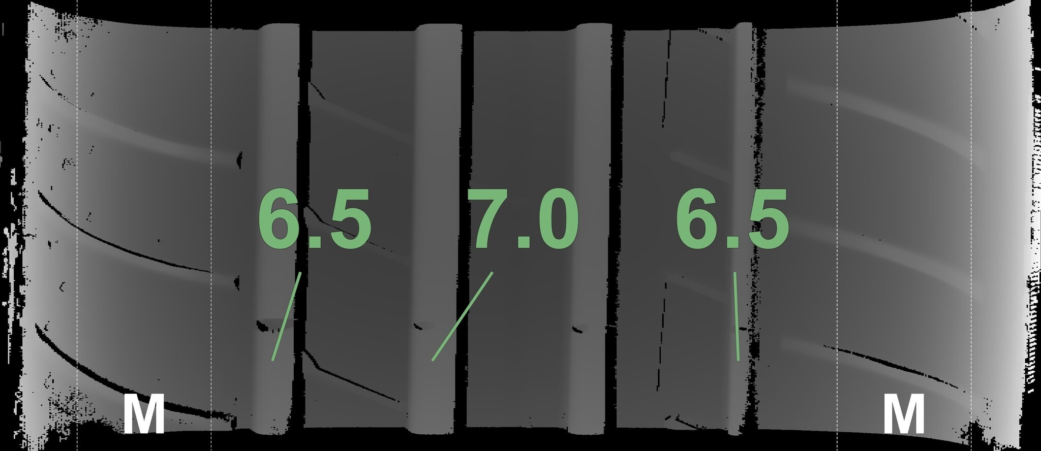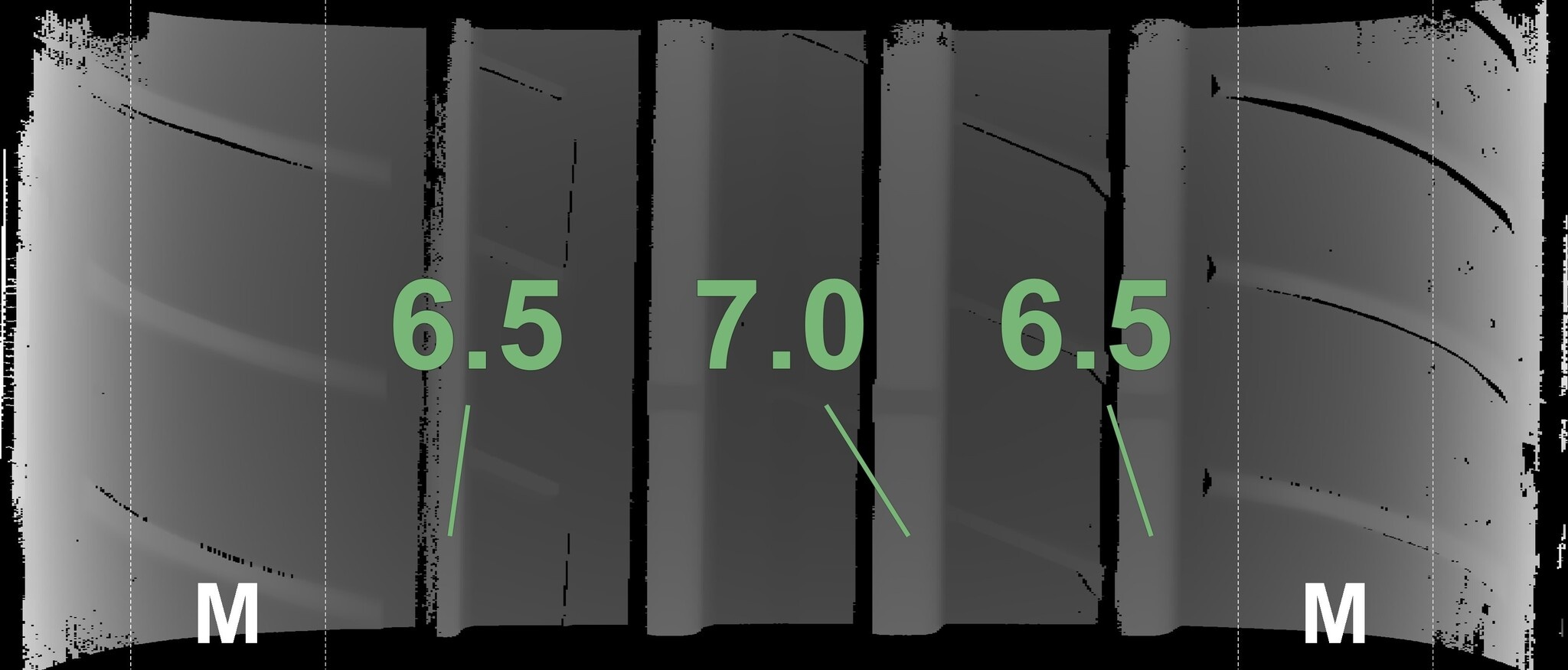 De gemeten profieldieptes en de details van de velgen zijn hierboven weergegeven.