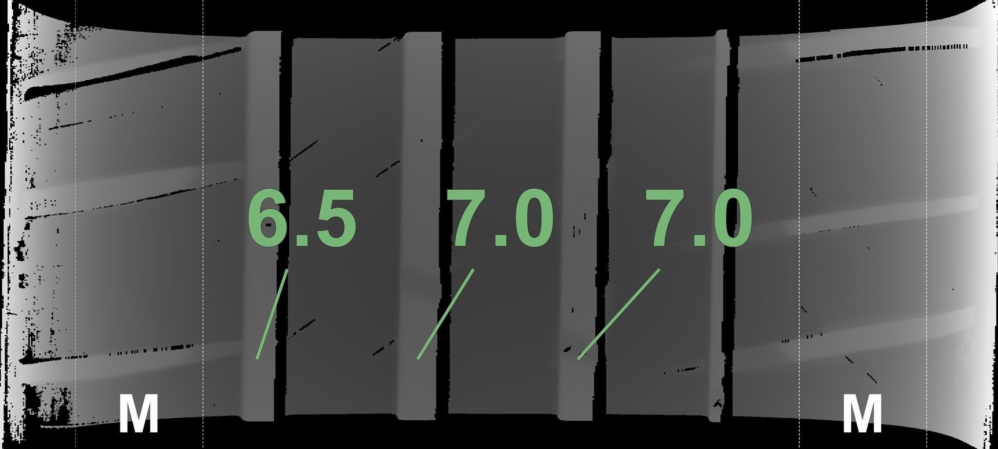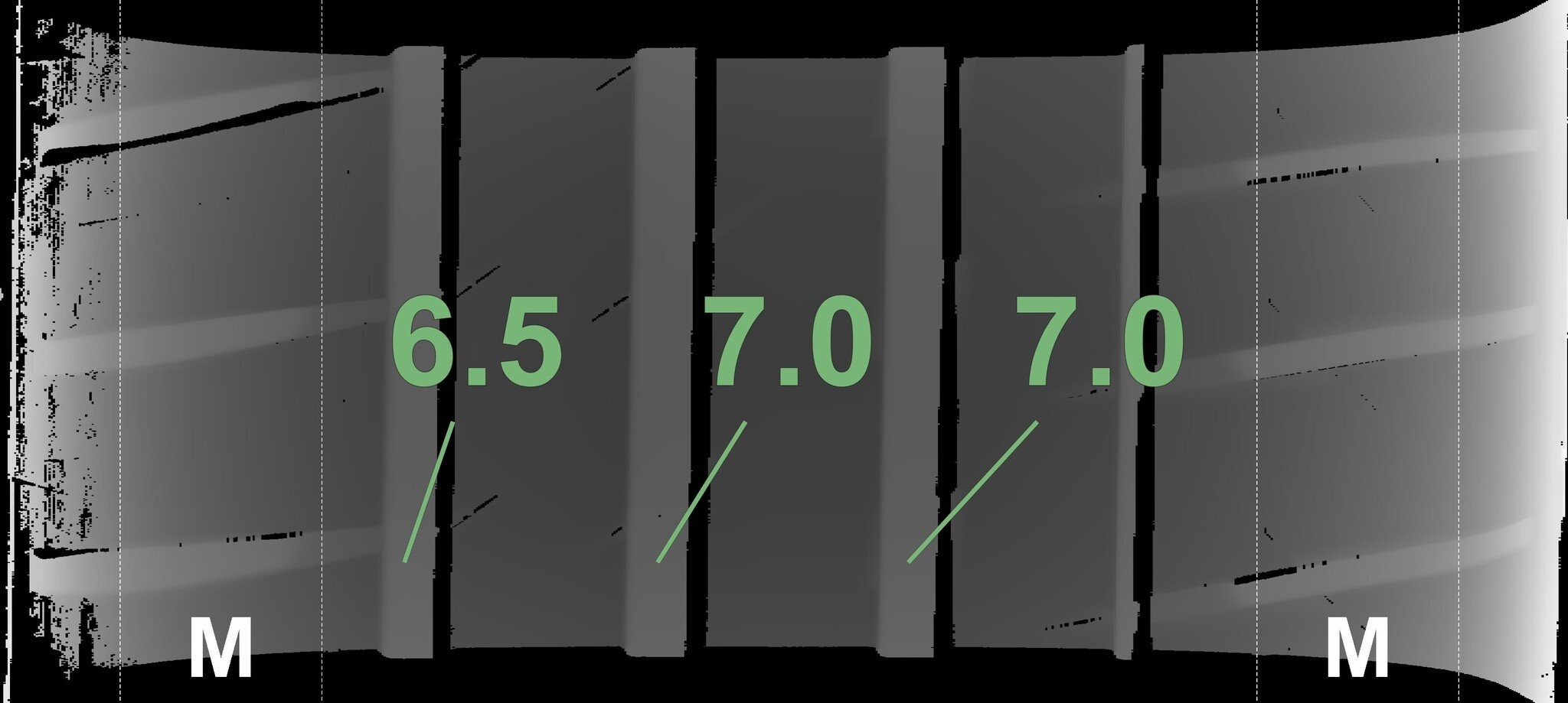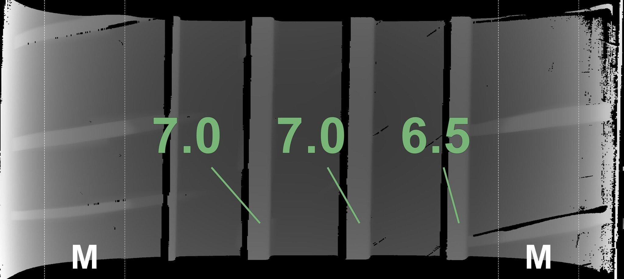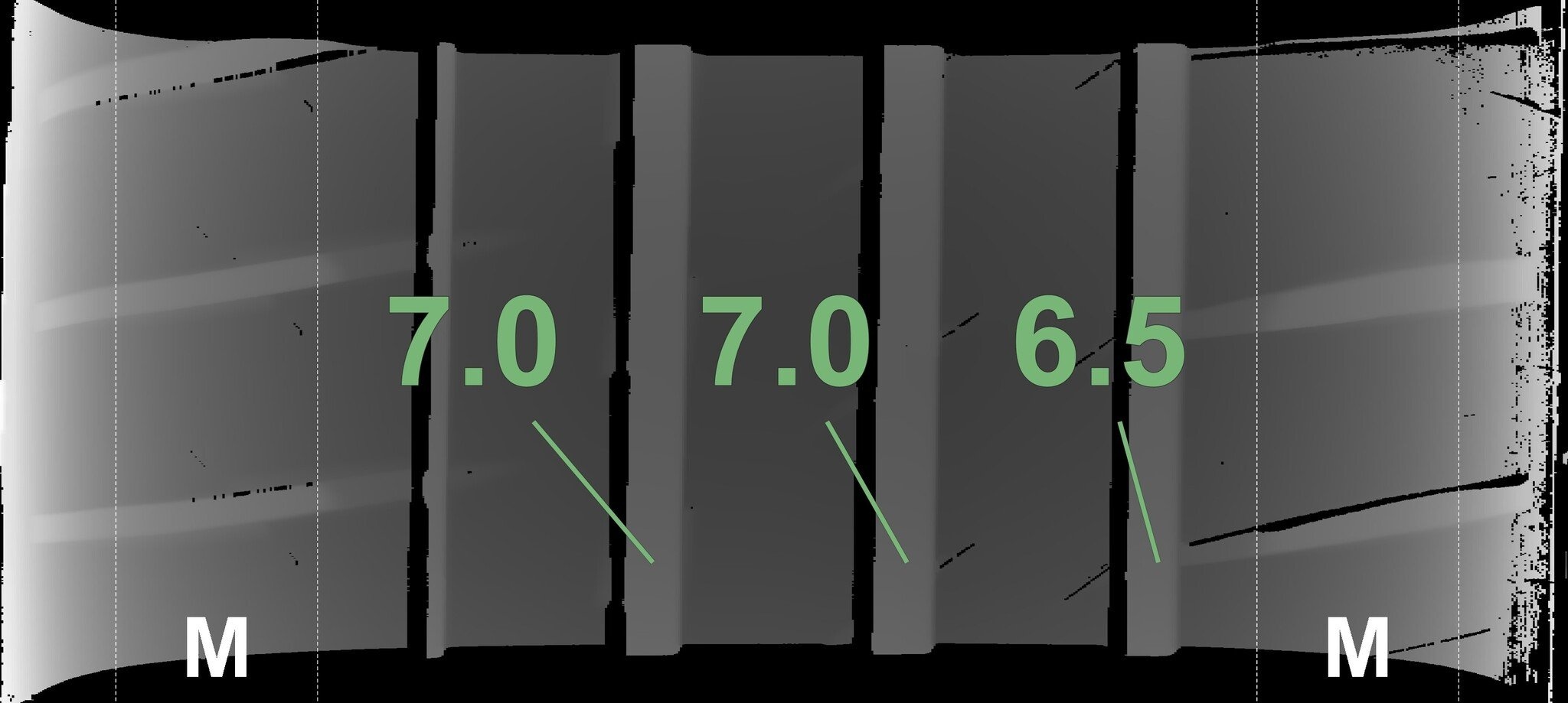 De gemeten profieldieptes en de details van de velgen zijn hierboven weergegeven.
