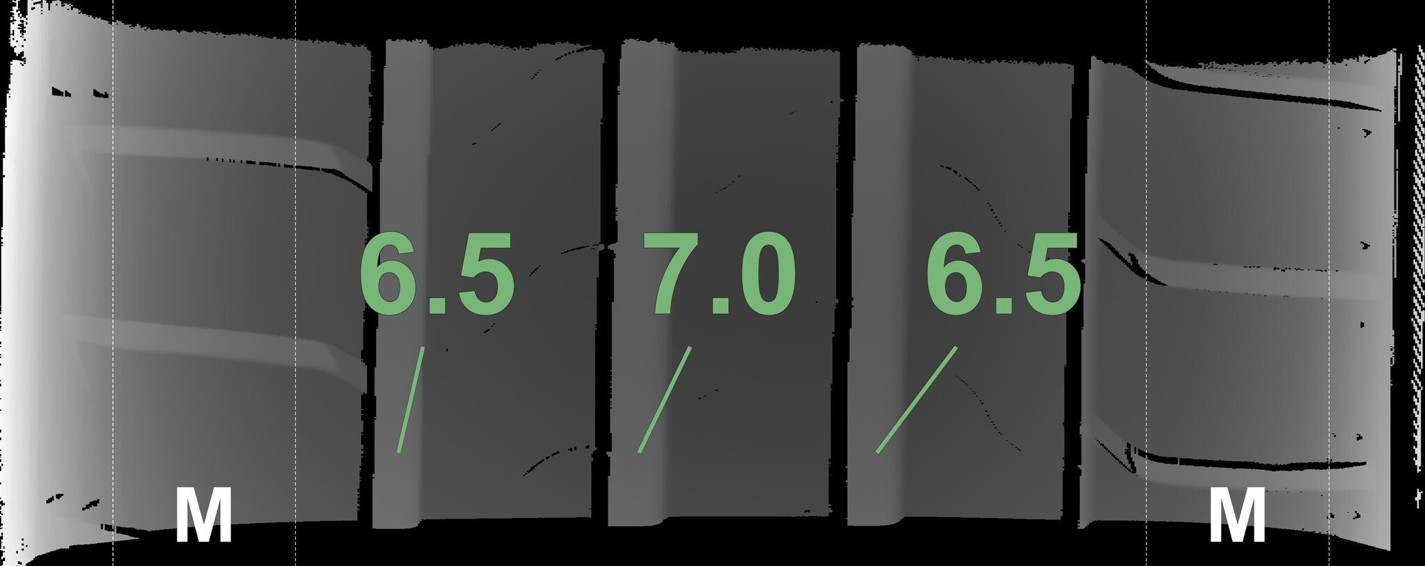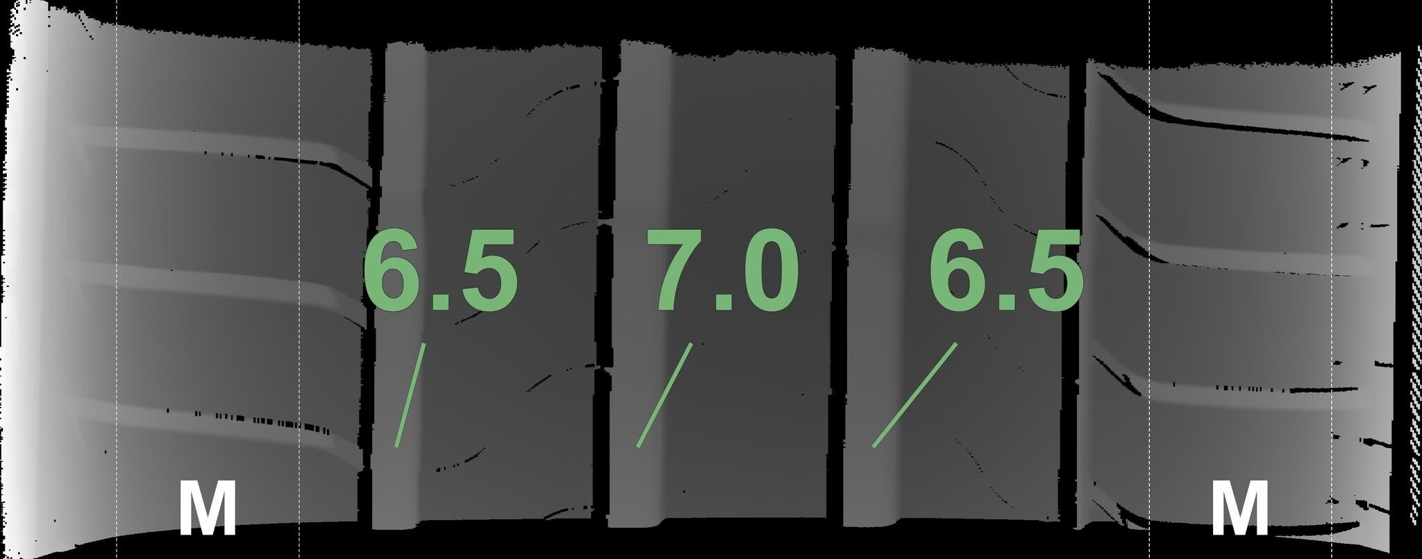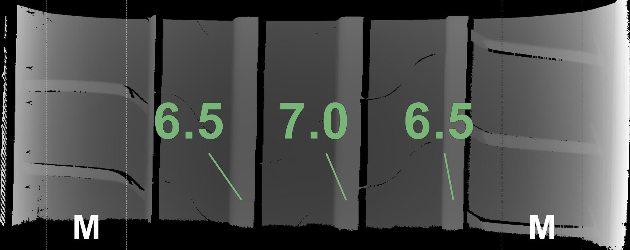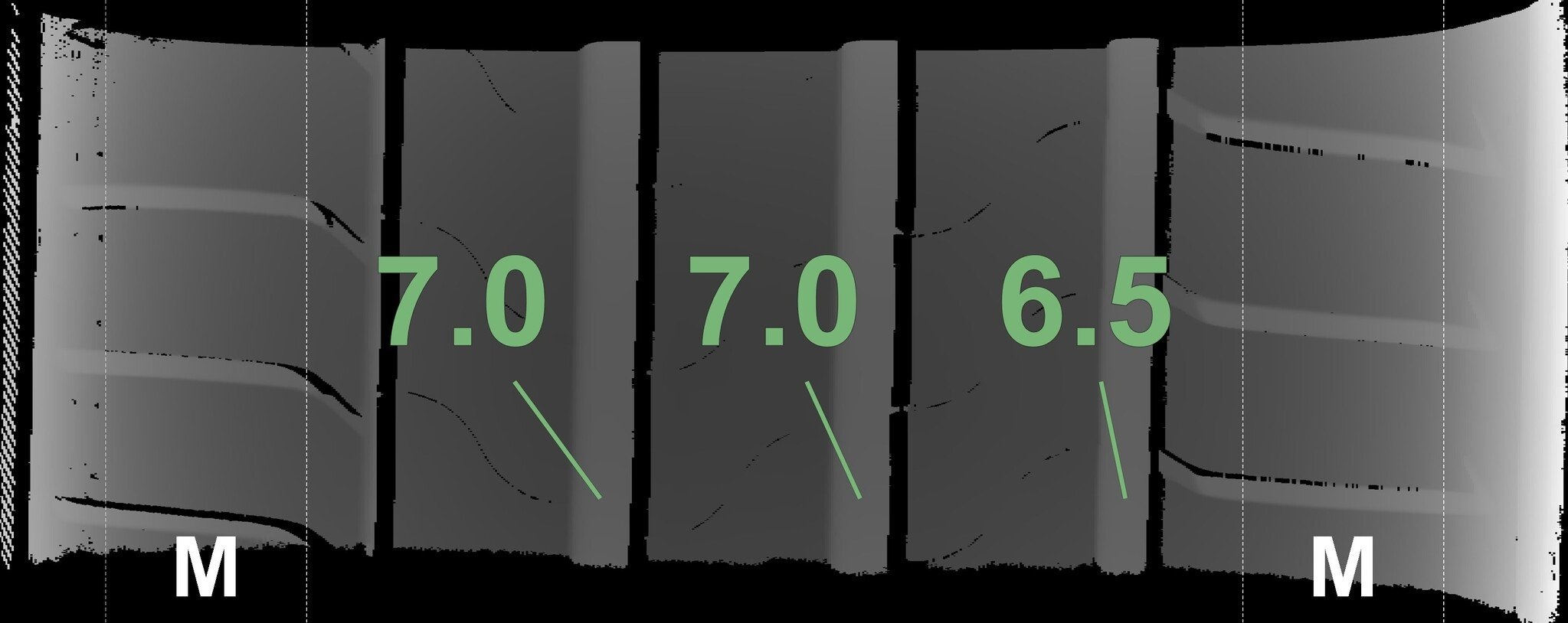 De gemeten profieldieptes en de details van de velgen zijn hierboven weergegeven.