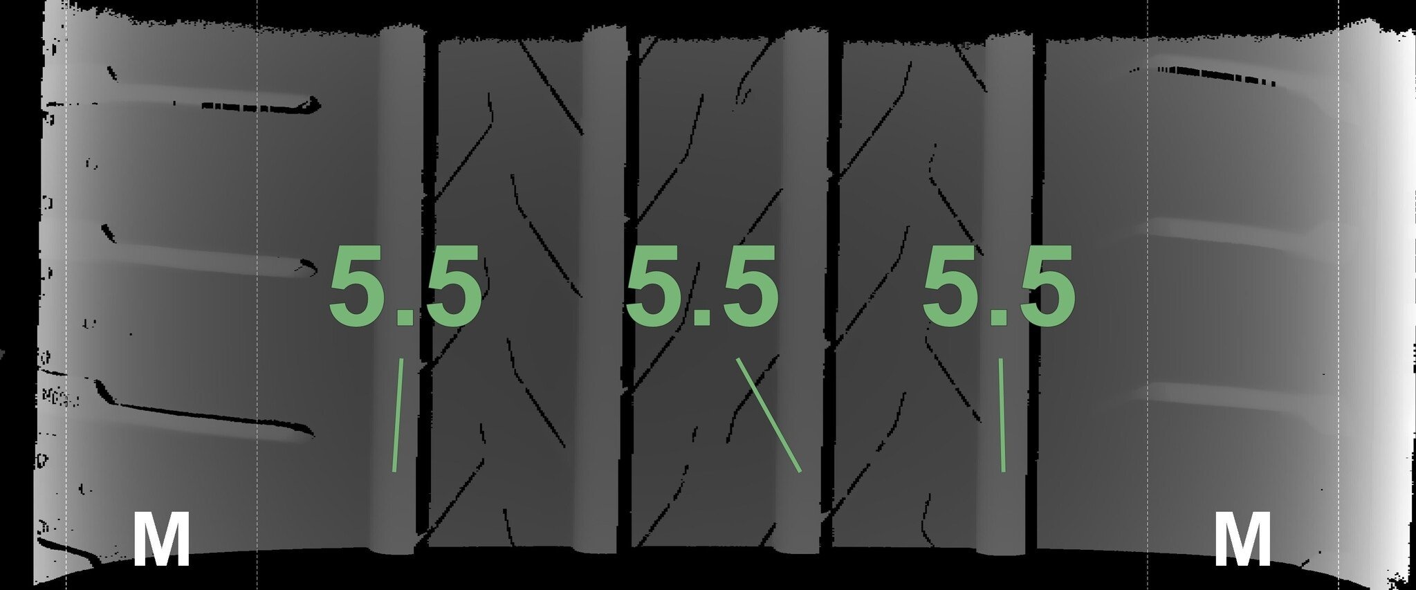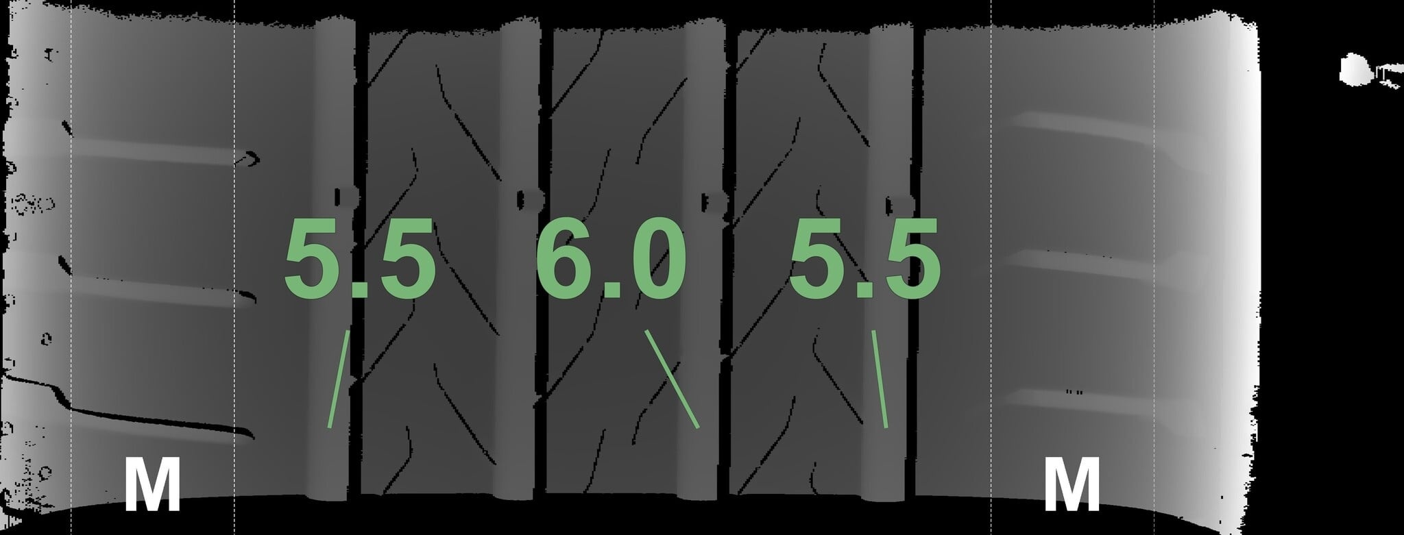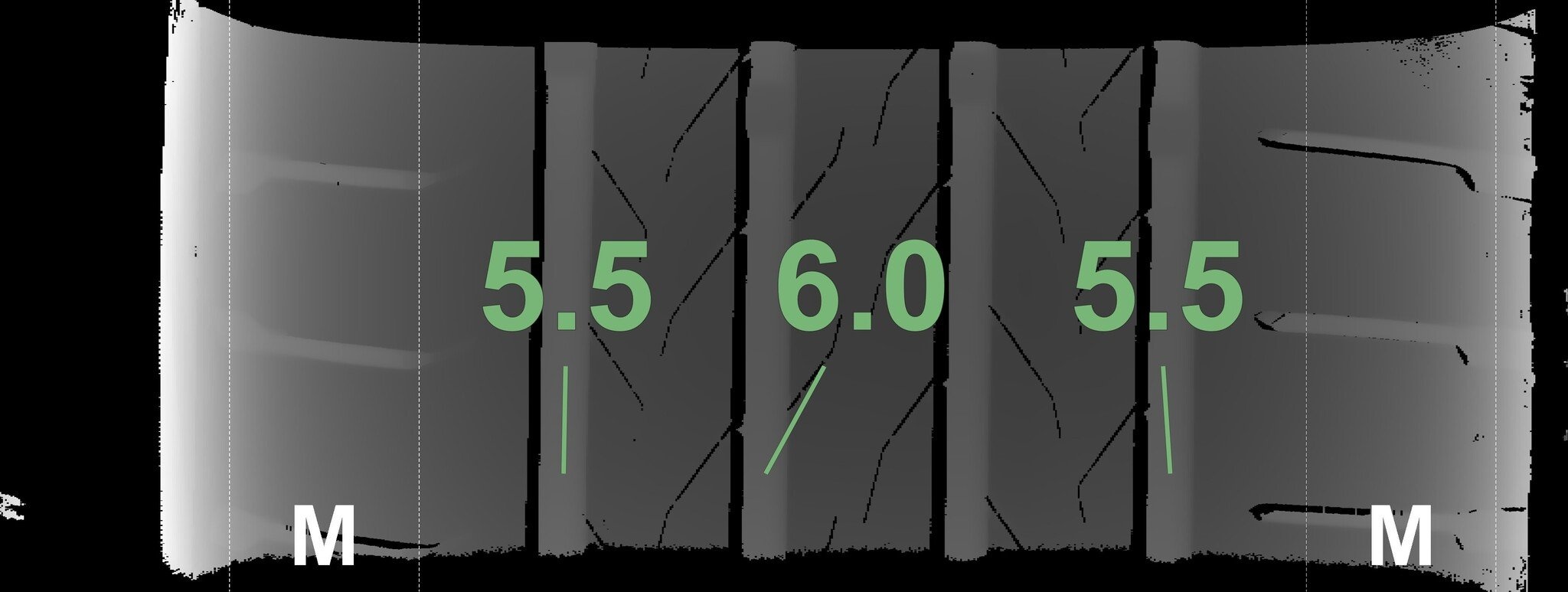De gemeten profieldieptes en de details van de velgen zijn hierboven weergegeven.