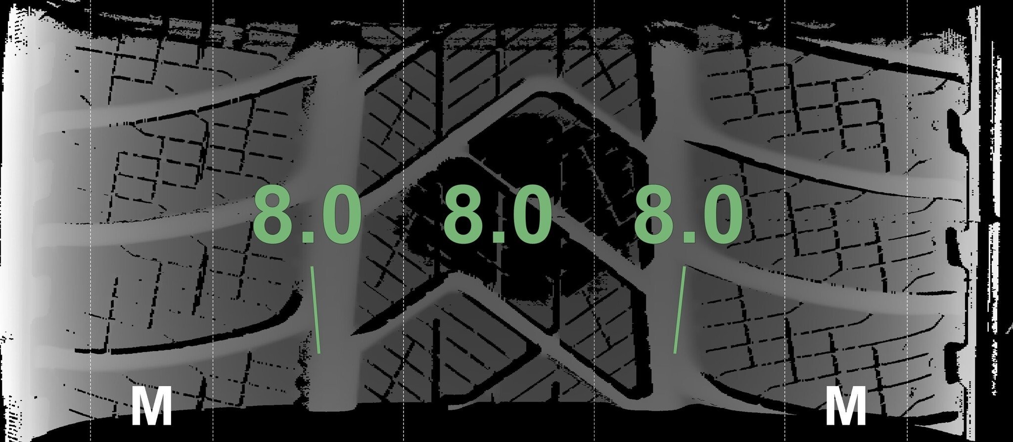 De gemeten profieldieptes en de details van de velgen zijn hierboven weergegeven.