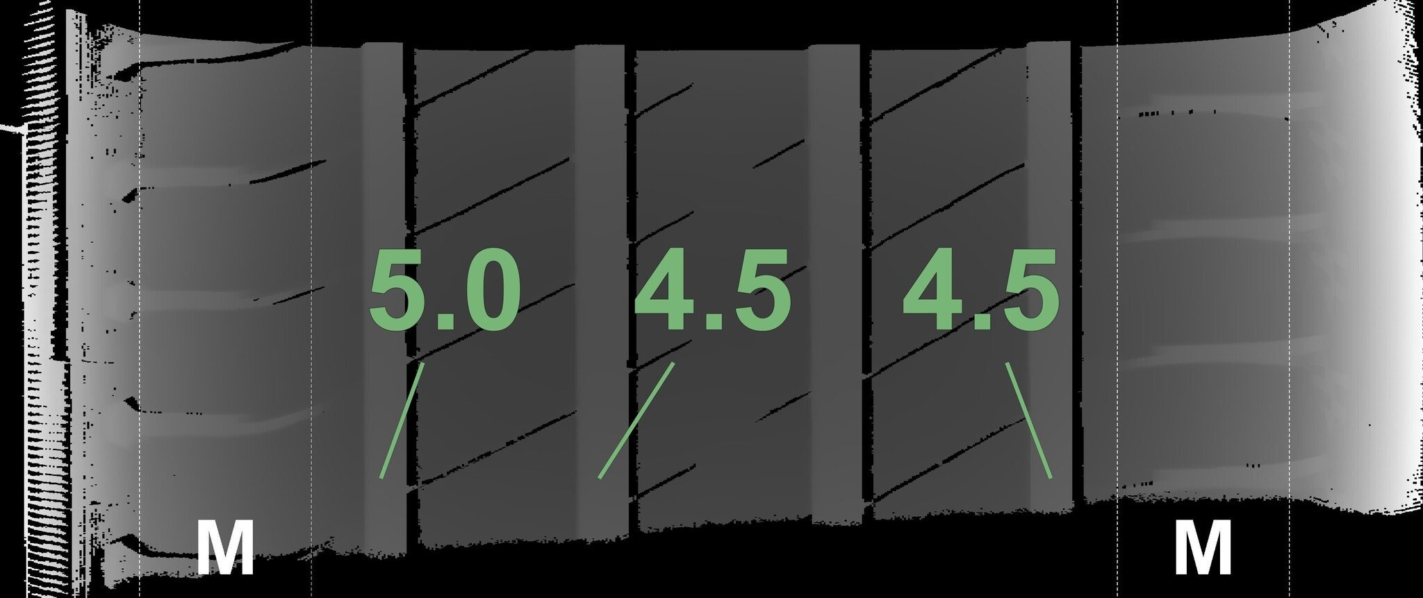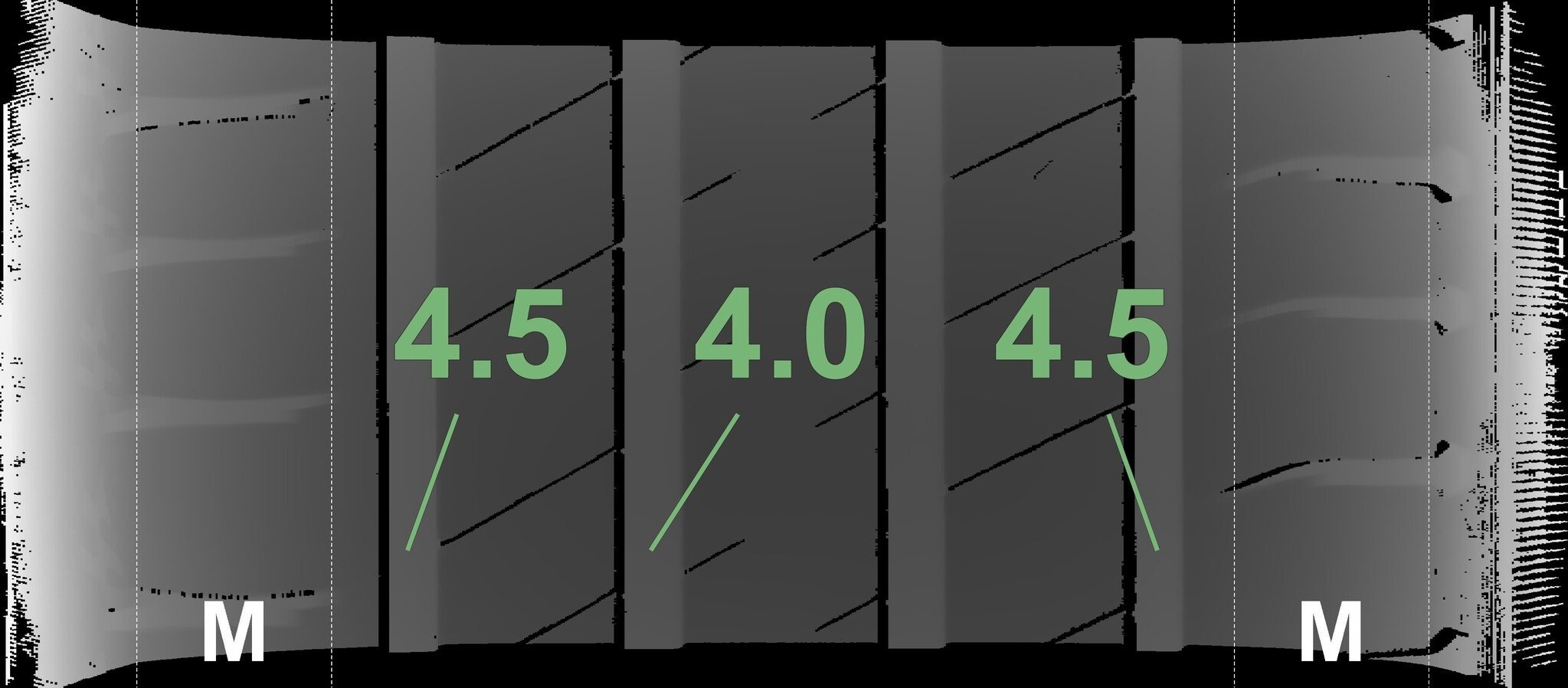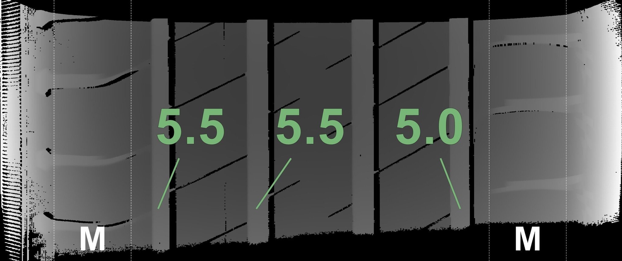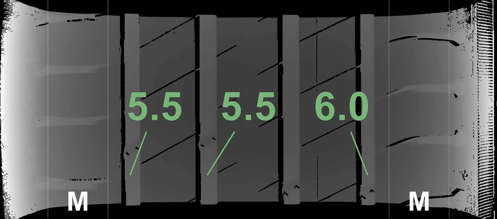 De gemeten profieldieptes en de details van de velgen zijn hierboven weergegeven.