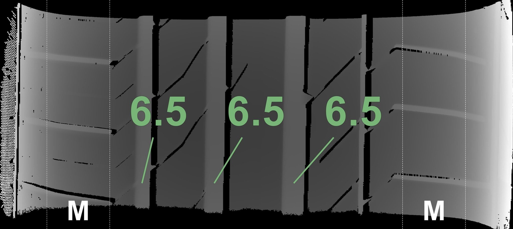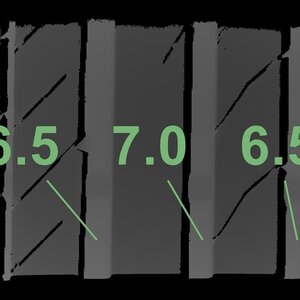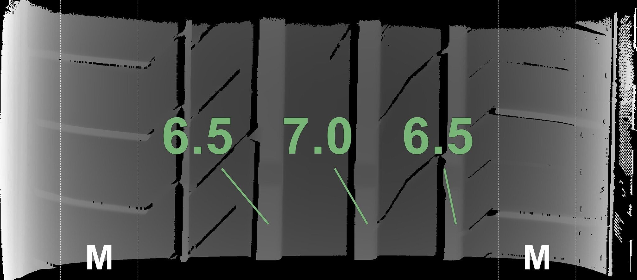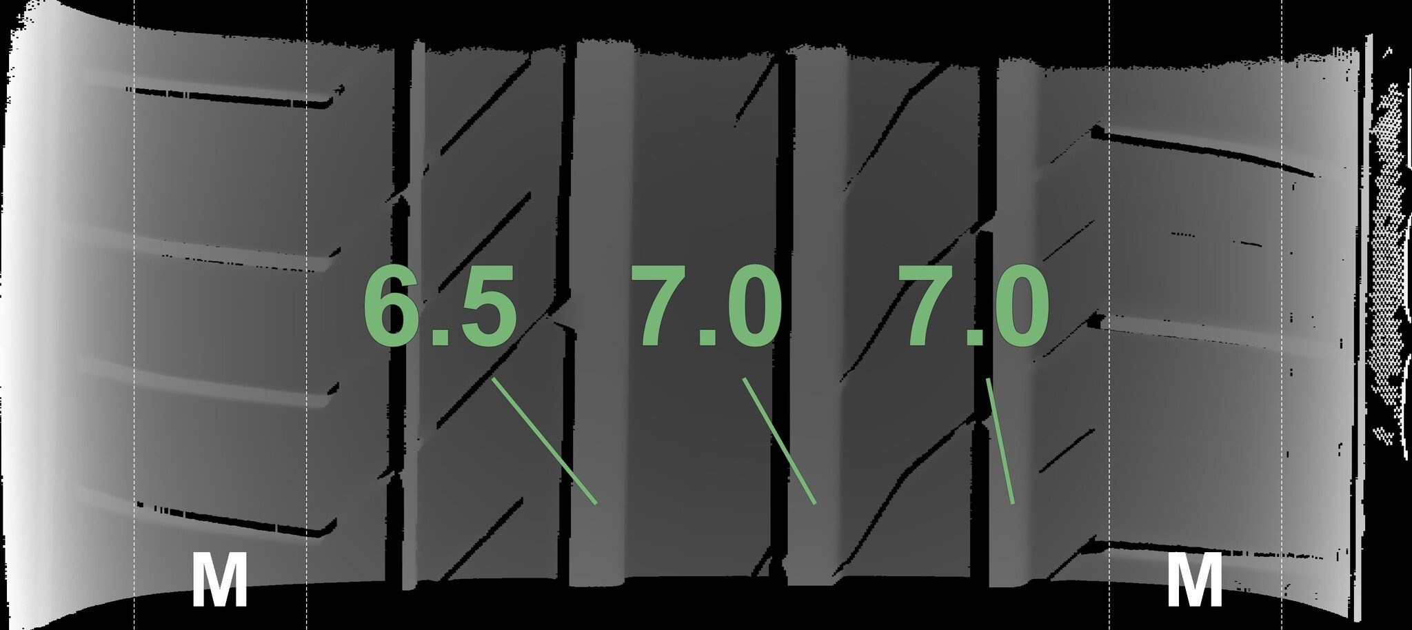 De gemeten profieldieptes en de details van de velgen zijn hierboven weergegeven.