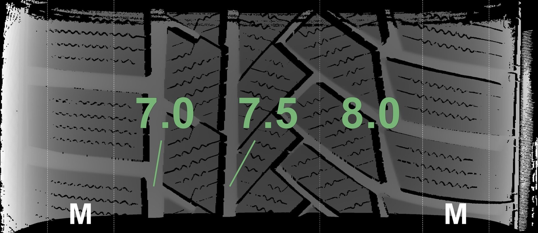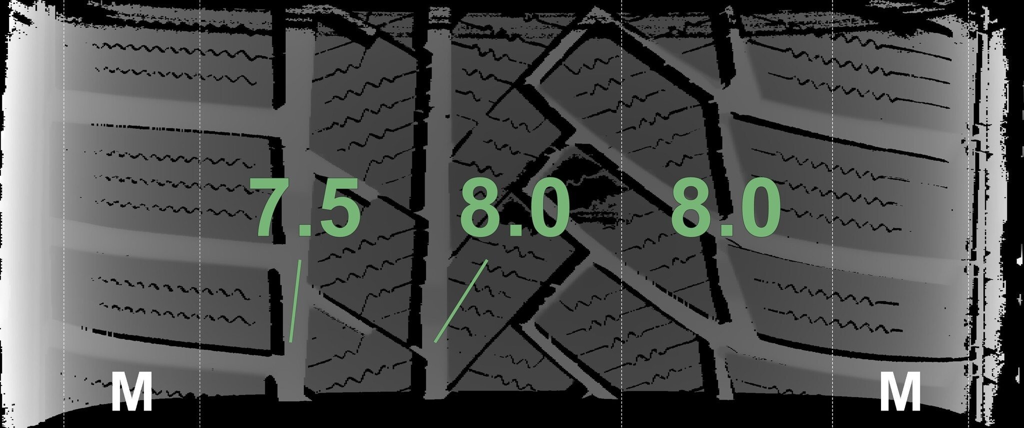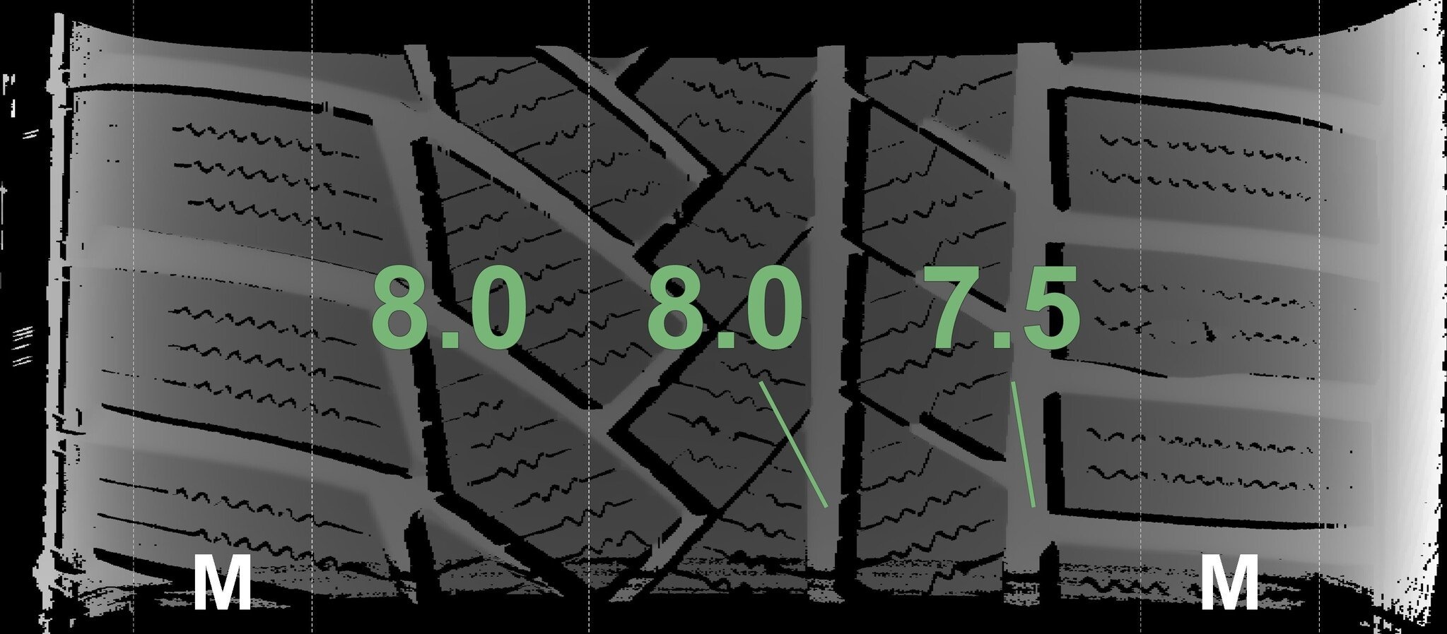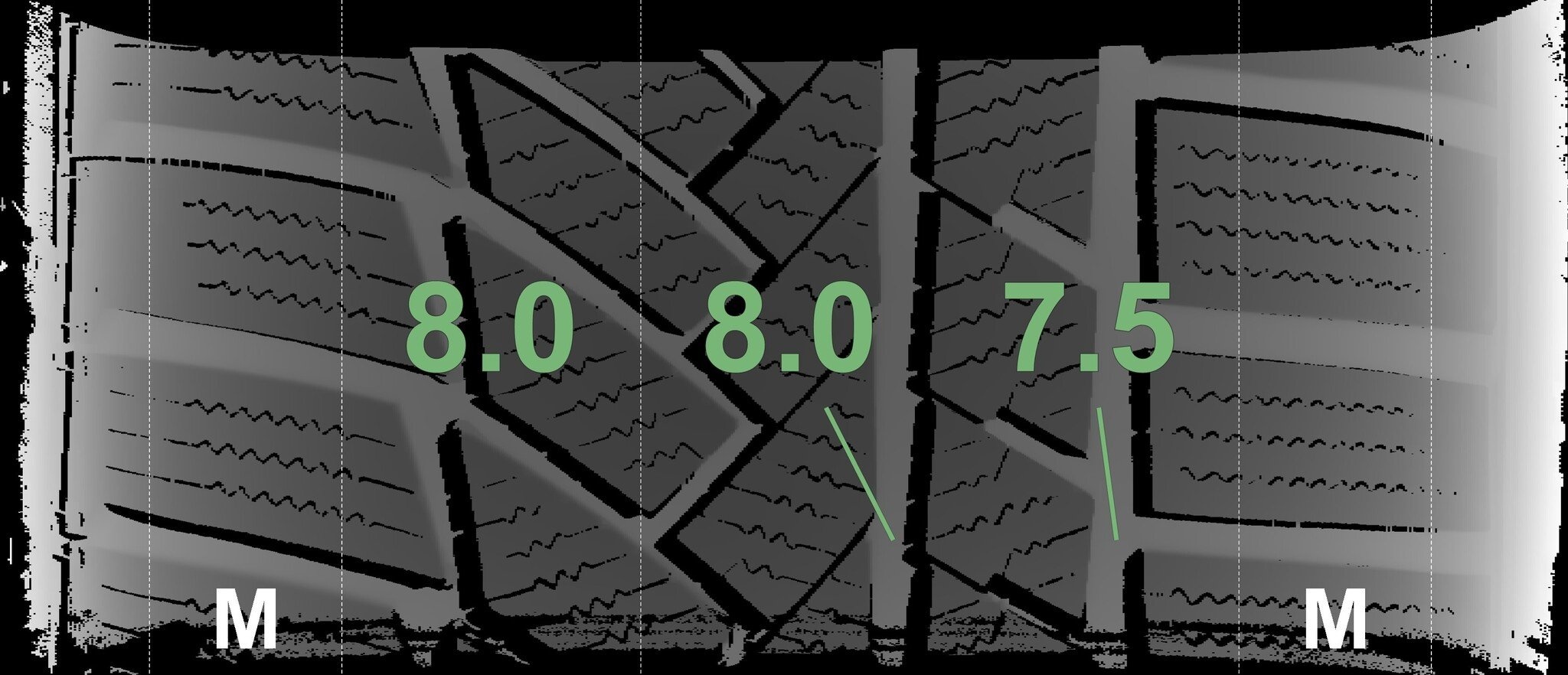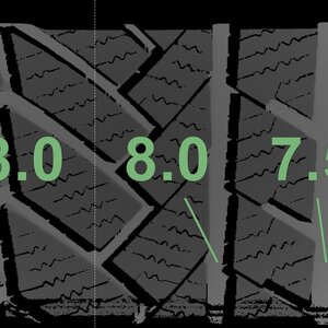 De gemeten profieldieptes en de details van de velgen zijn hierboven weergegeven.
