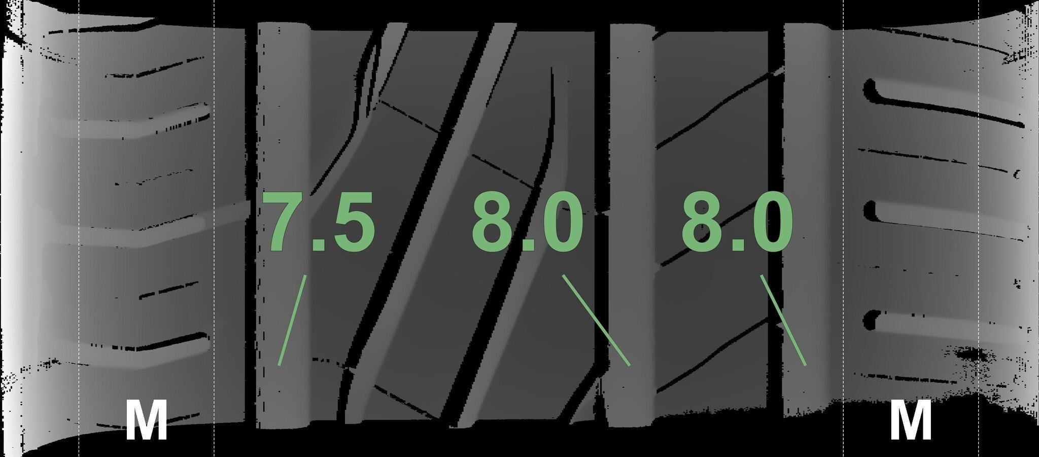 De gemeten profieldieptes en de details van de velgen zijn hierboven weergegeven.