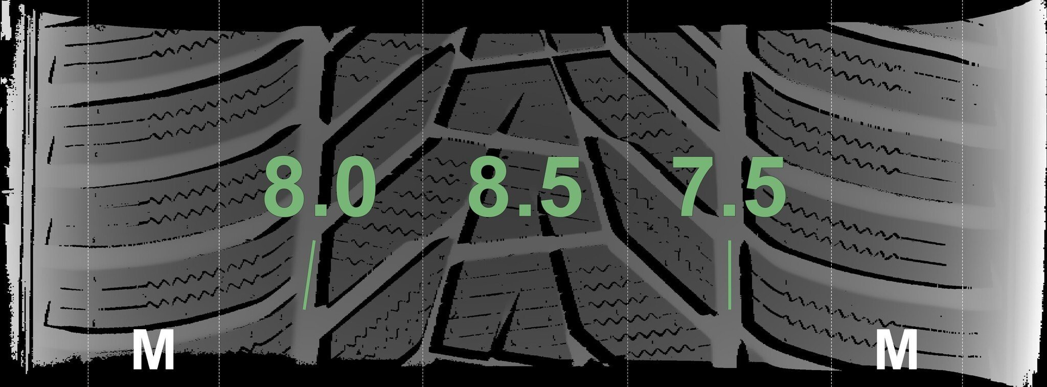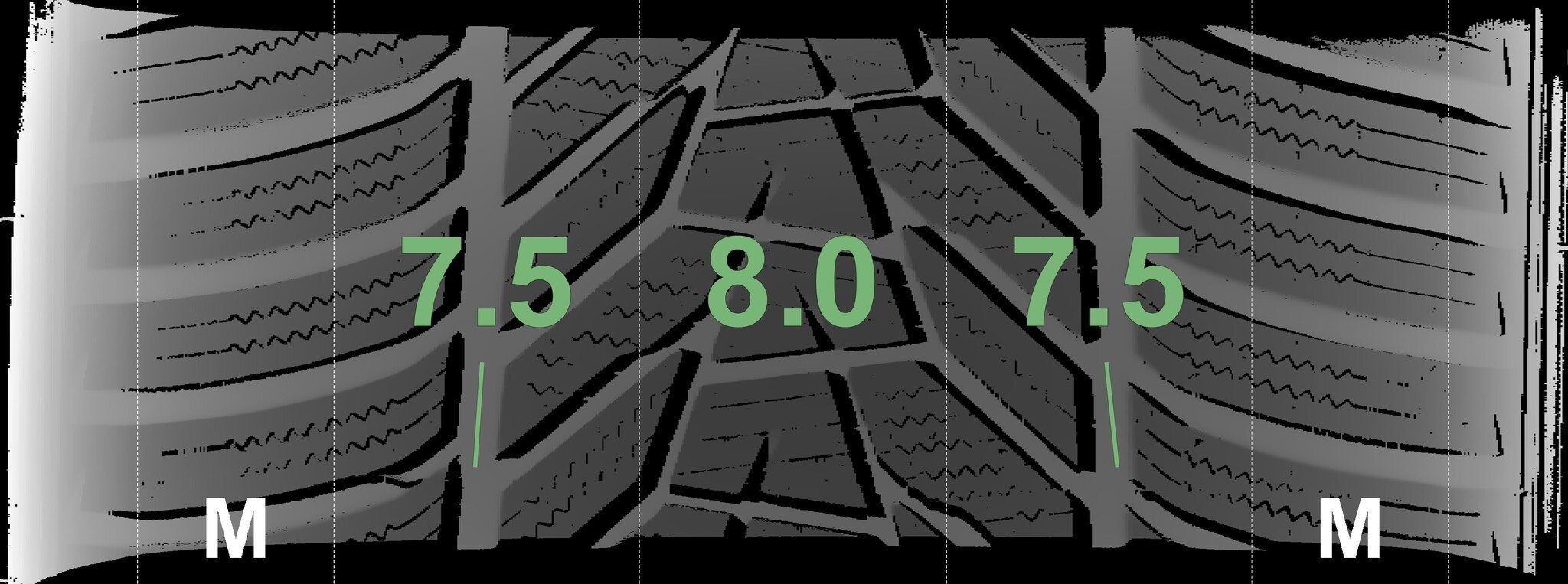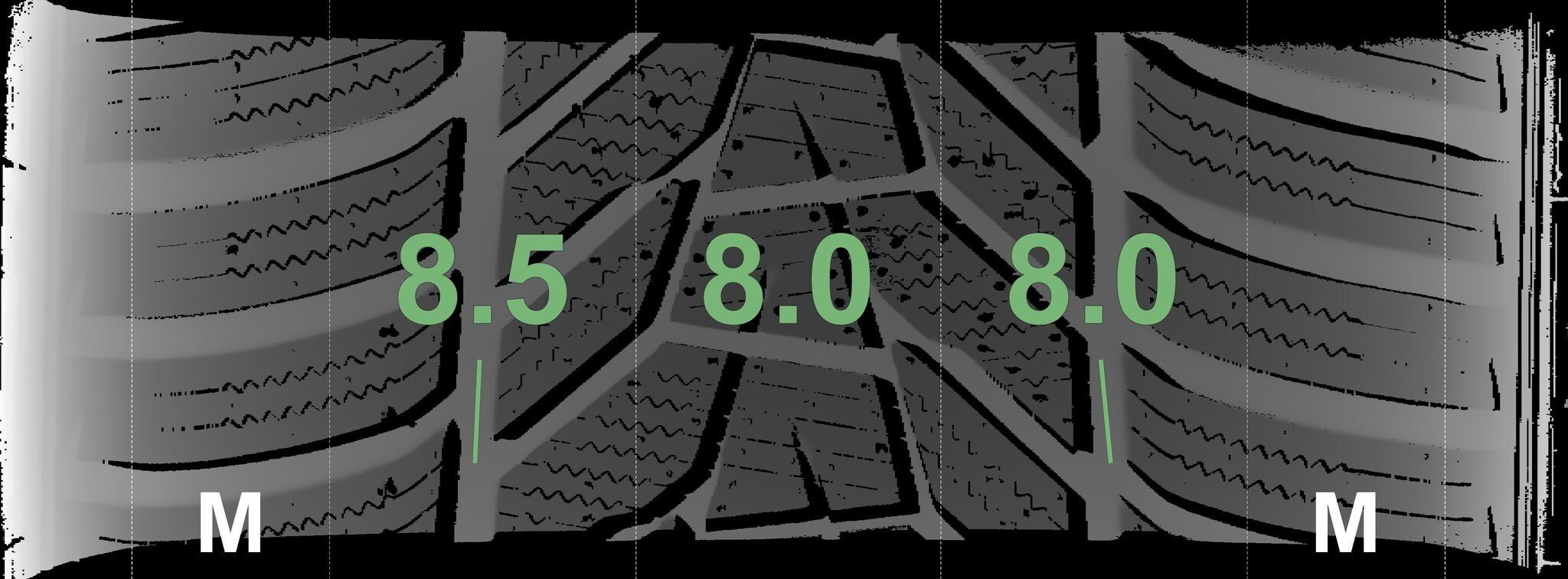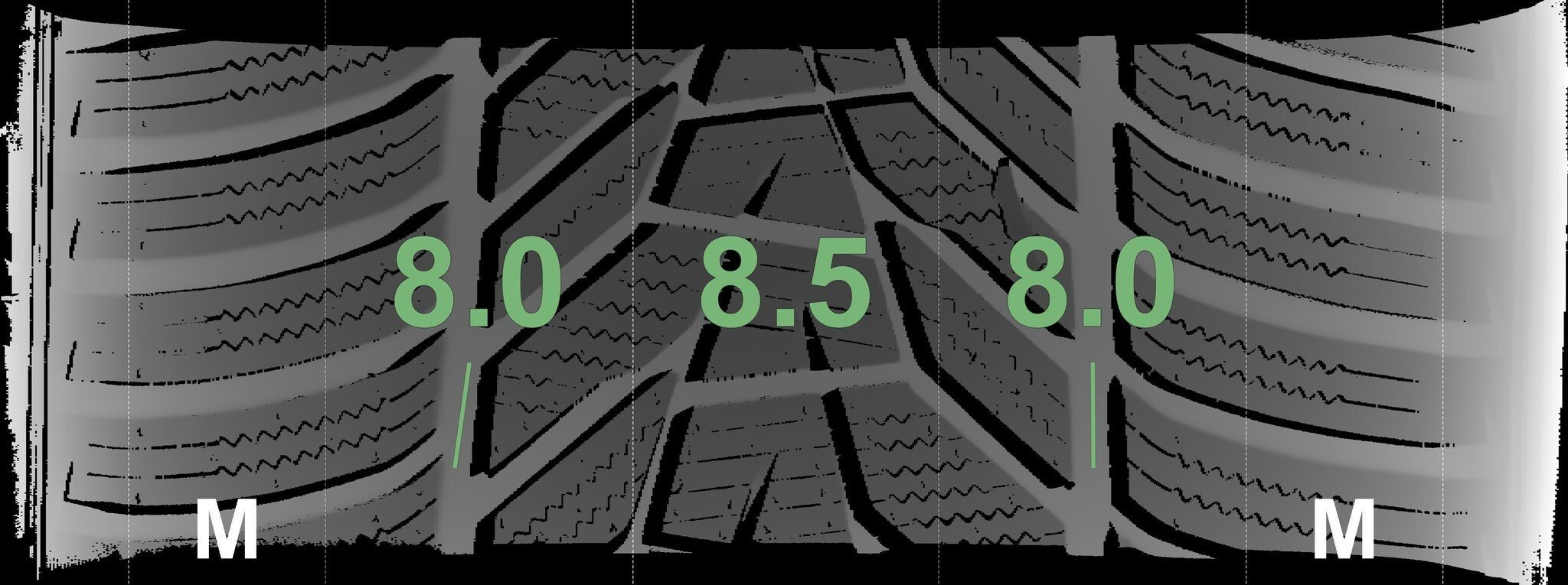 De gemeten profieldieptes en de details van de velgen zijn hierboven weergegeven.