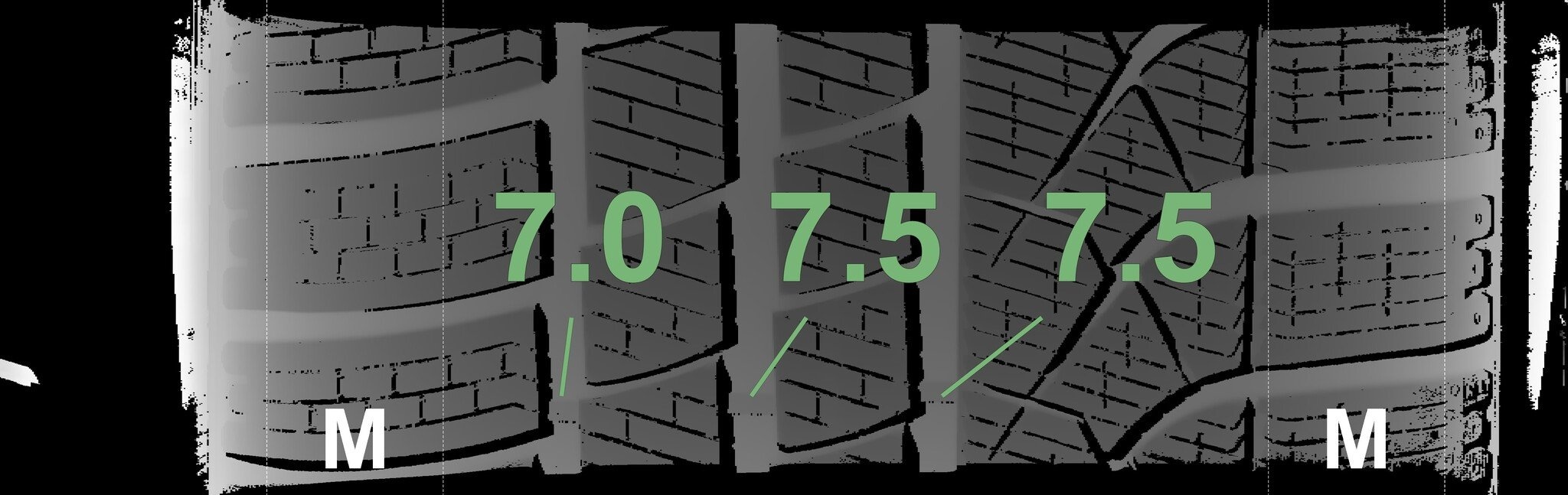 De gemeten profieldieptes en de details van de velgen zijn hierboven weergegeven.