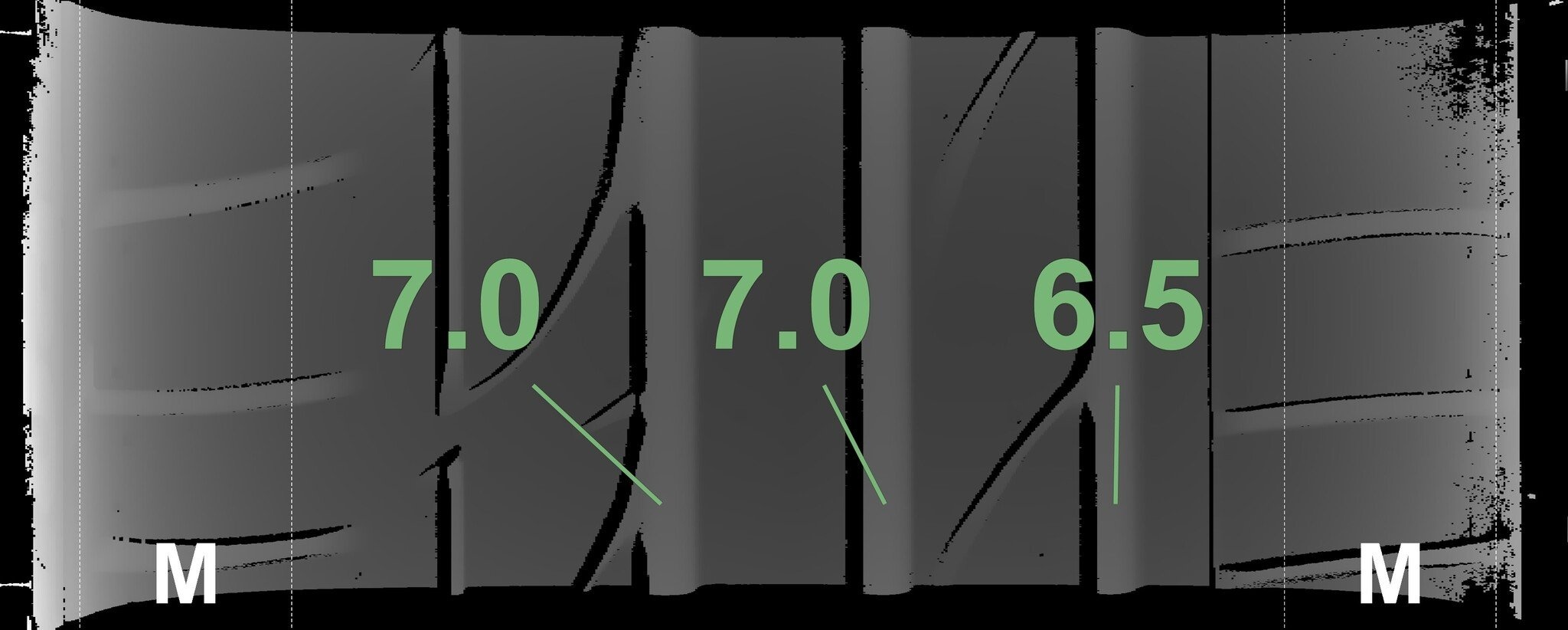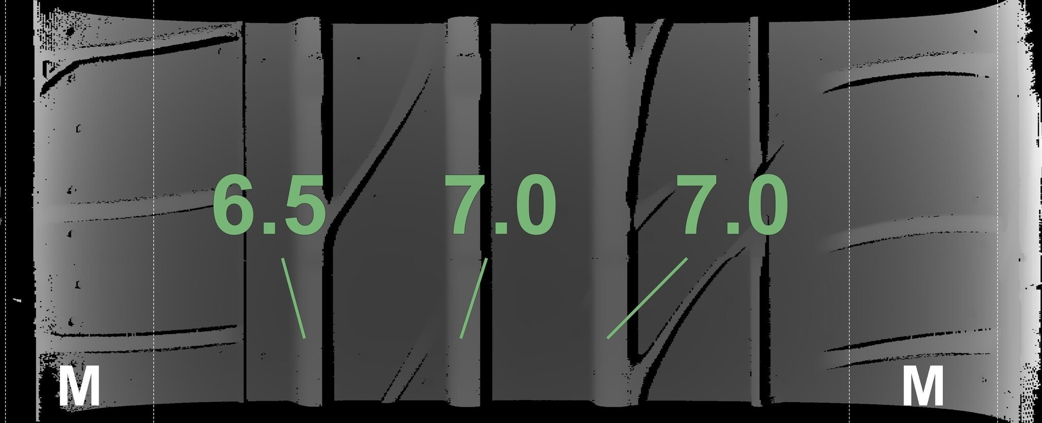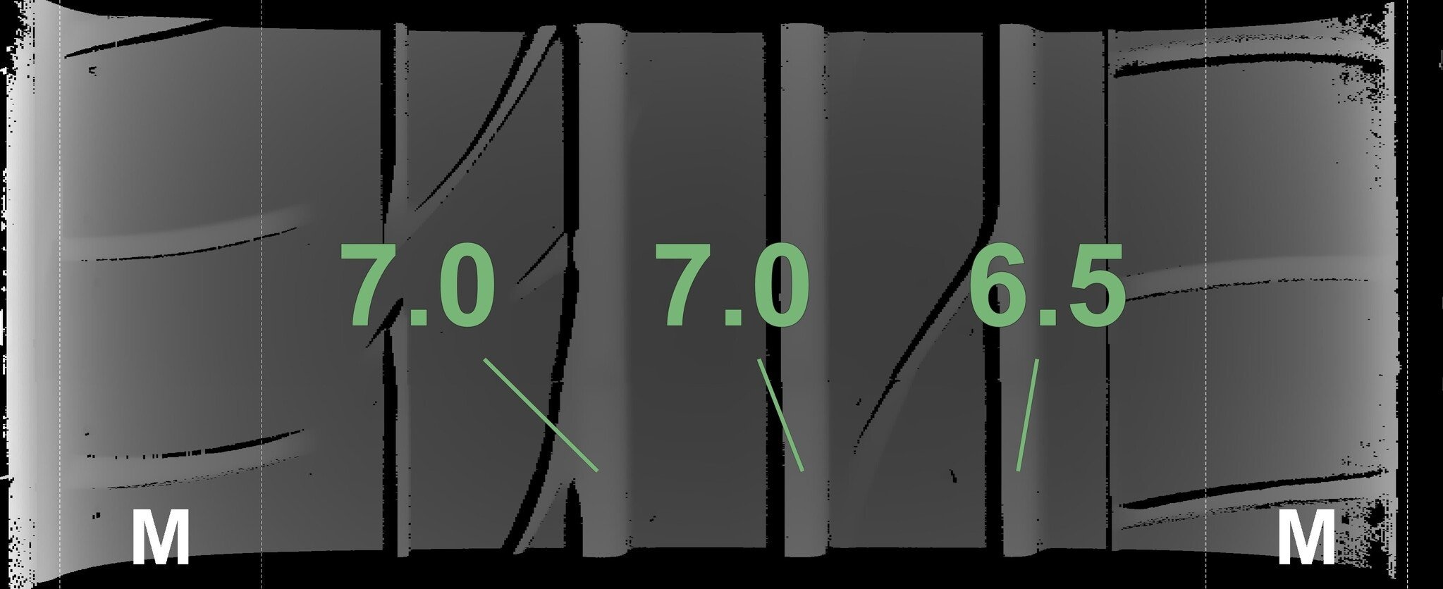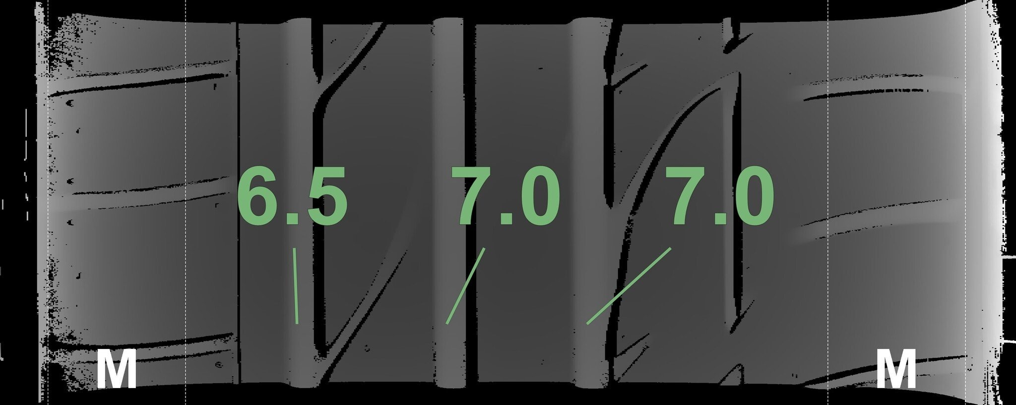 De gemeten profieldieptes en de details van de velgen zijn hierboven weergegeven.