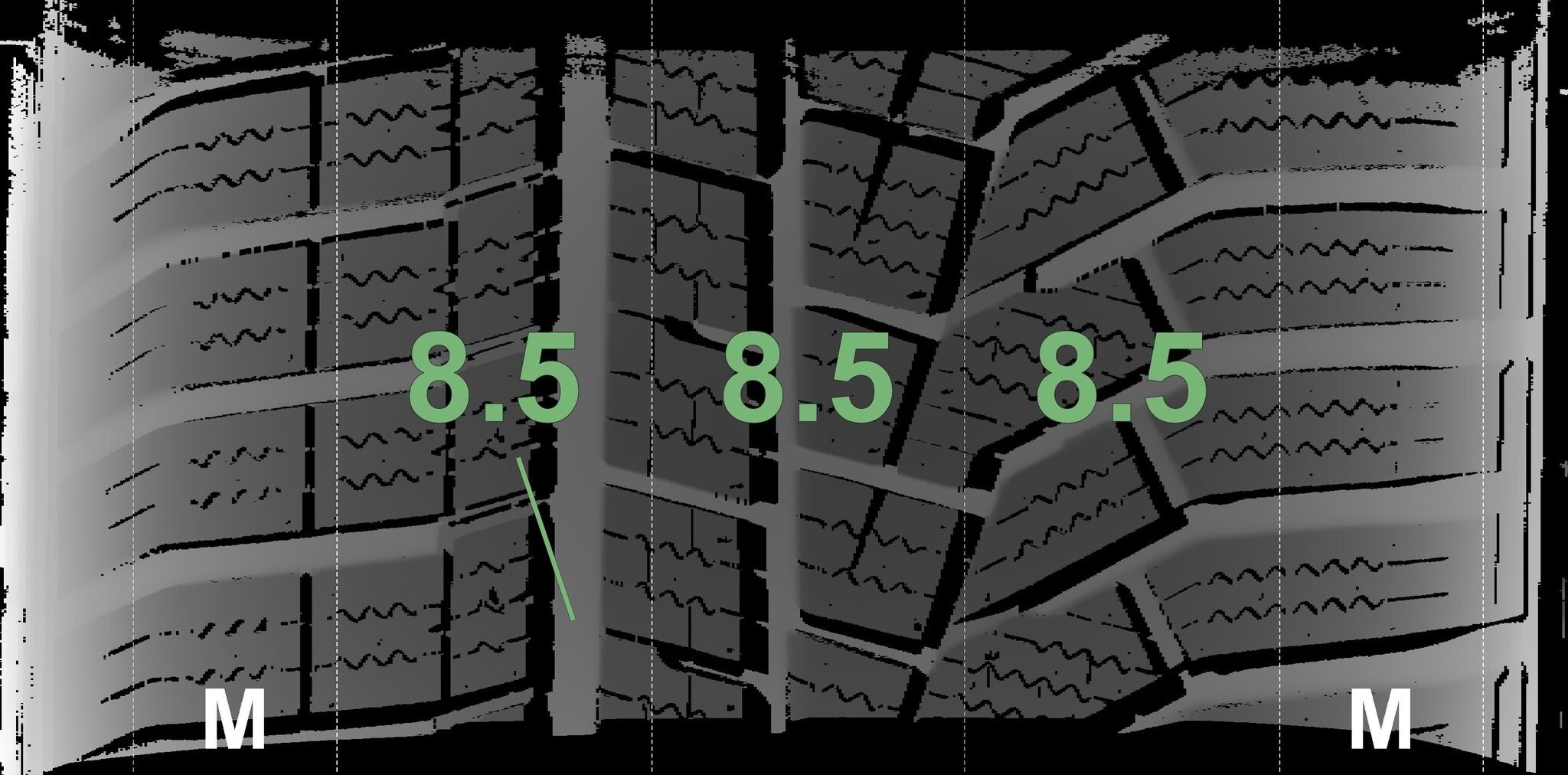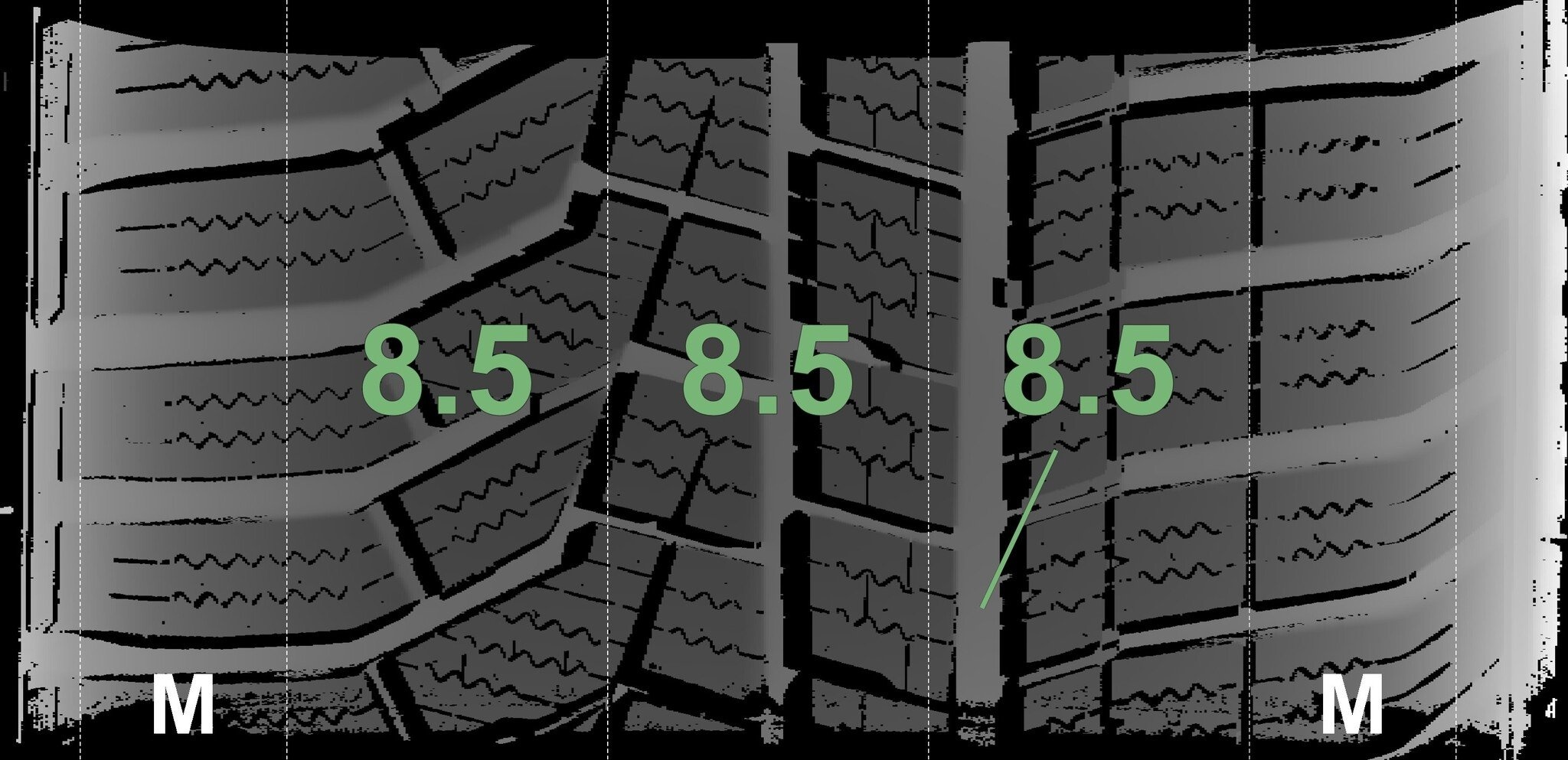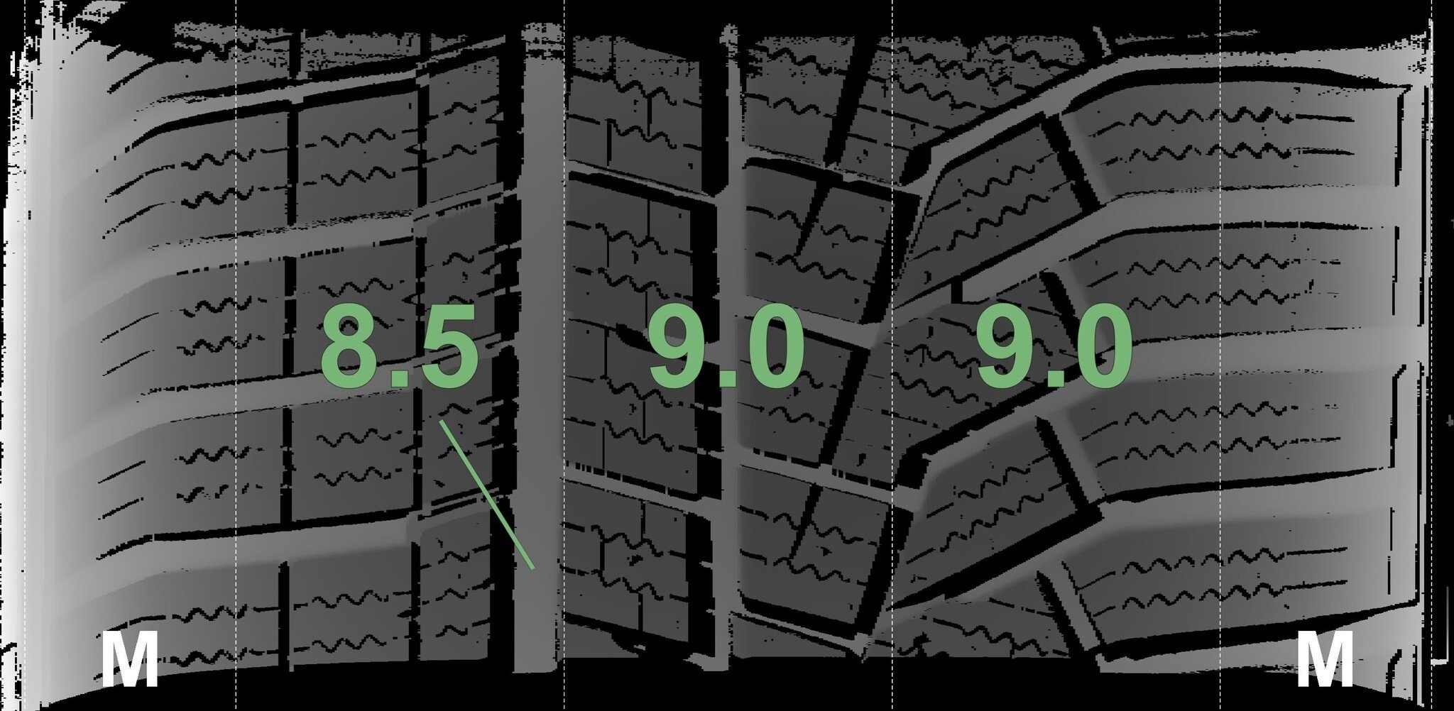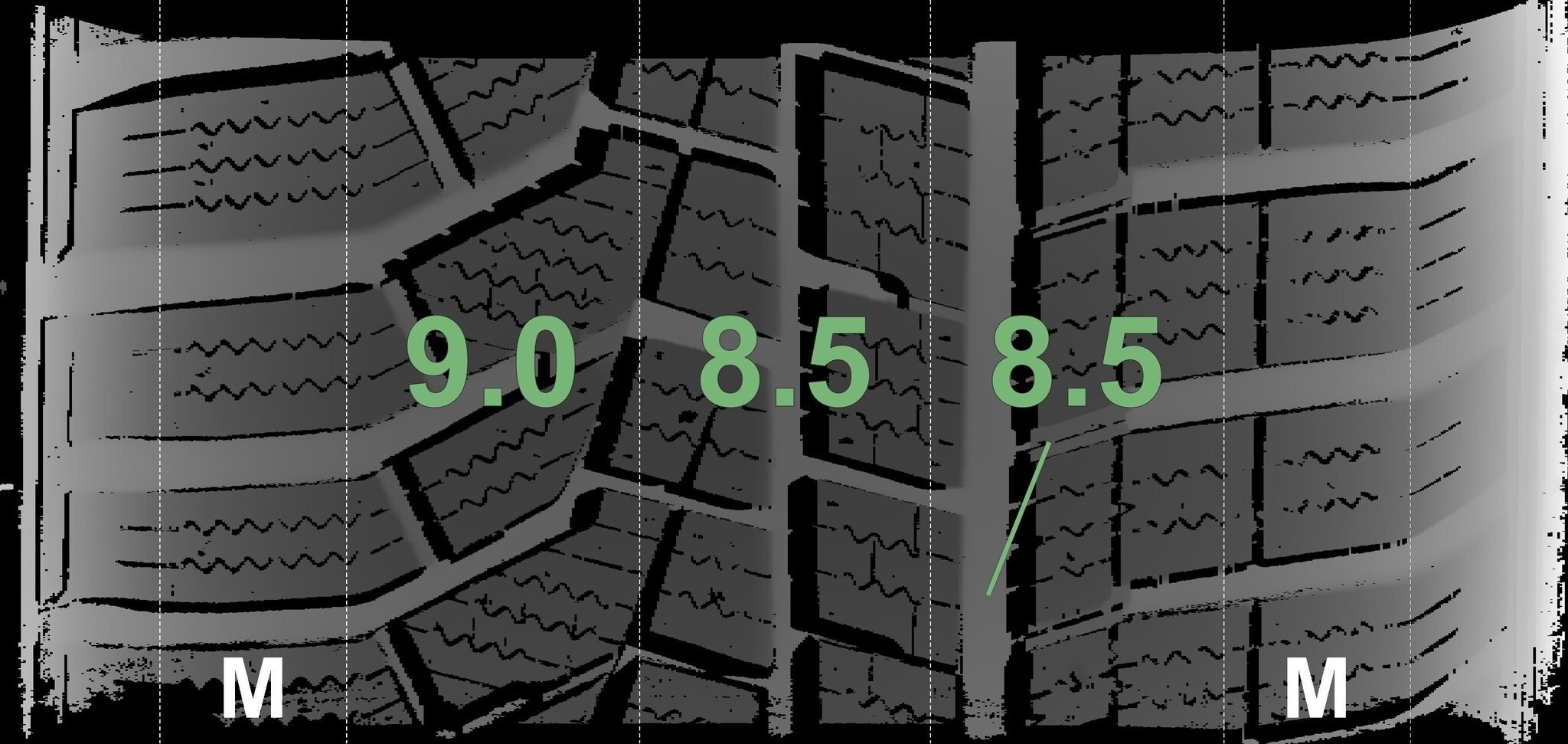 De gemeten profieldieptes en de details van de velgen zijn hierboven weergegeven.