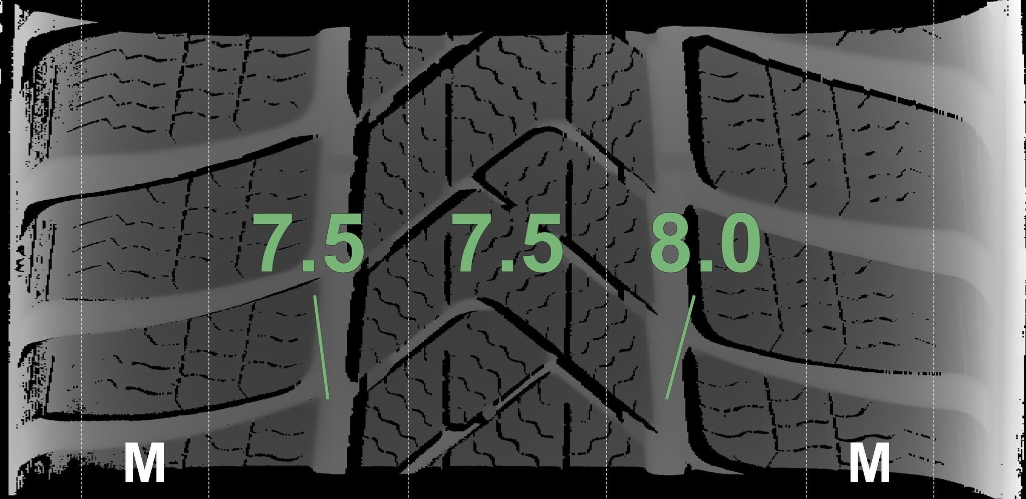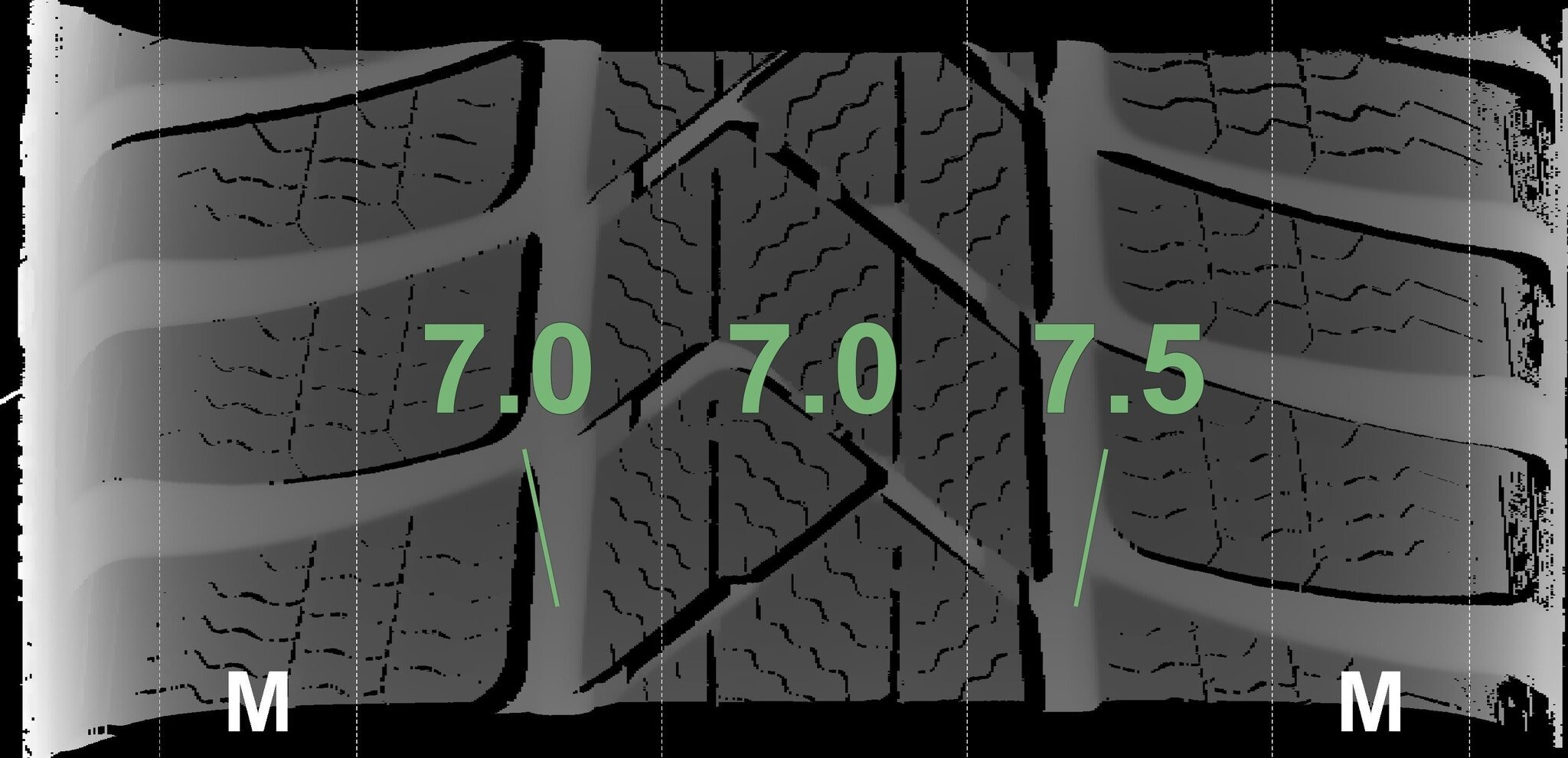 De gemeten profieldieptes en de details van de velgen zijn hierboven weergegeven.
