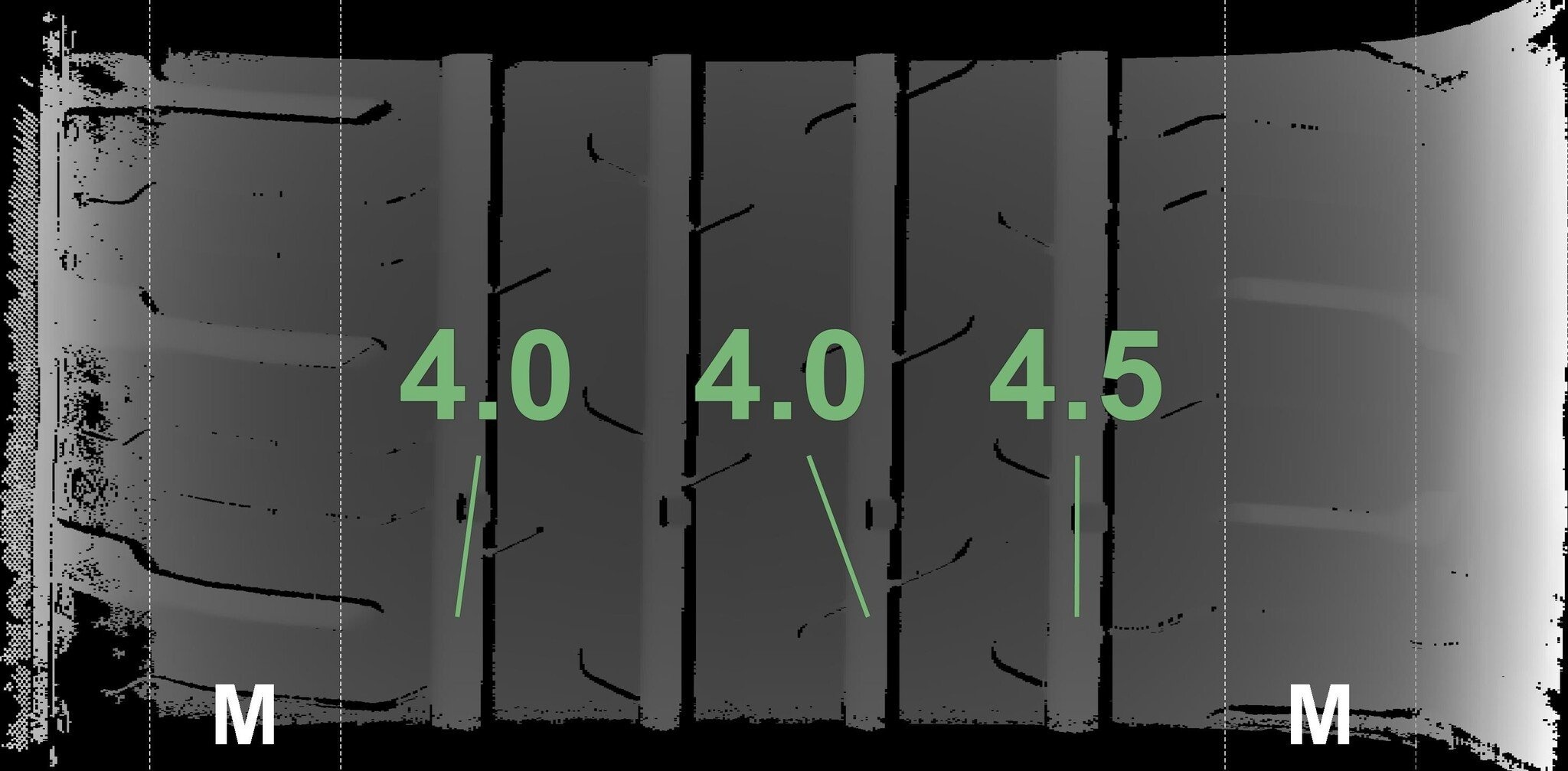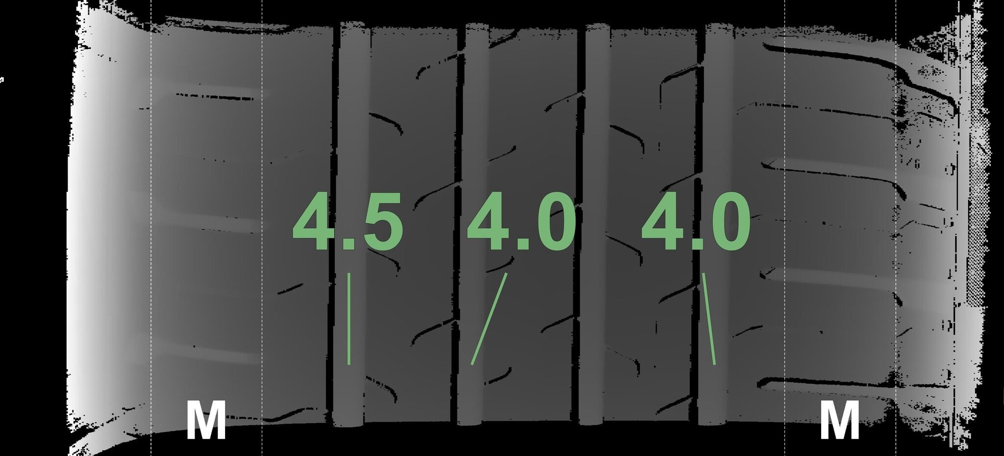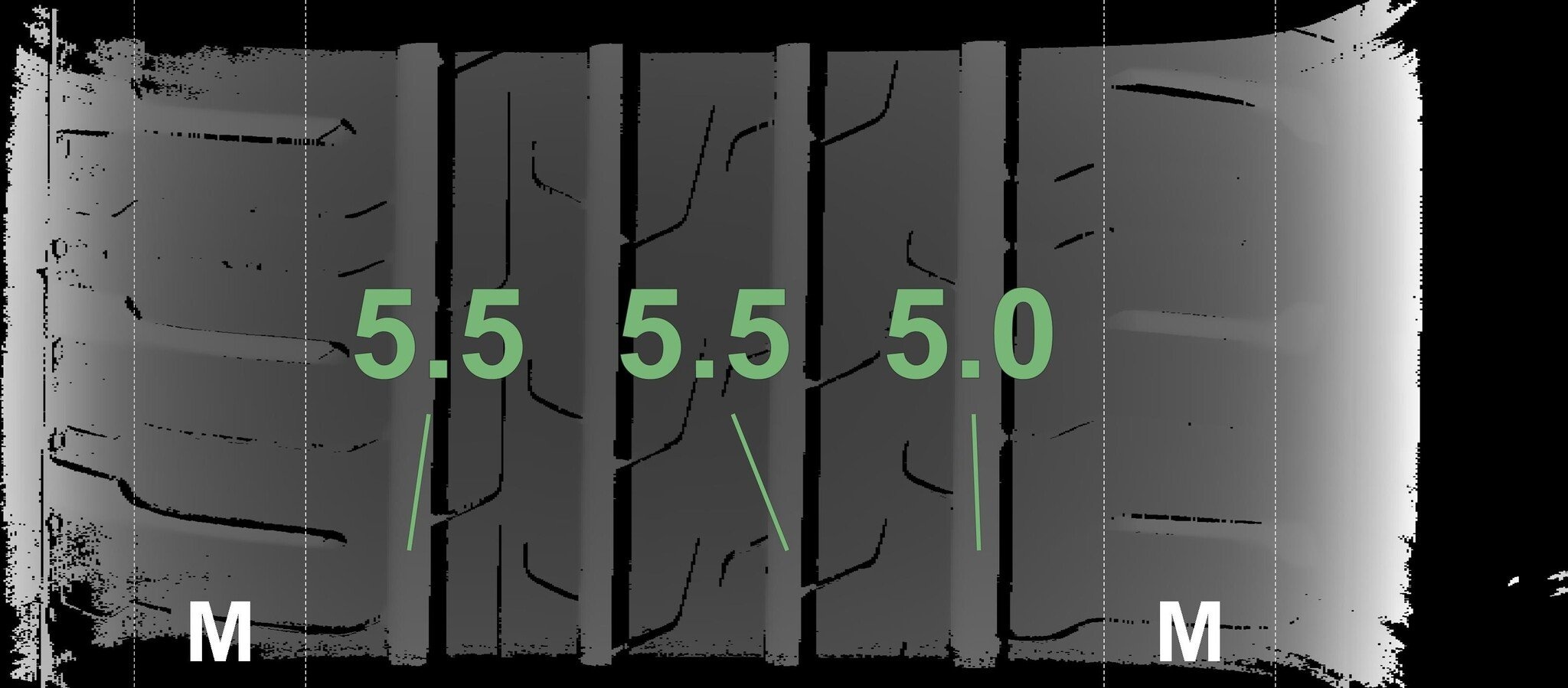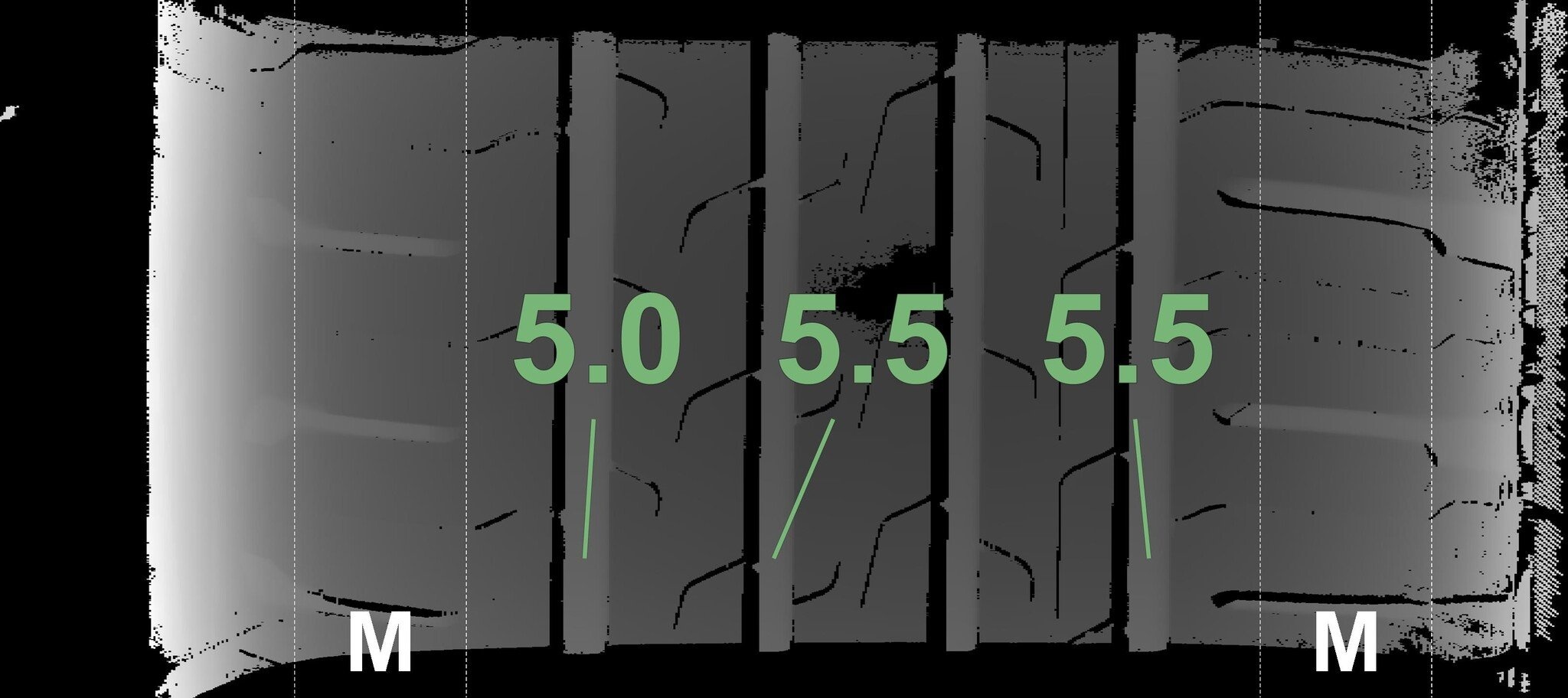 De gemeten profieldieptes en de details van de velgen zijn hierboven weergegeven.