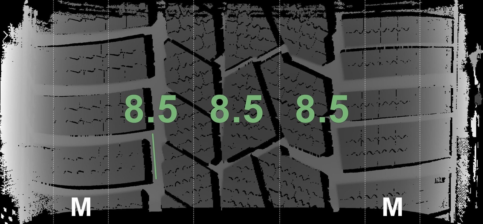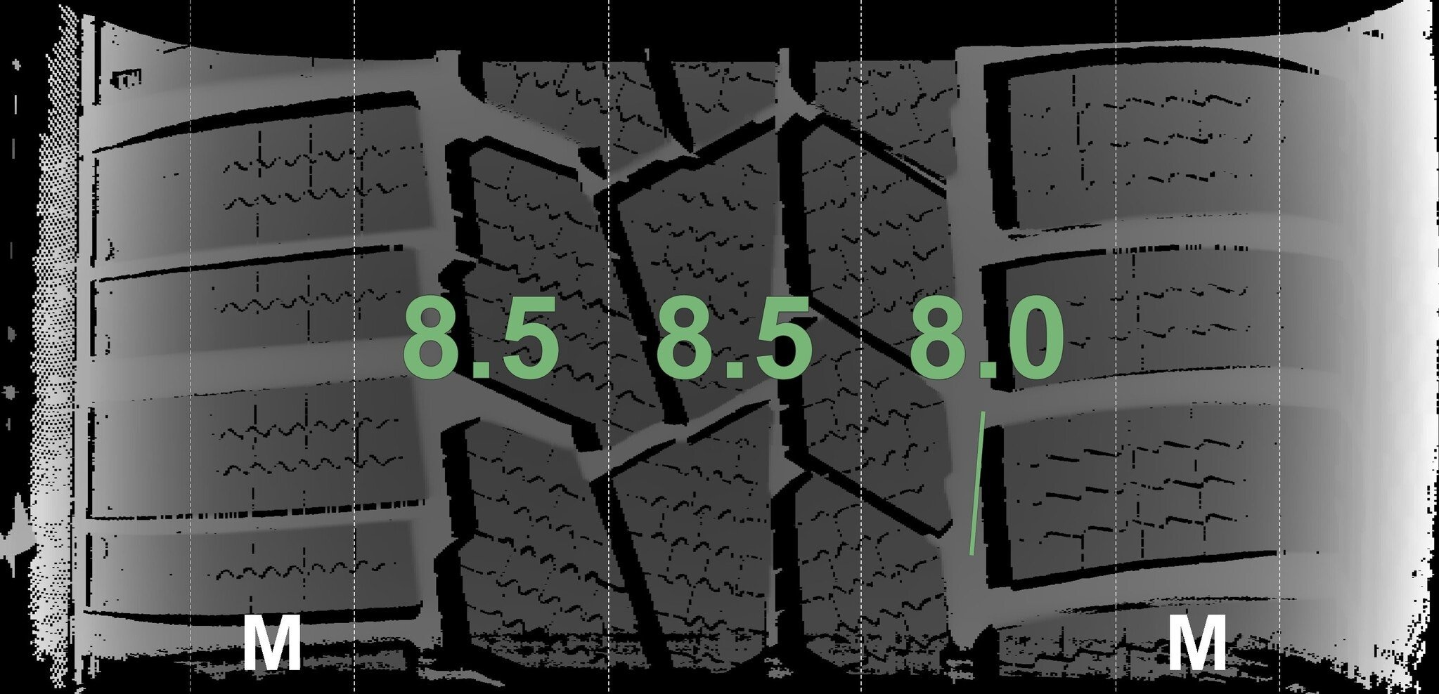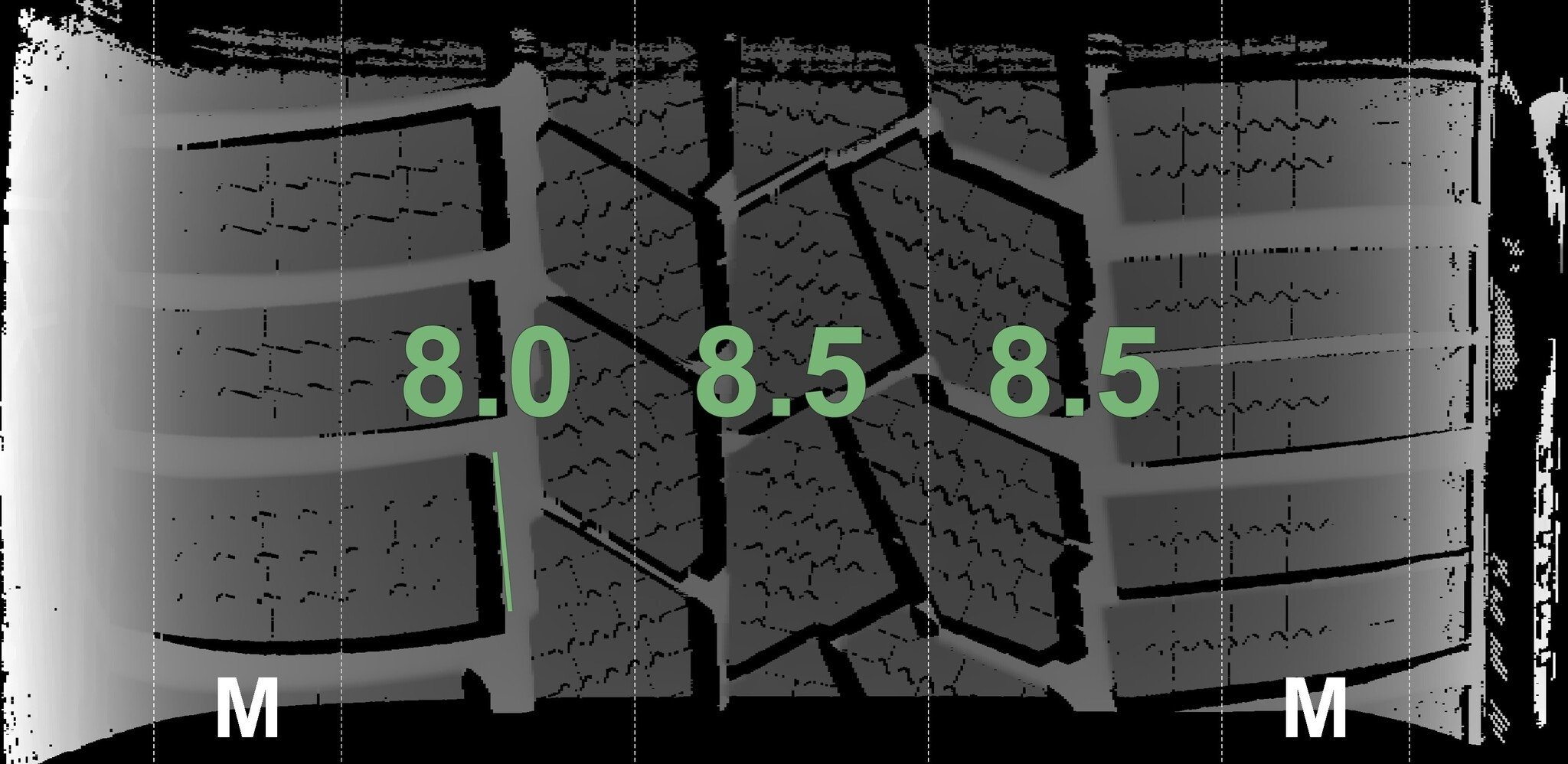 De gemeten profieldieptes en de details van de velgen zijn hierboven weergegeven.
