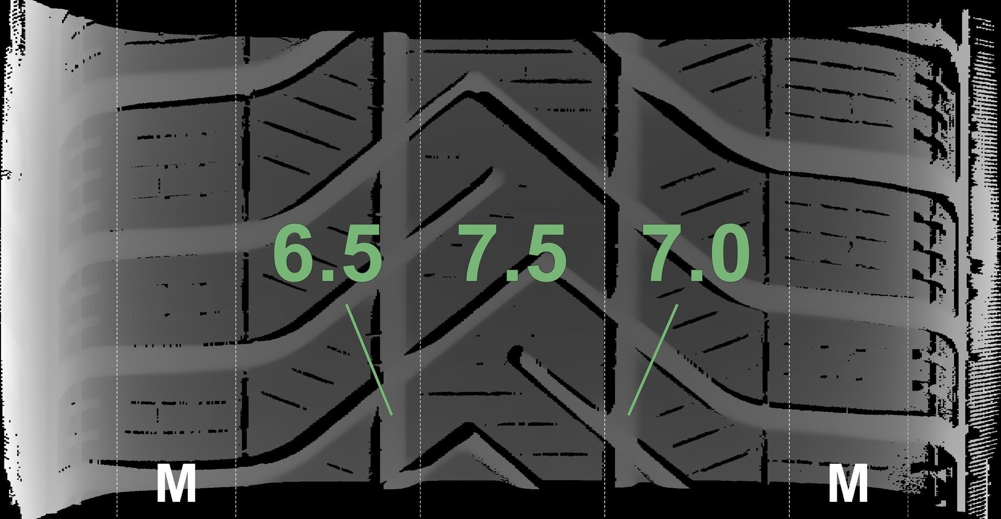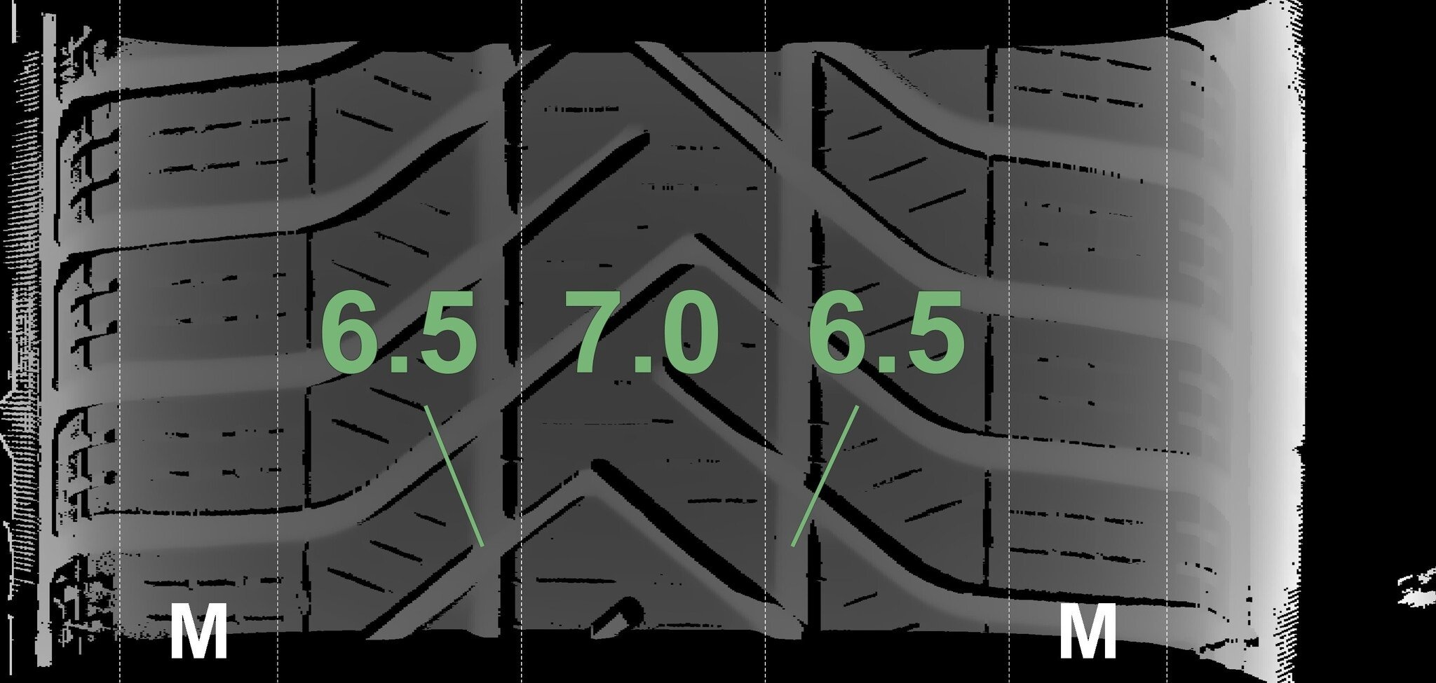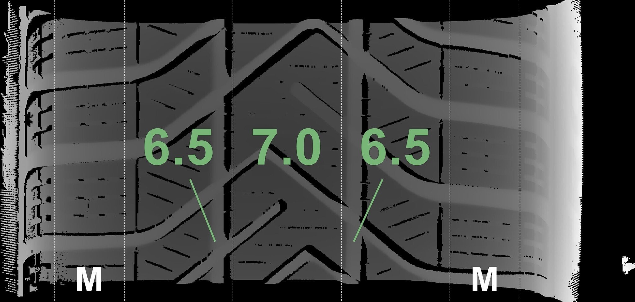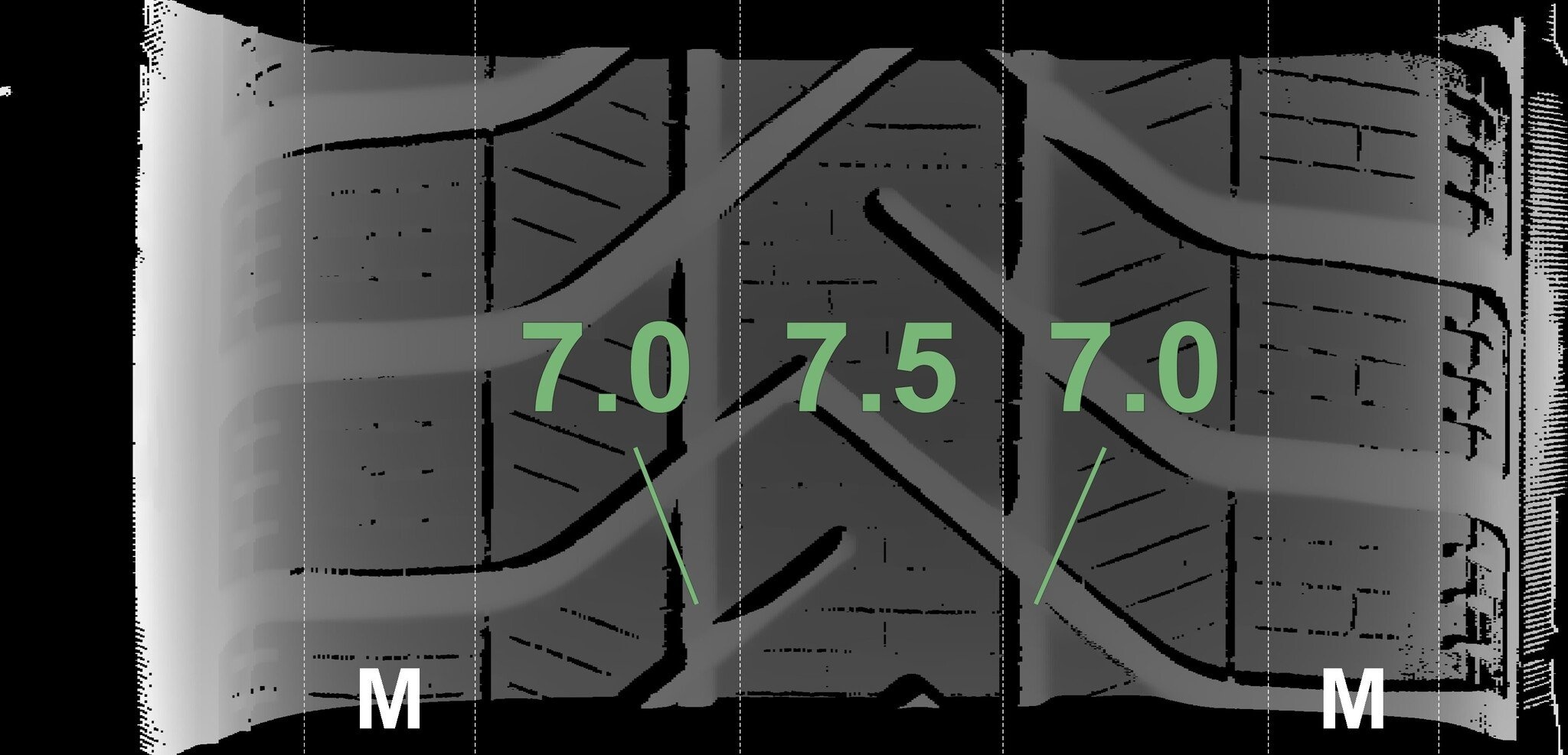 De gemeten profieldieptes en de details van de velgen zijn hierboven weergegeven.