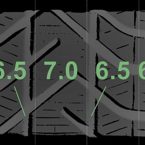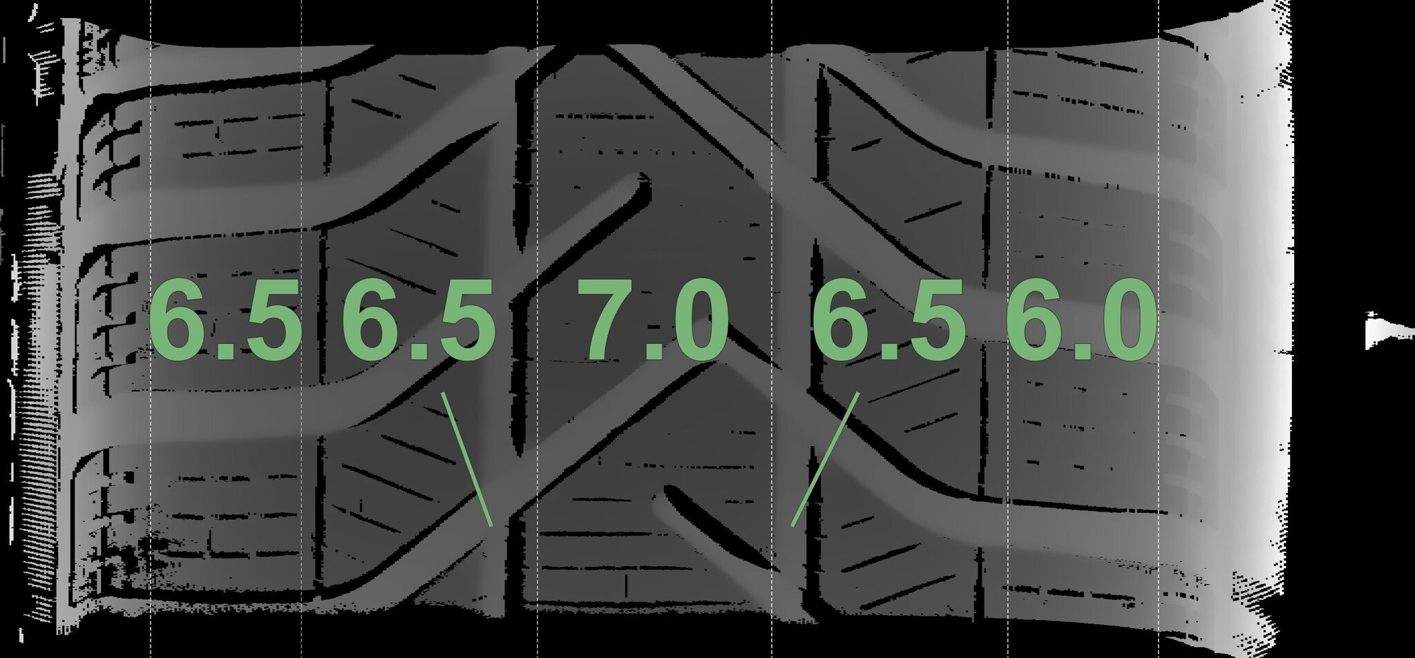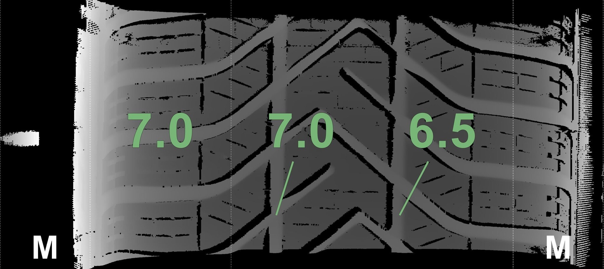 De gemeten profieldieptes en de details van de velgen zijn hierboven weergegeven.