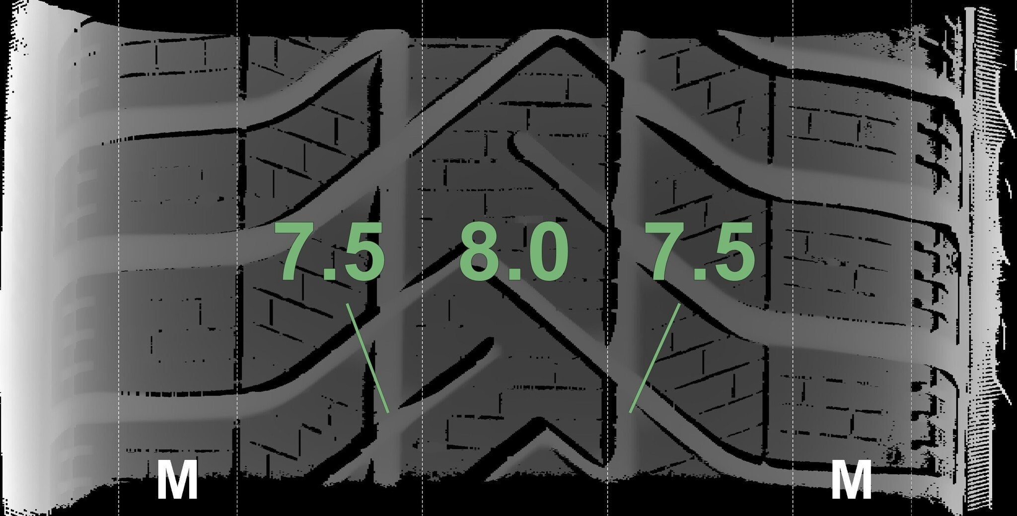 De gemeten profieldieptes en de details van de velgen zijn hierboven weergegeven.