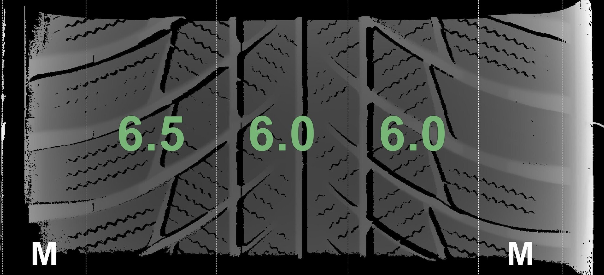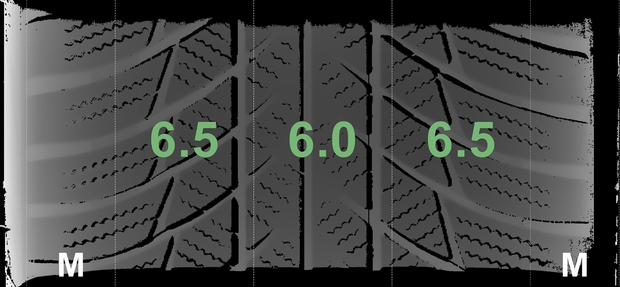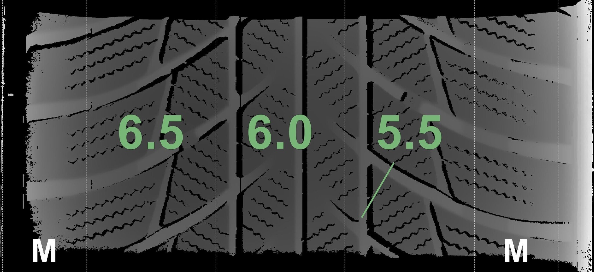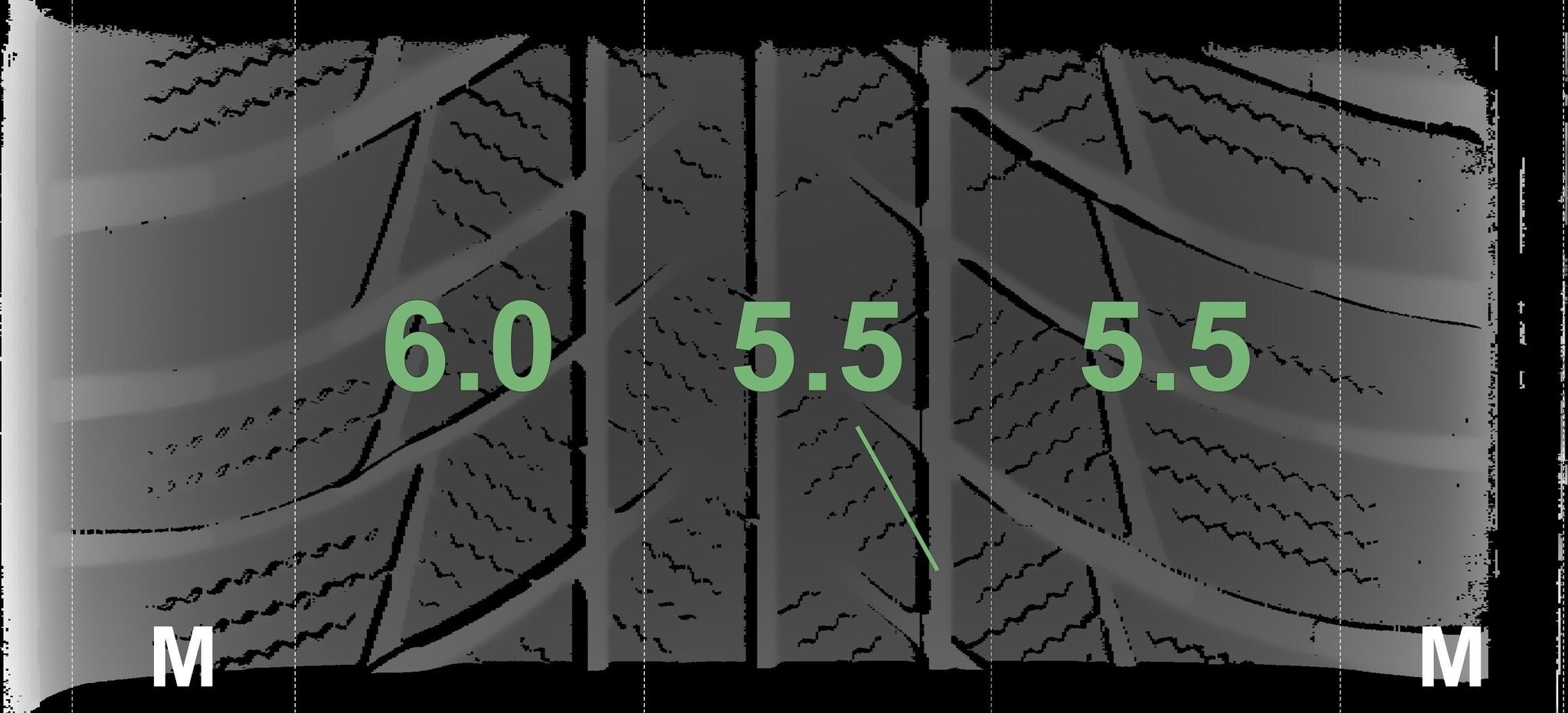 De gemeten profieldieptes en de details van de velgen zijn hierboven weergegeven.