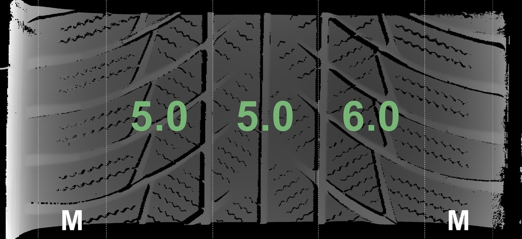 De gemeten profieldieptes en de details van de velgen zijn hierboven weergegeven.