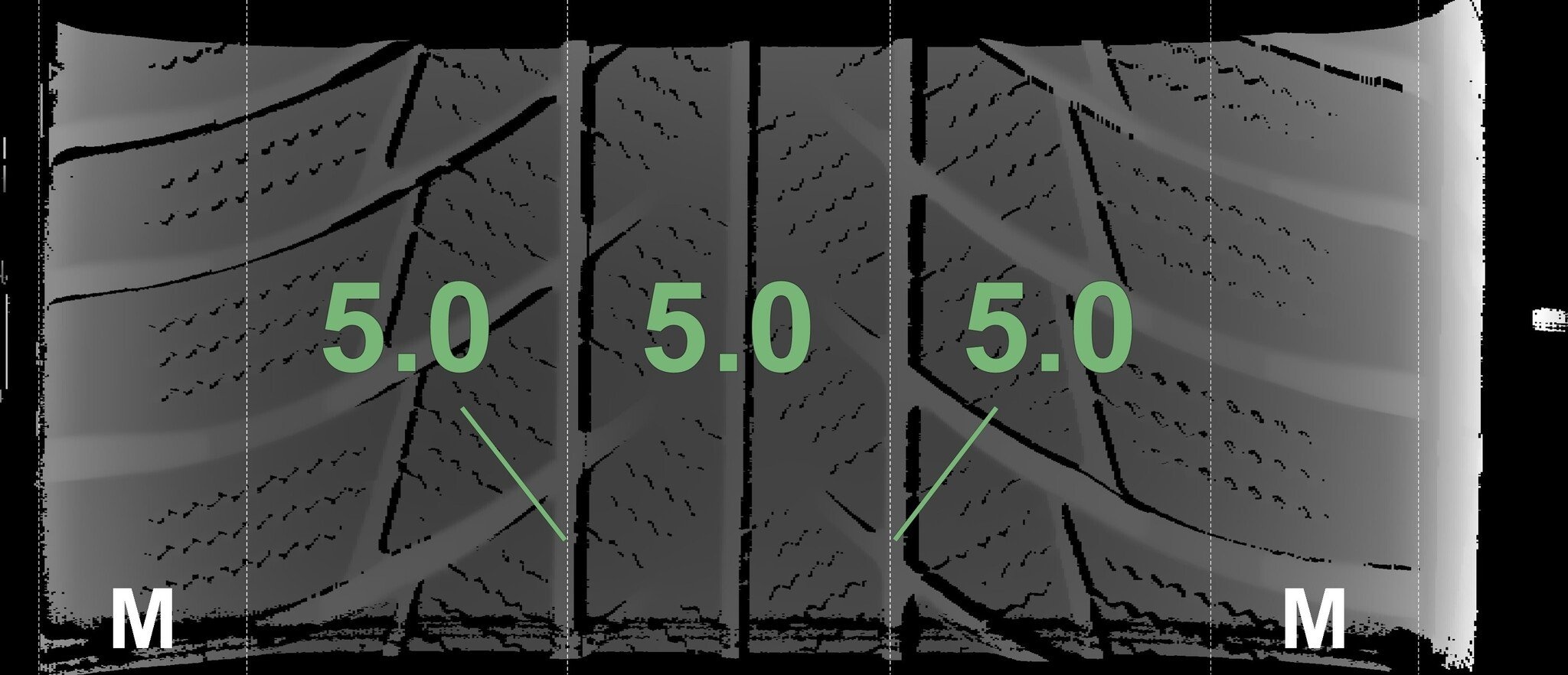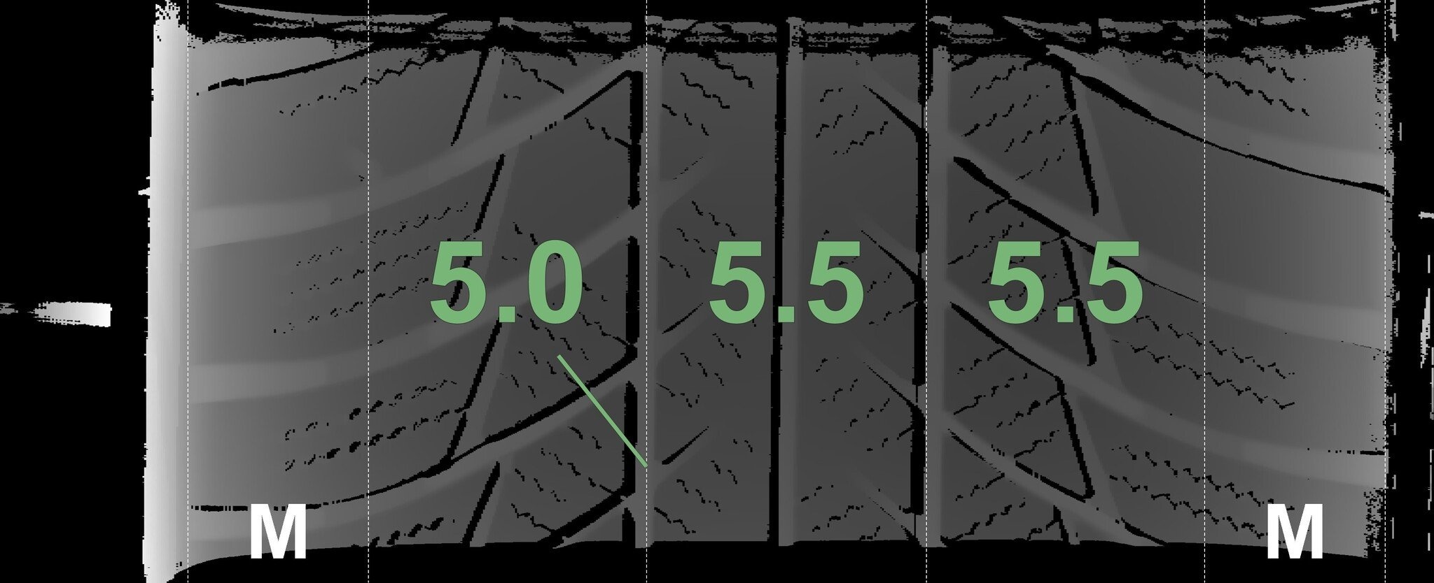 De gemeten profieldieptes en de details van de velgen zijn hierboven weergegeven.