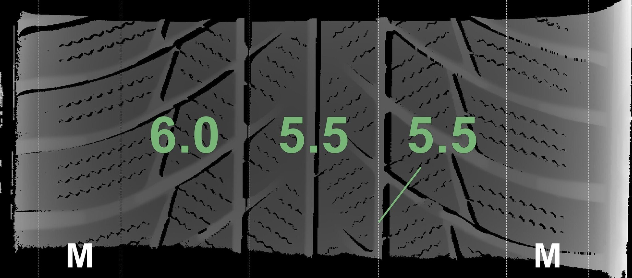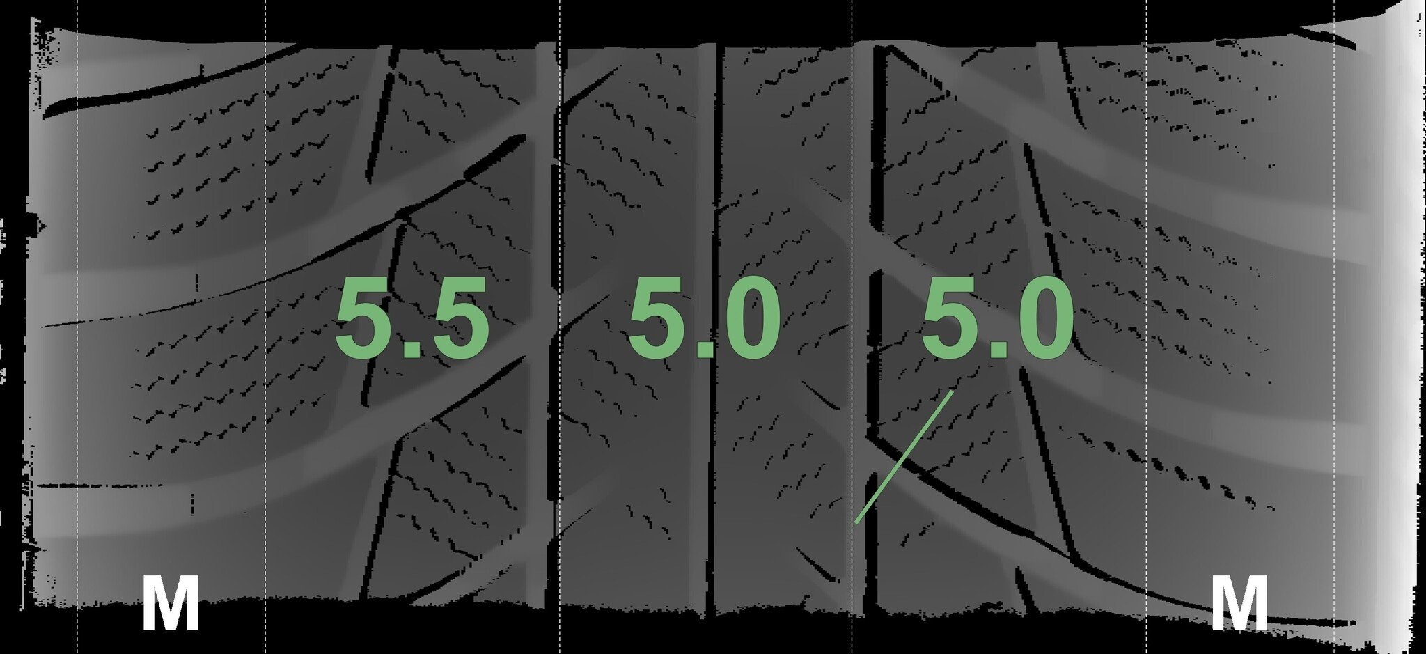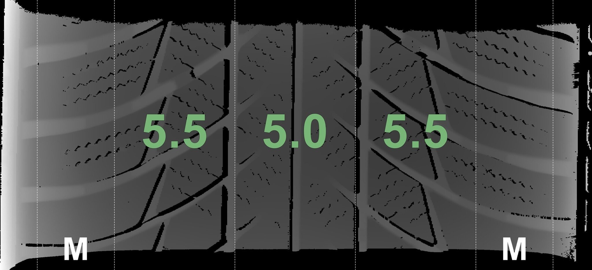 De gemeten profieldieptes en de details van de velgen zijn hierboven weergegeven.