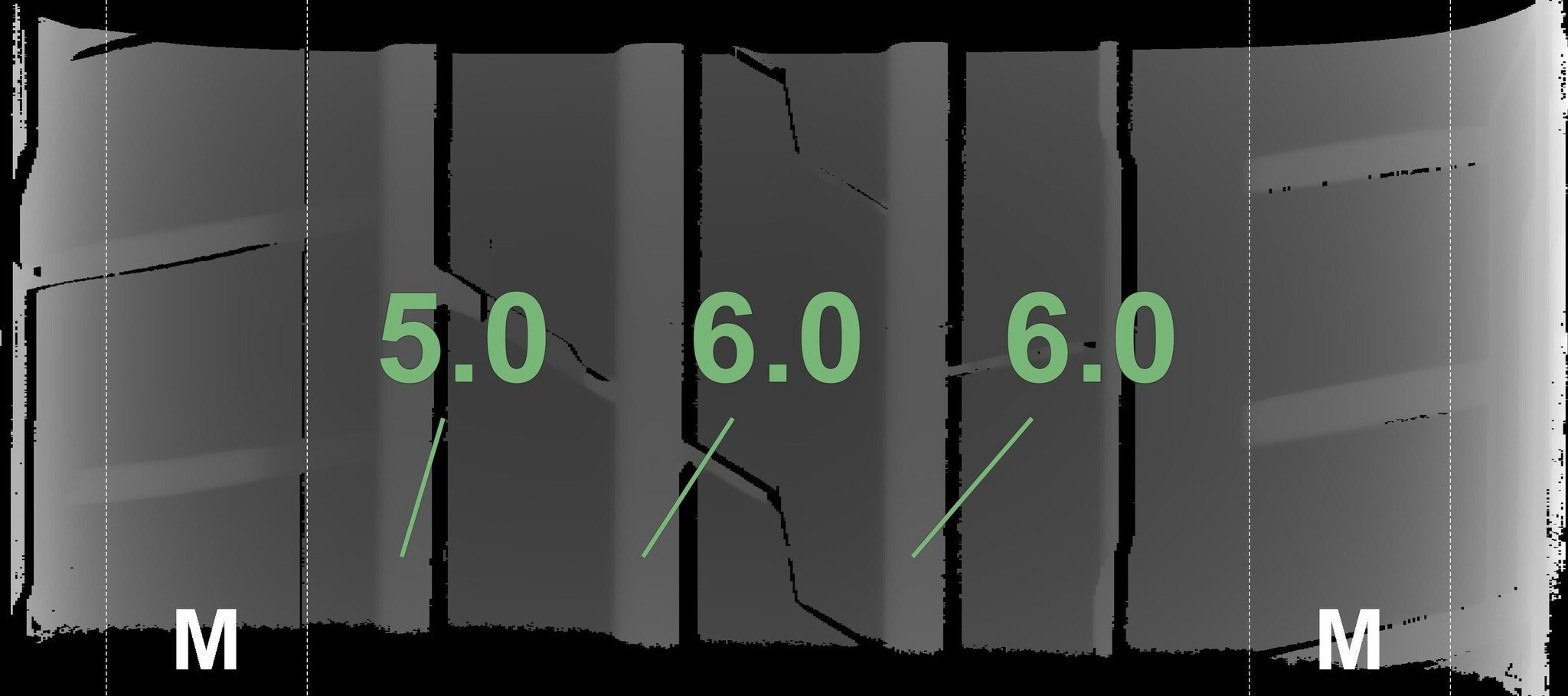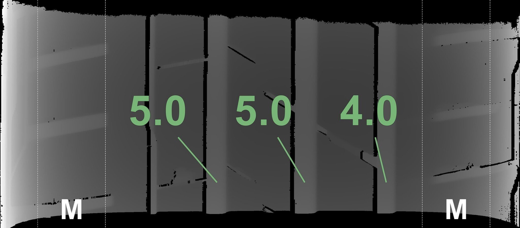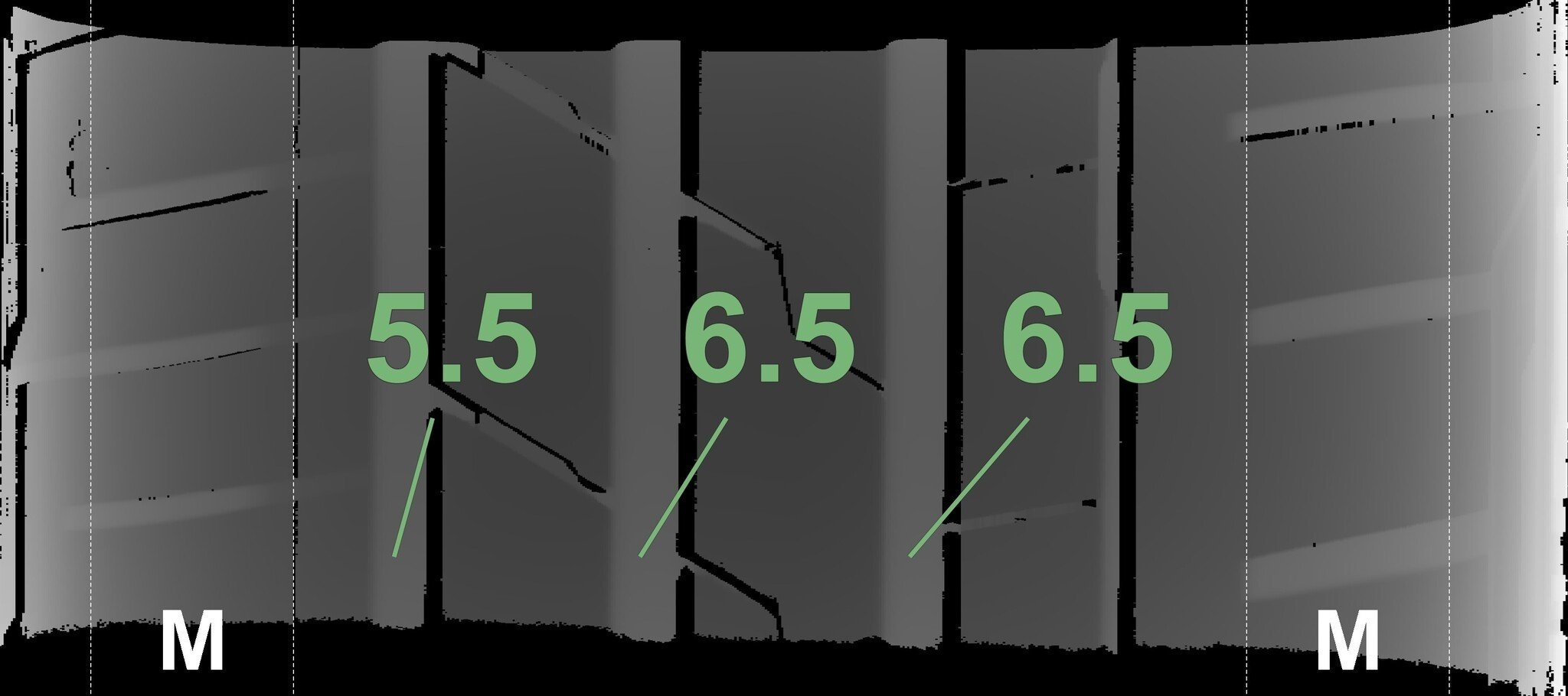 De gemeten profieldieptes en de details van de velgen zijn hierboven weergegeven.