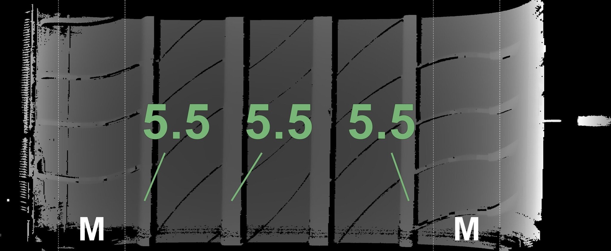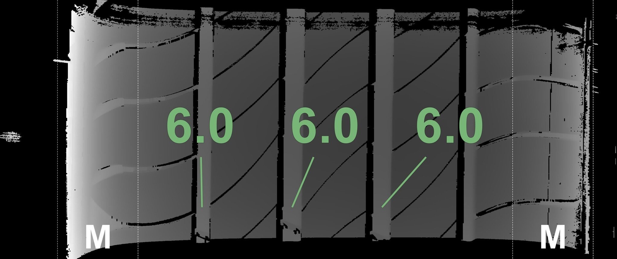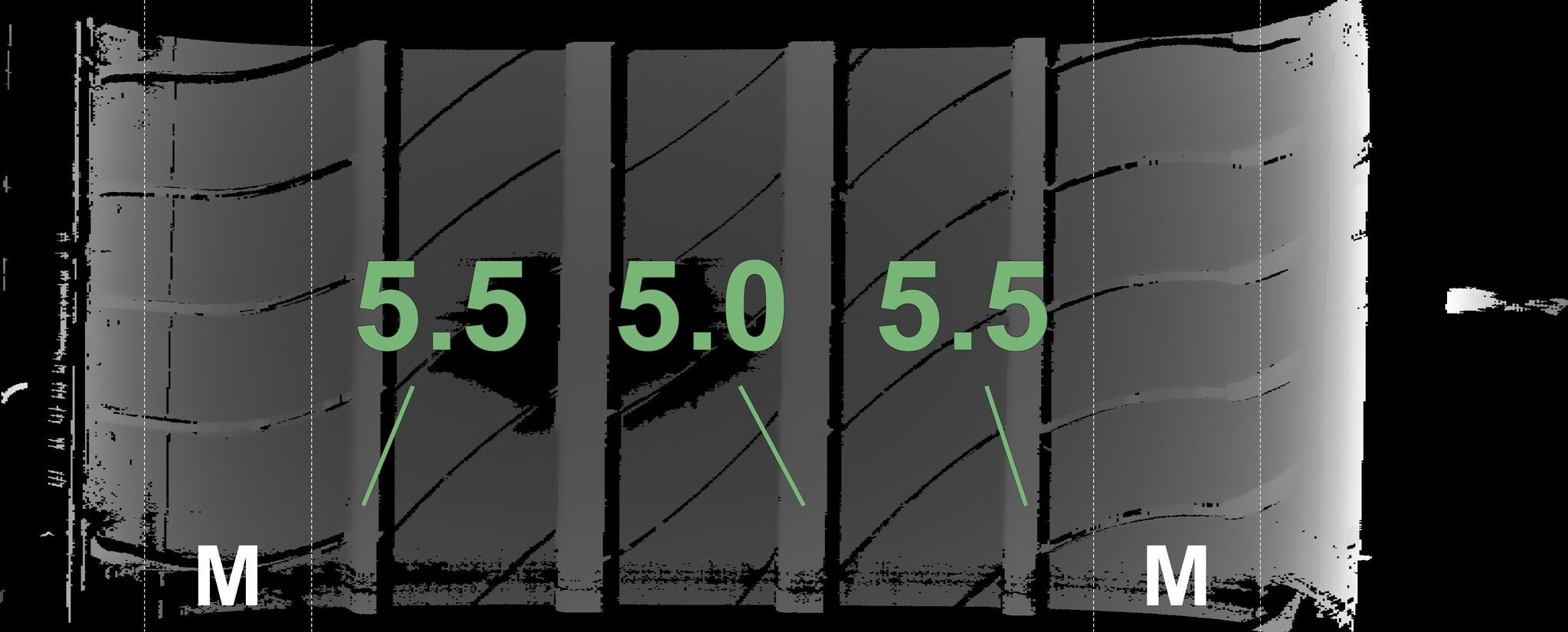 De gemeten profieldieptes en de details van de velgen zijn hierboven weergegeven.