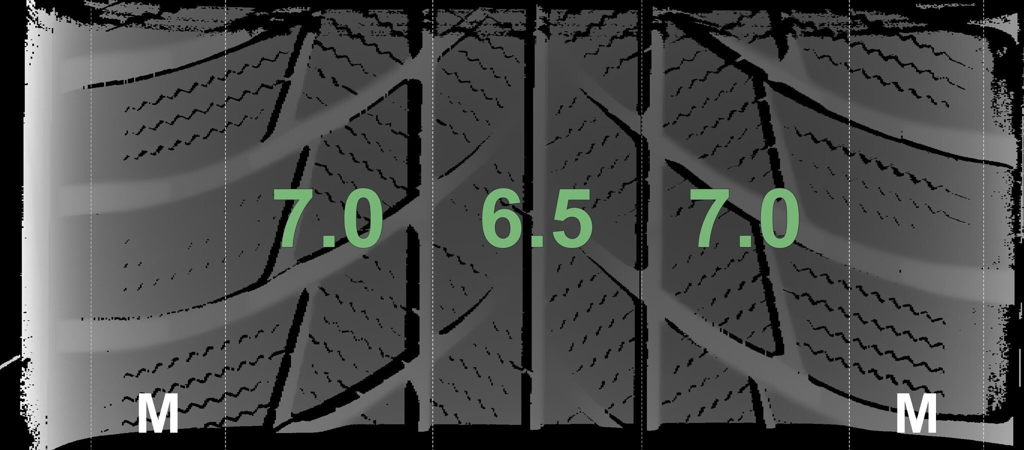 De gemeten profieldieptes en de details van de velgen zijn hierboven weergegeven.