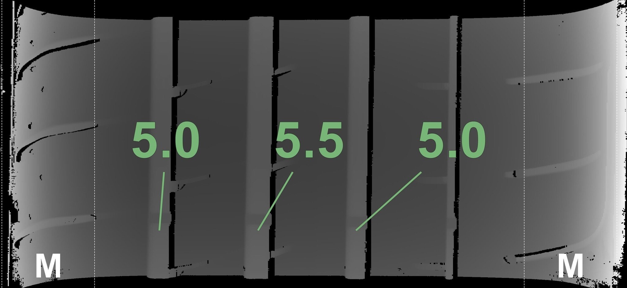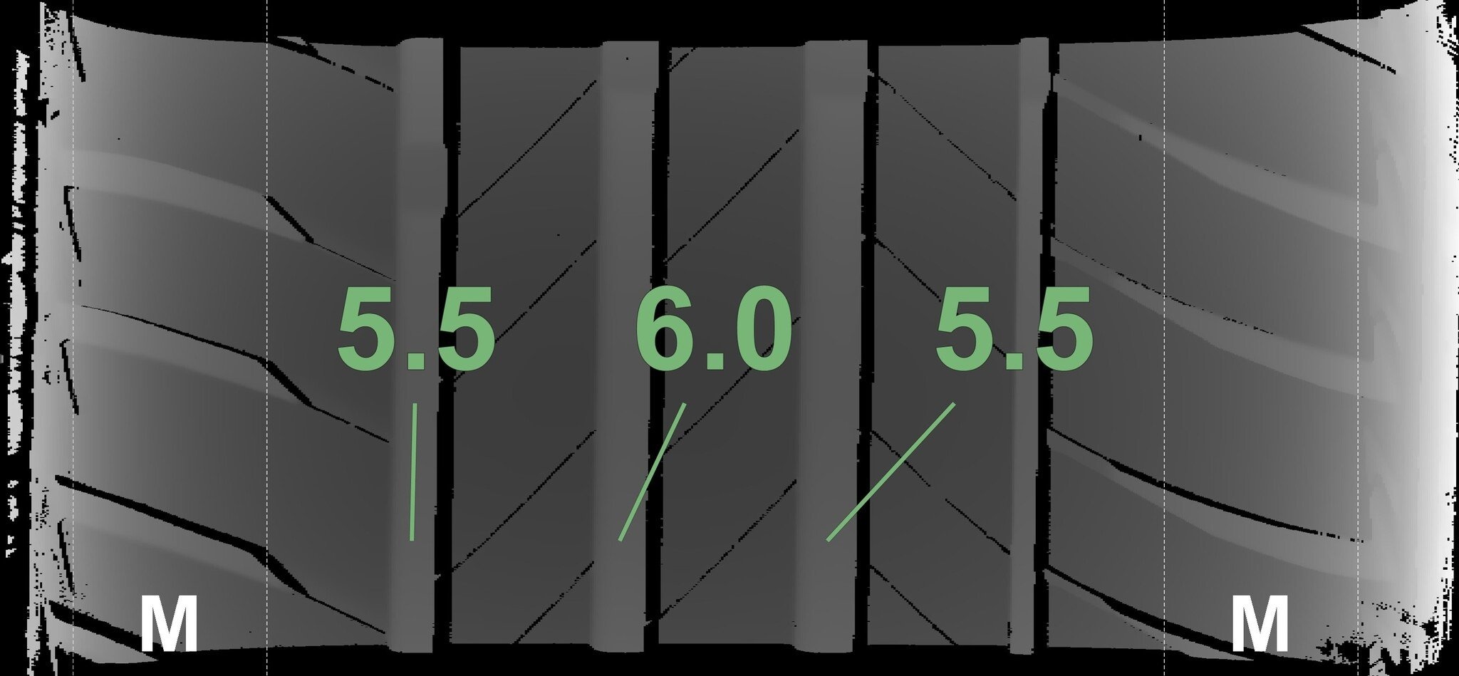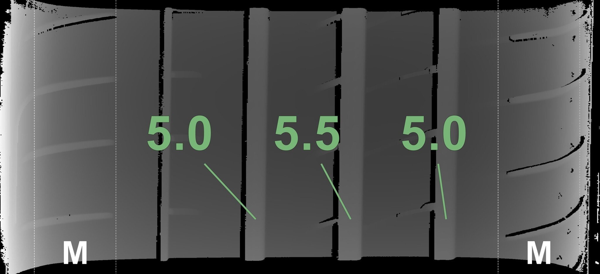 De gemeten profieldieptes en de details van de velgen zijn hierboven weergegeven.