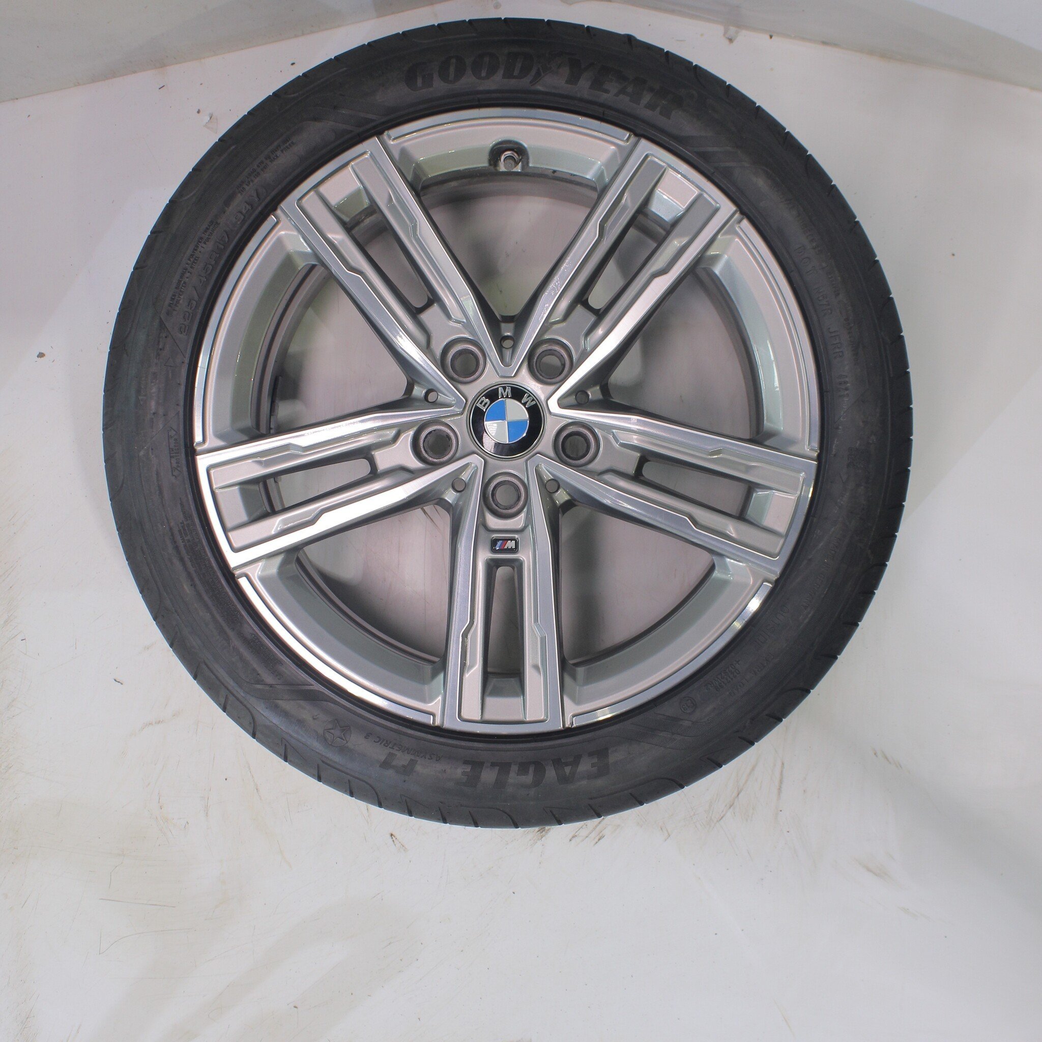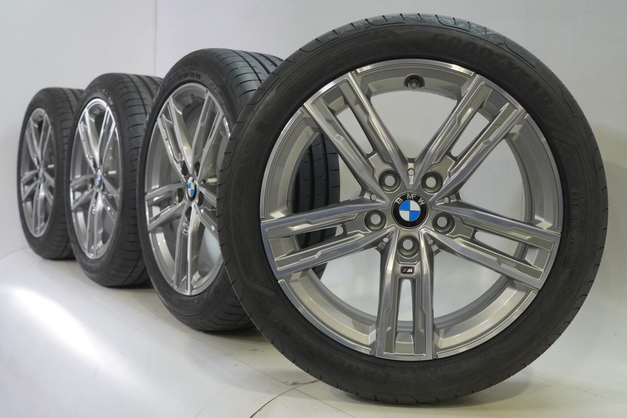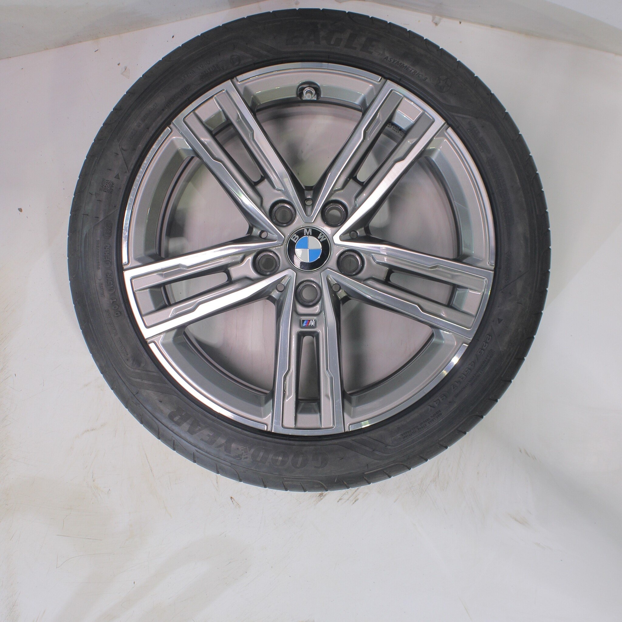 Originele wielset van BMW, styling 550M, 17 inch velgen met Goodyear Eagle F1 Asymmetric 3 Zomerbanden. Deze velgen zijn originele velgen van het merk BMW en geschikt voor: BMW 1 2 serie F40 F44 2 serie Gran Coupe.
