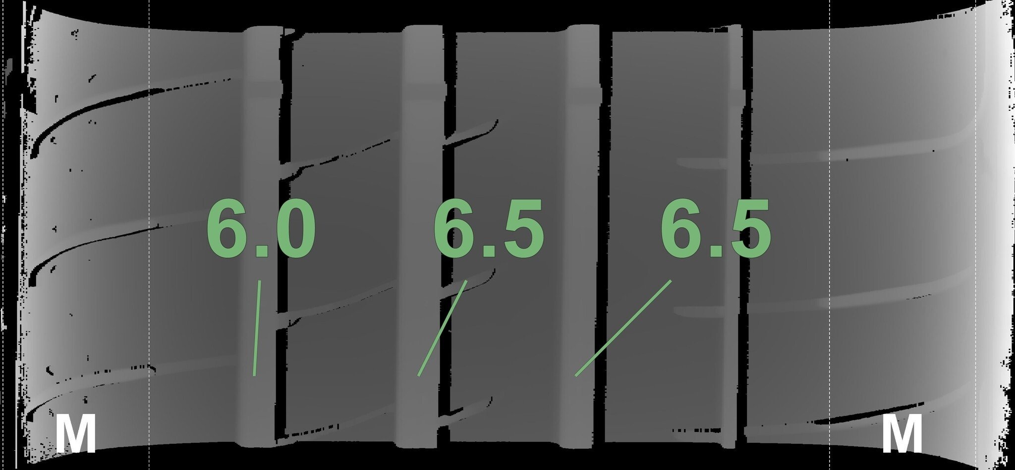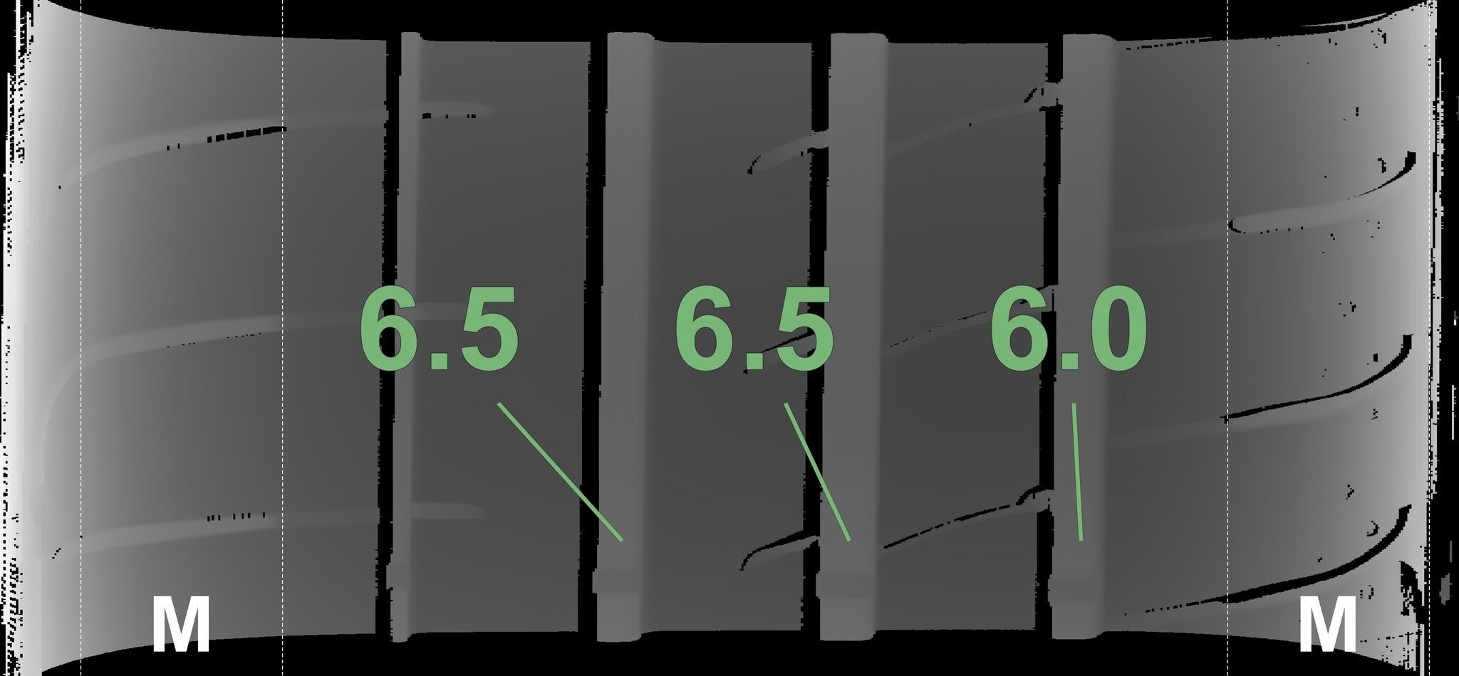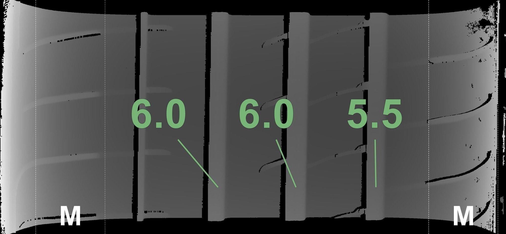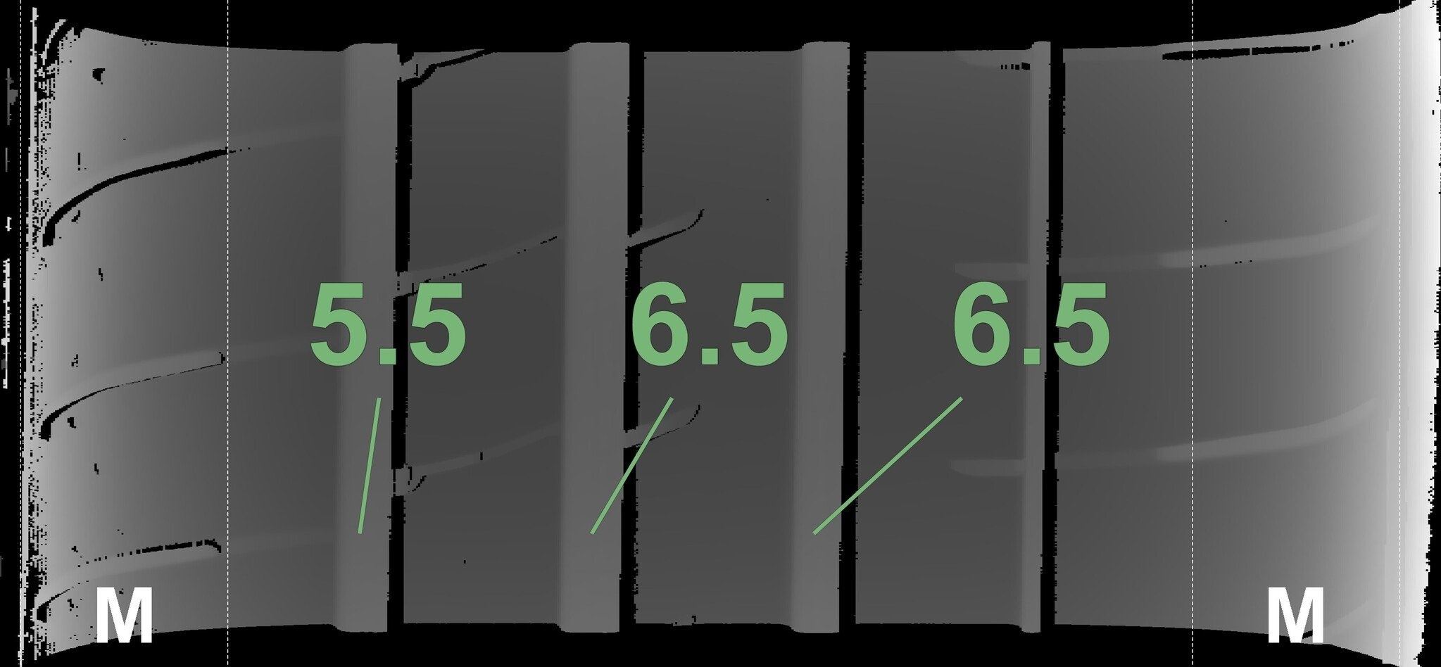 De gemeten profieldieptes en de details van de velgen zijn hierboven weergegeven.