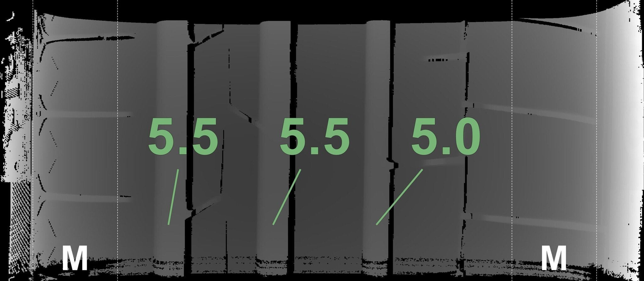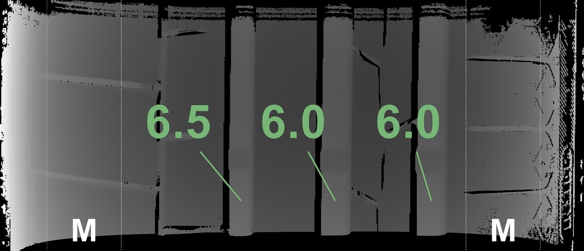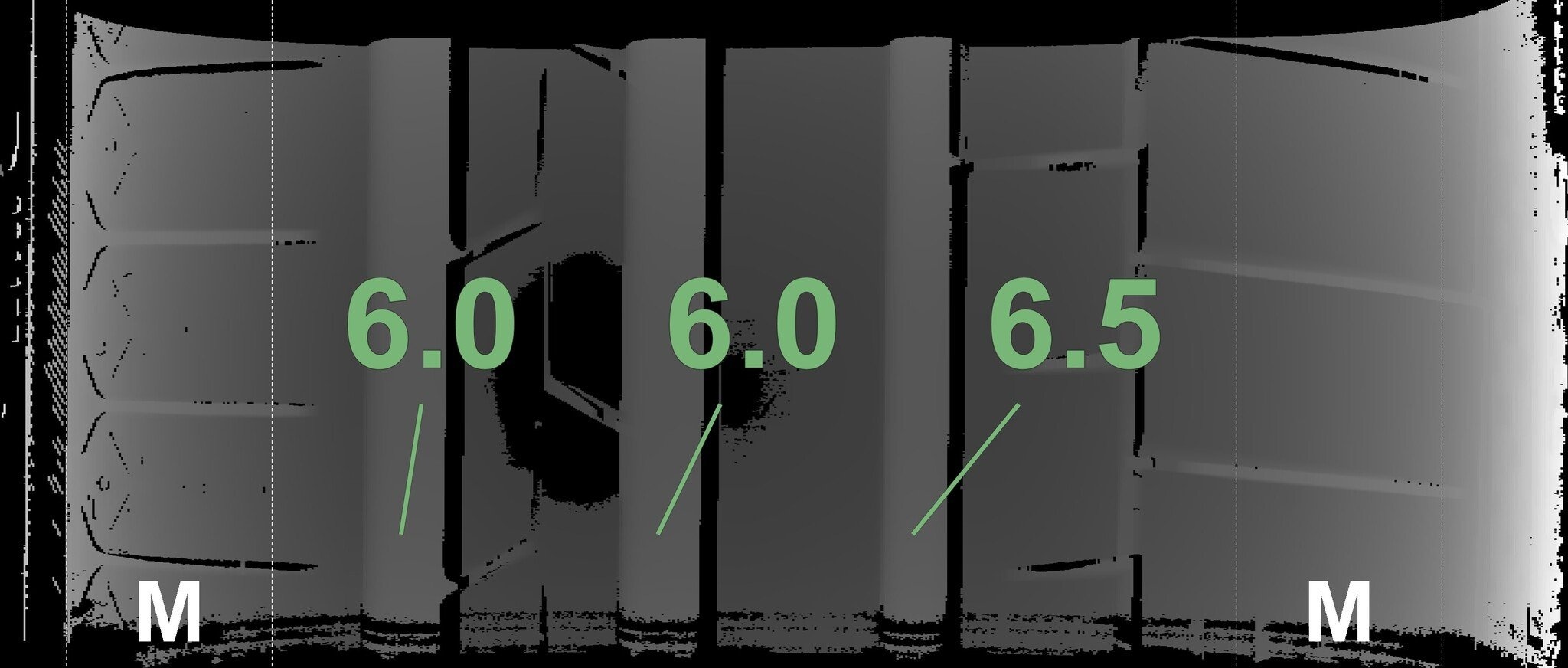 De gemeten profieldieptes en de details van de velgen zijn hierboven weergegeven.