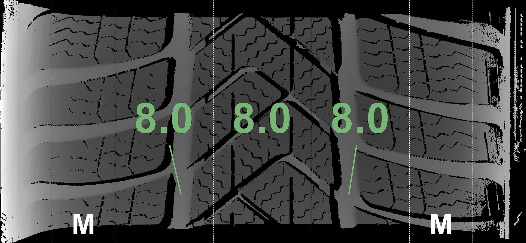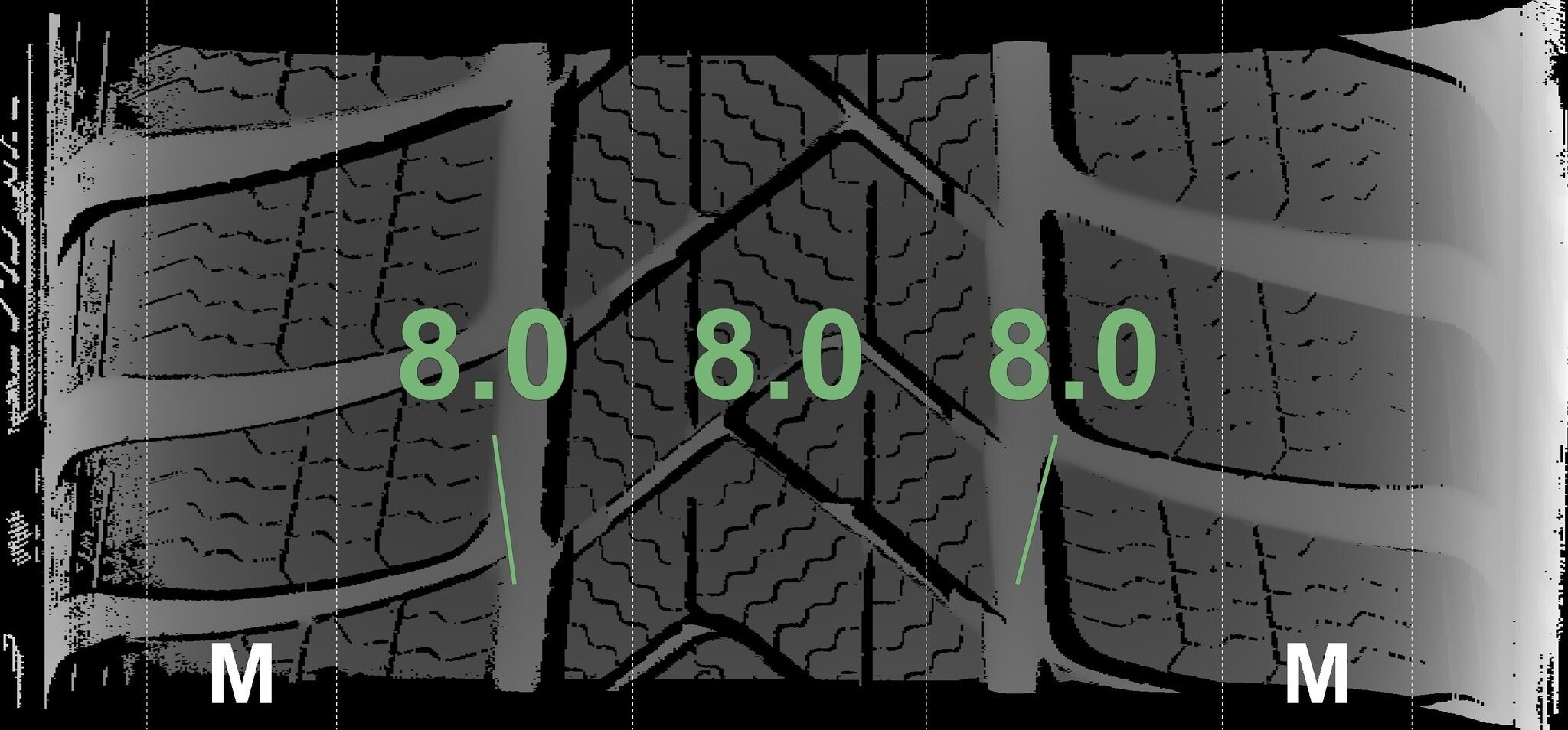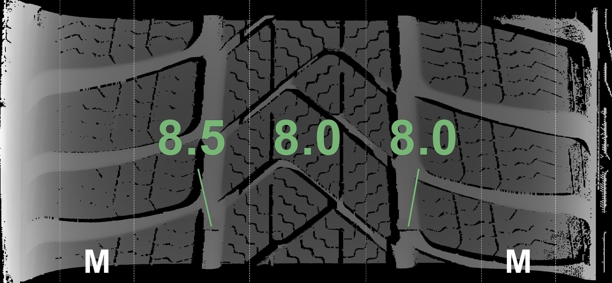 De gemeten profieldieptes en de details van de velgen zijn hierboven weergegeven.