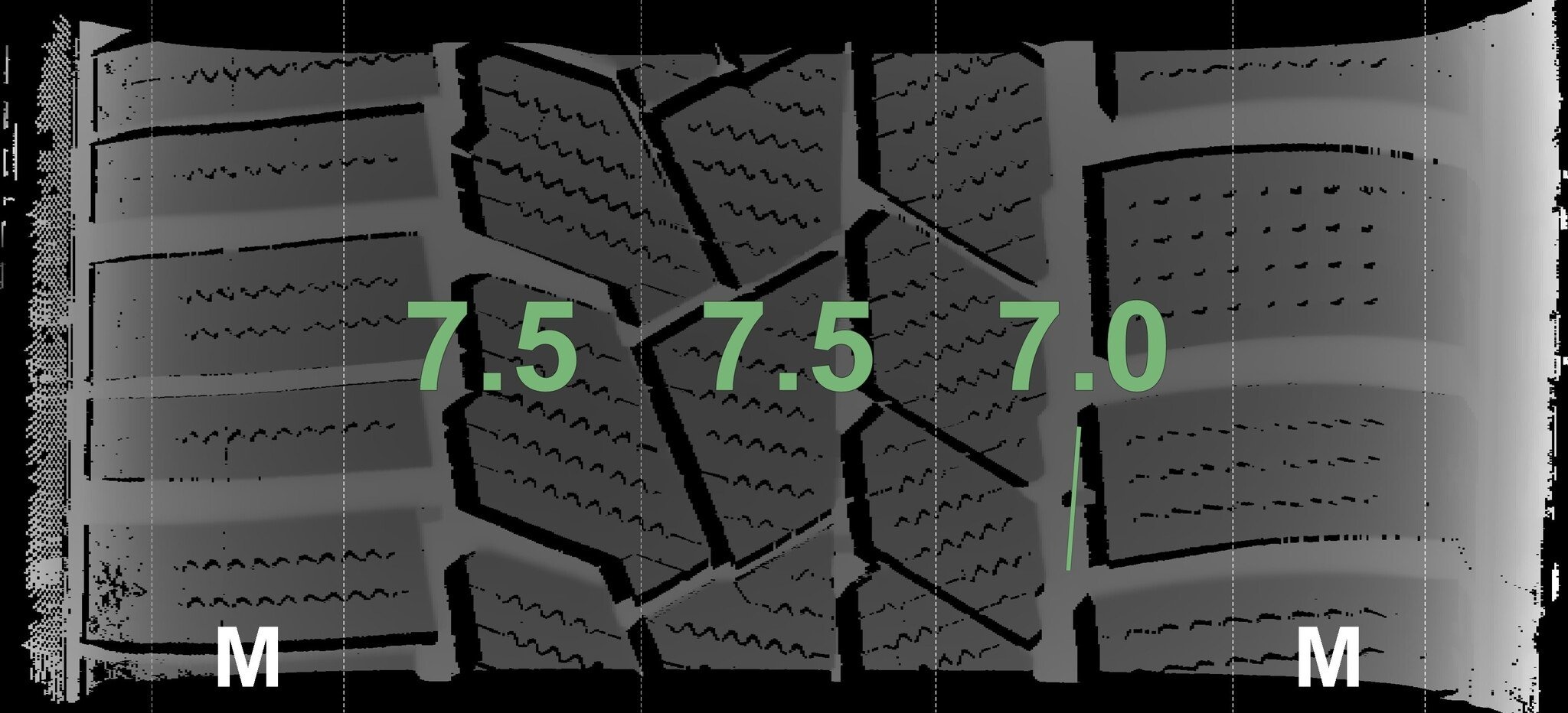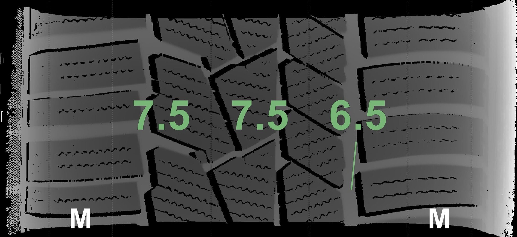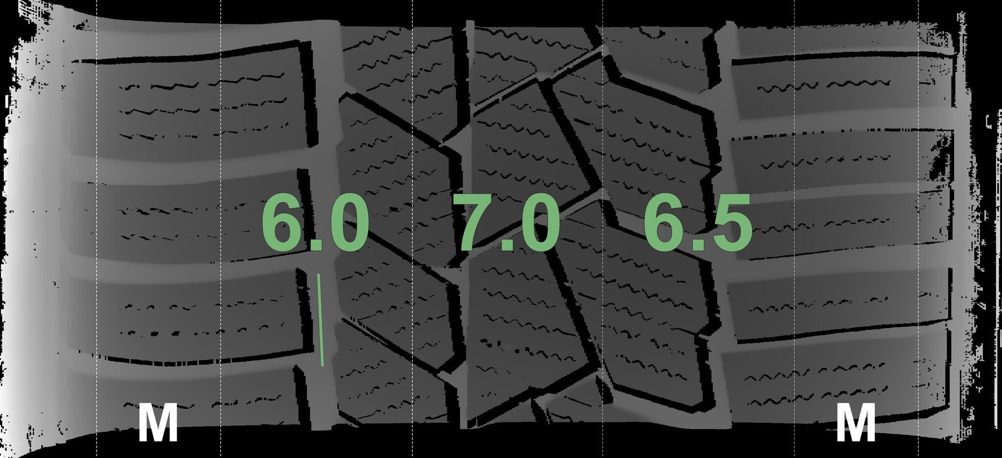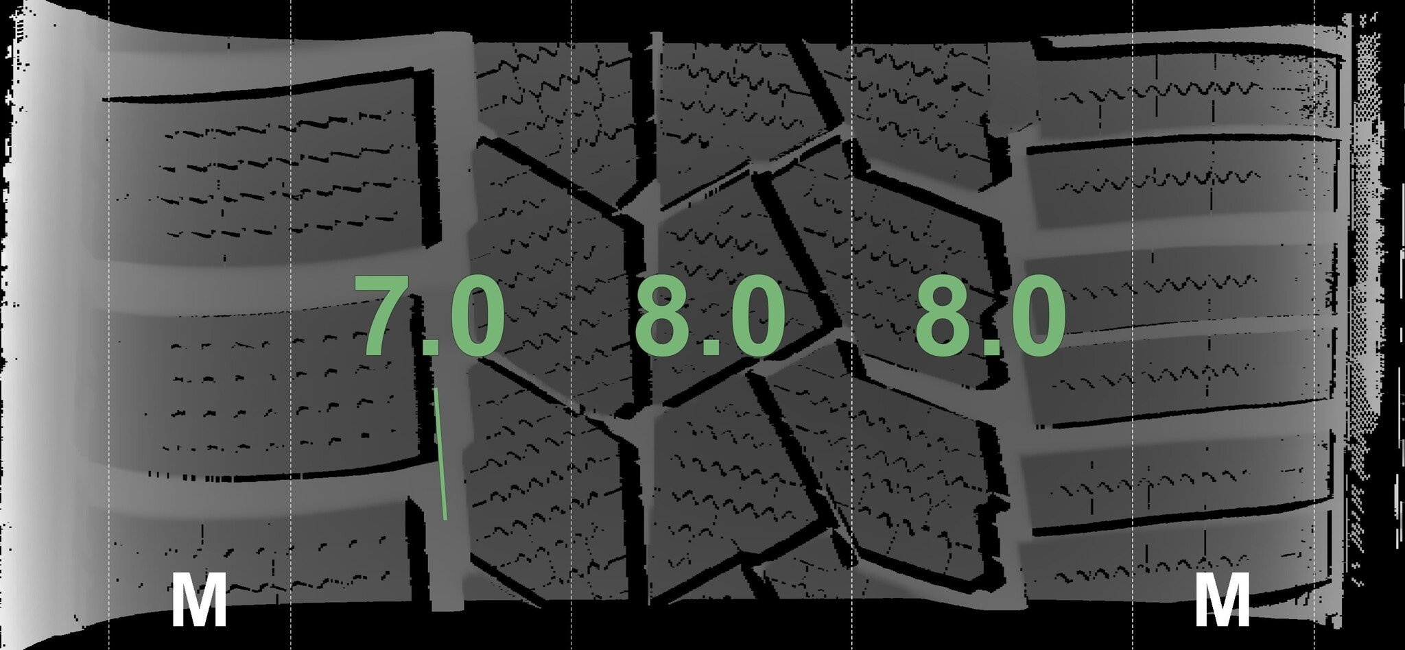 De gemeten profieldieptes en de details van de velgen zijn hierboven weergegeven.