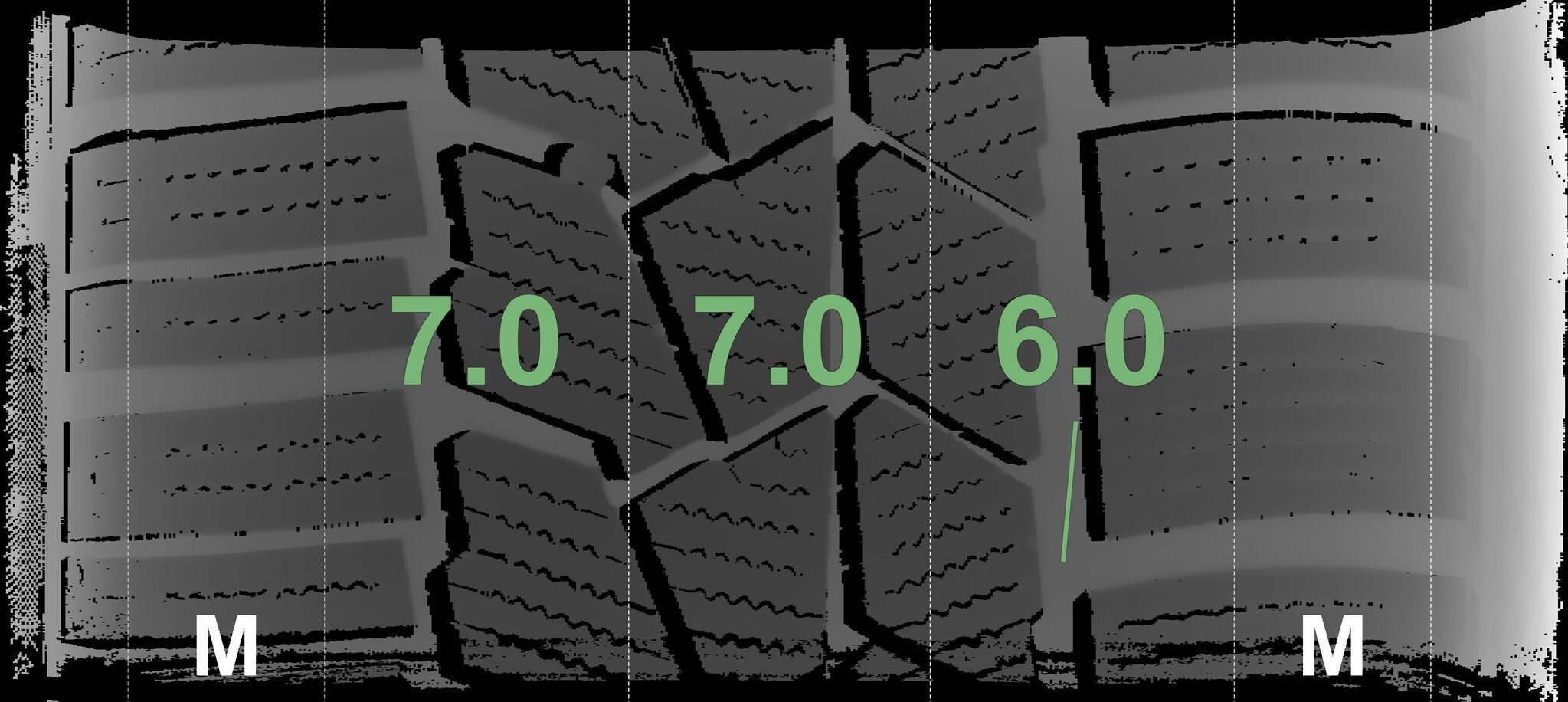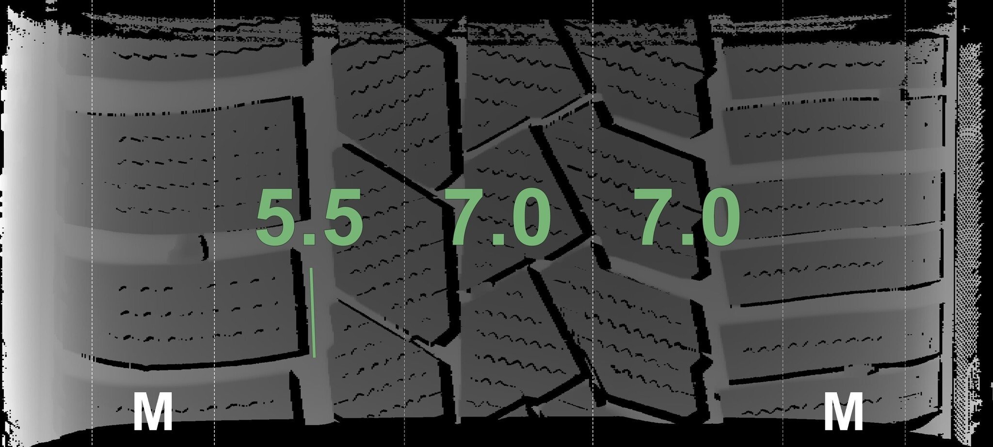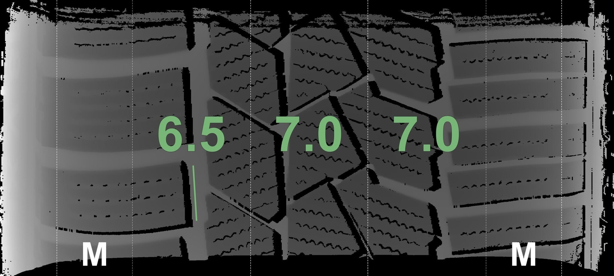 De gemeten profieldieptes en de details van de velgen zijn hierboven weergegeven.