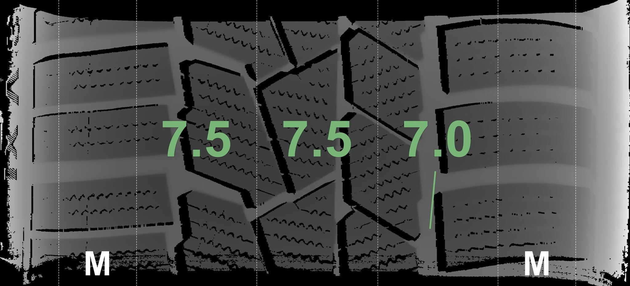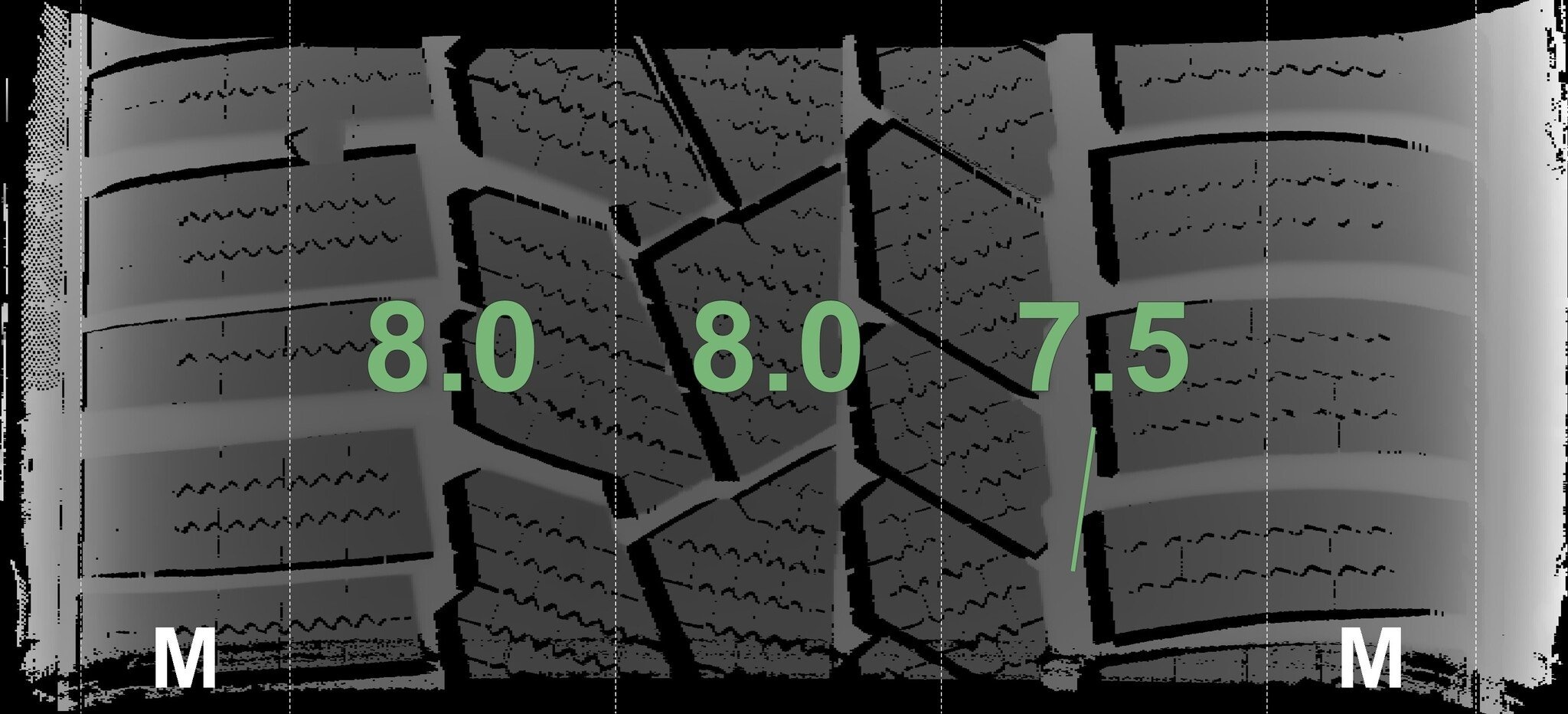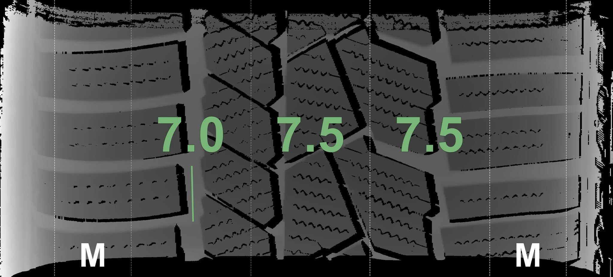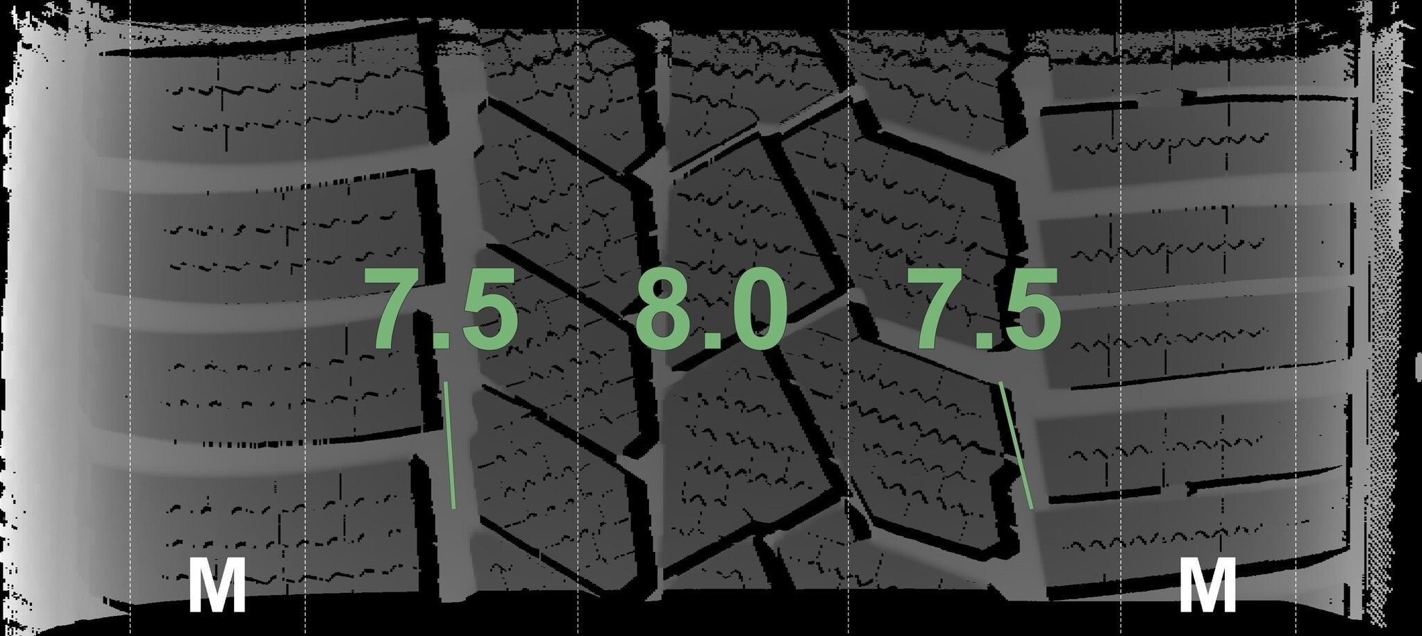 De gemeten profieldieptes en de details van de velgen zijn hierboven weergegeven.
