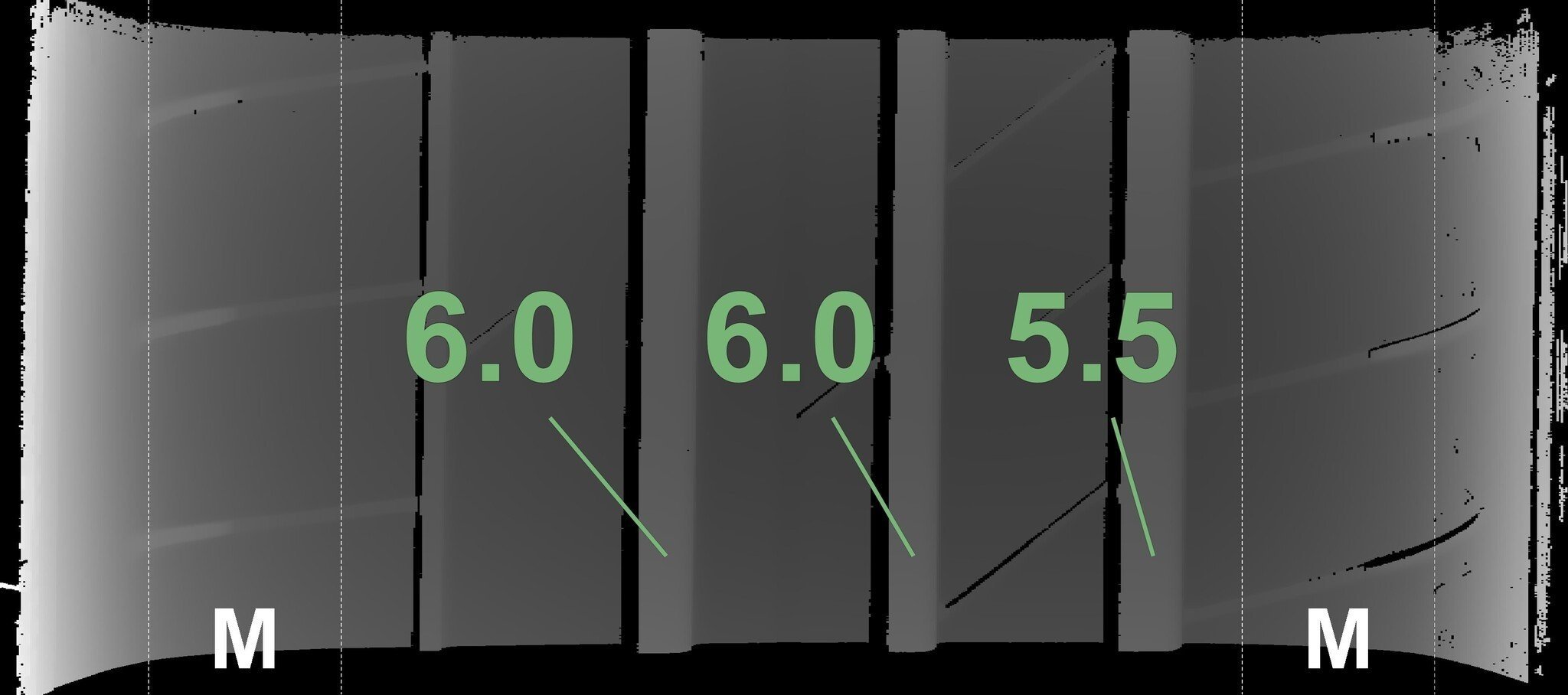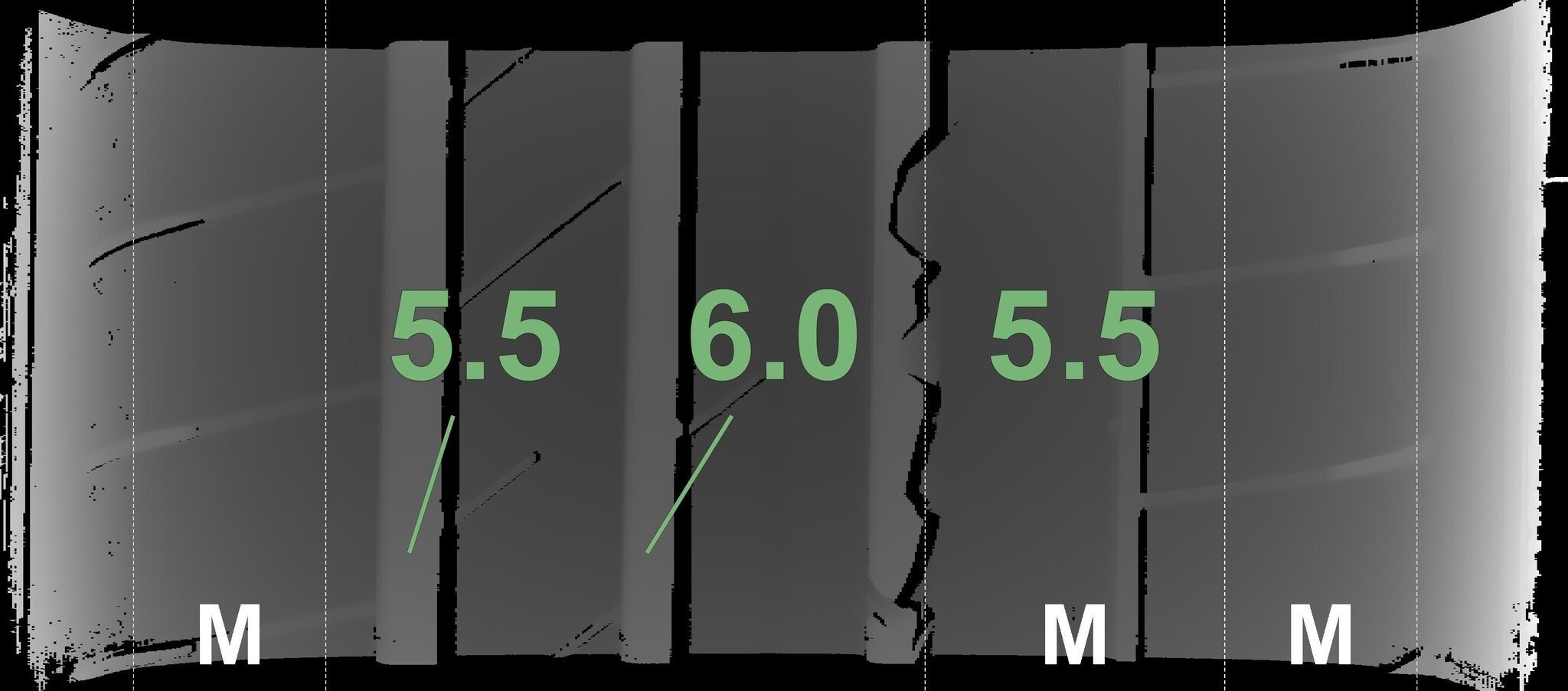 De gemeten profieldieptes en de details van de velgen zijn hierboven weergegeven.
