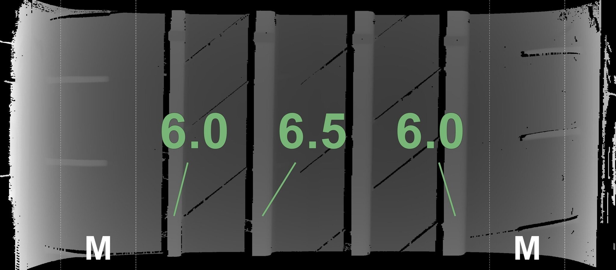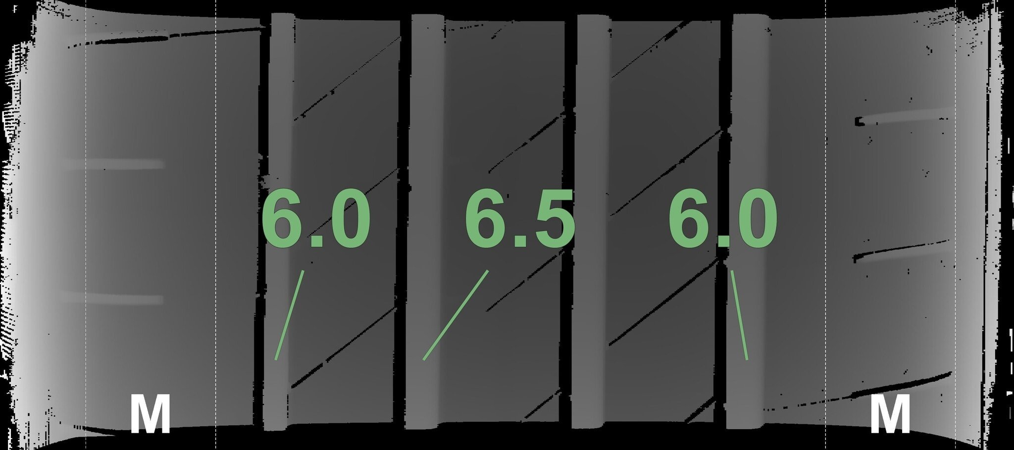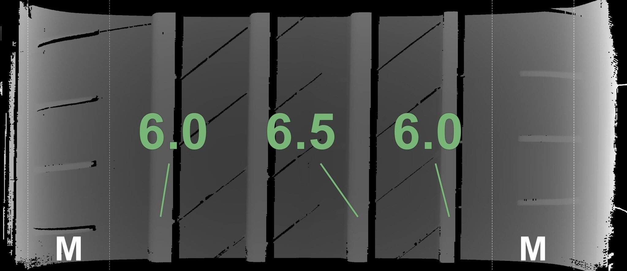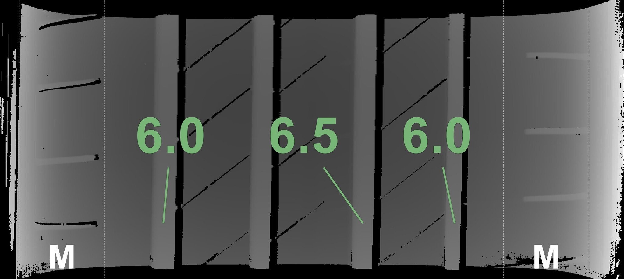 De gemeten profieldieptes en de details van de velgen zijn hierboven weergegeven.