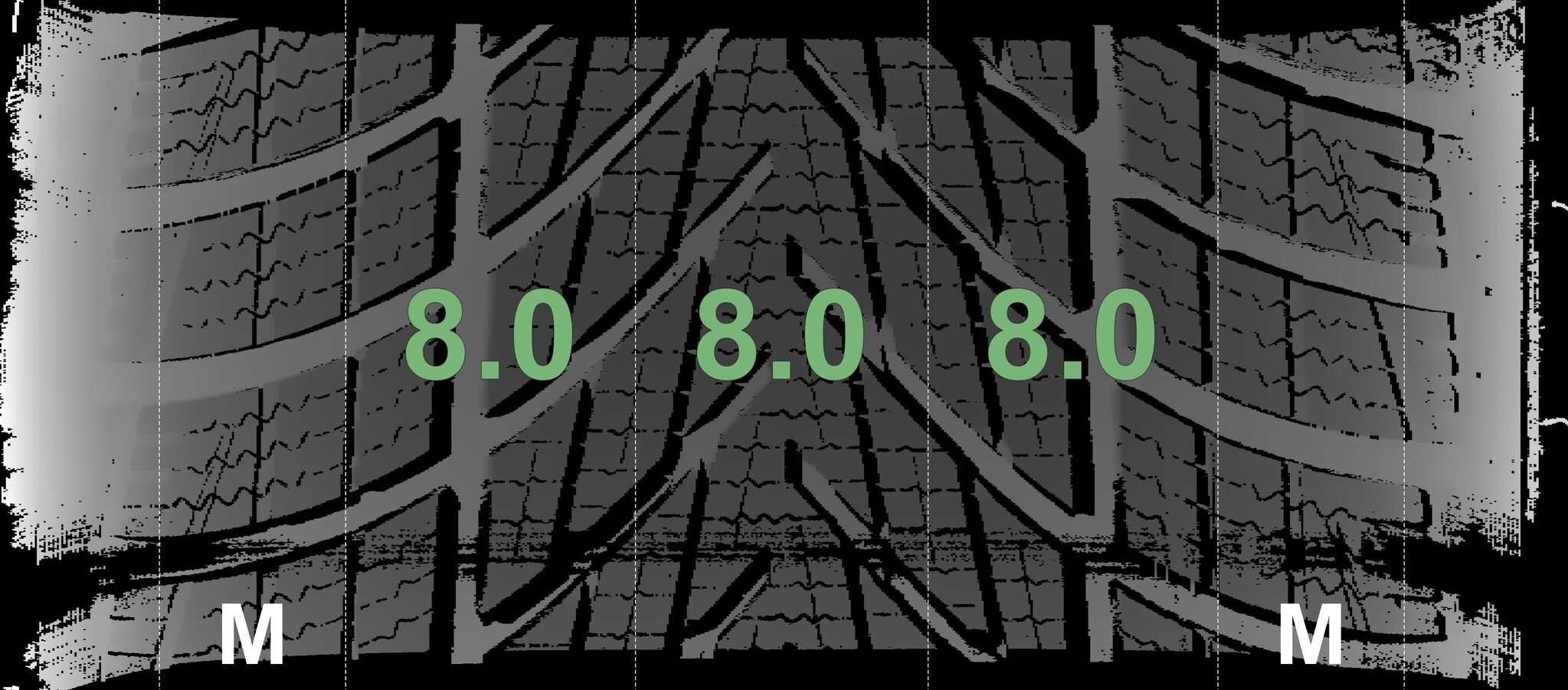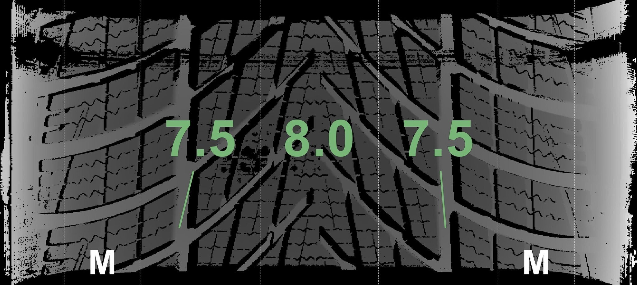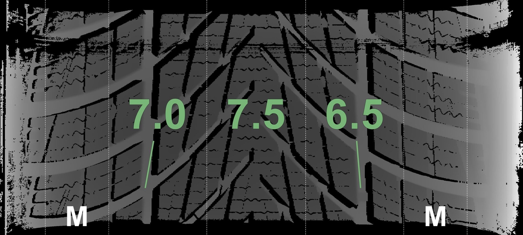 De gemeten profieldieptes en de details van de velgen zijn hierboven weergegeven.